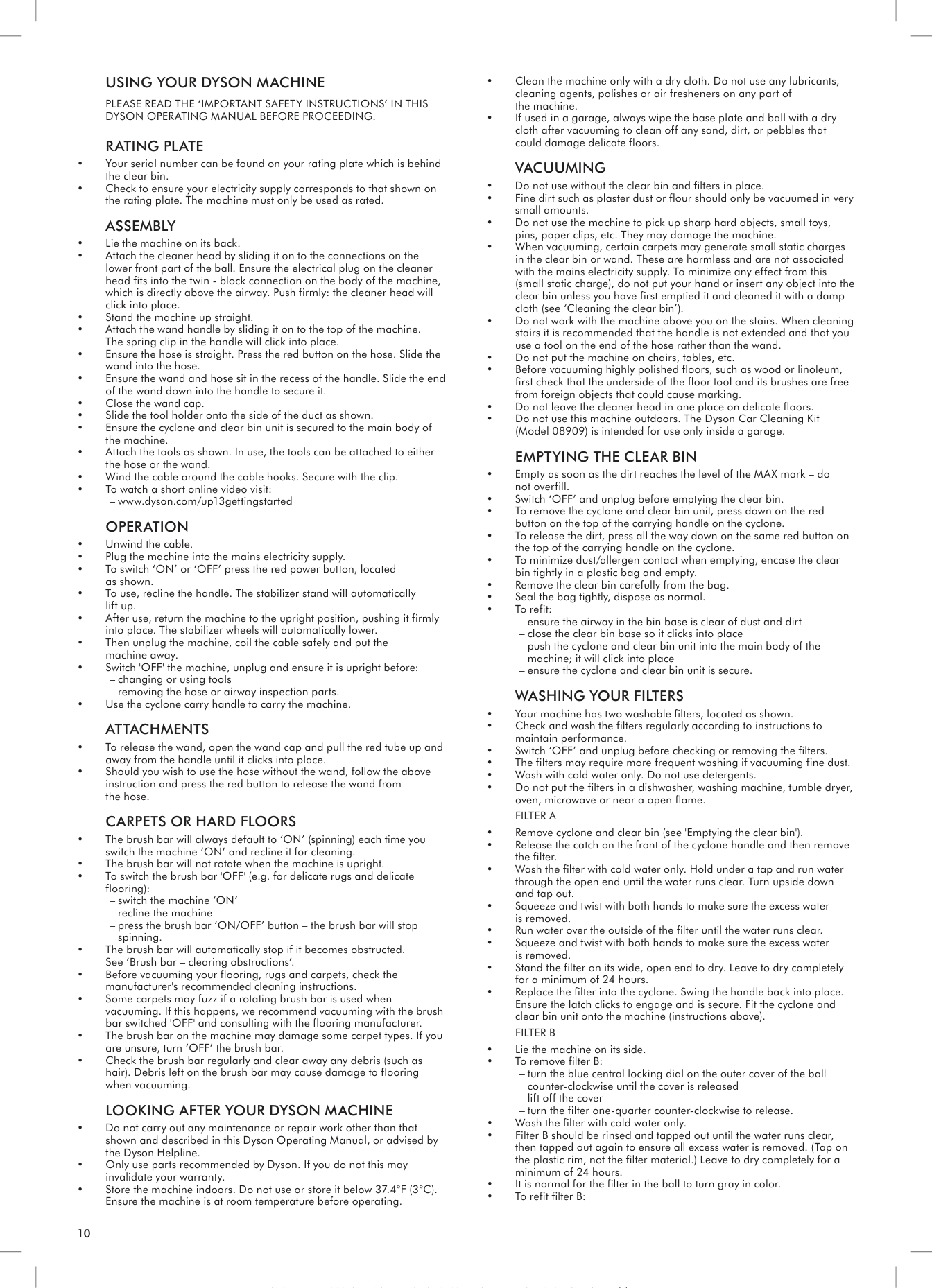 • Do not use without the clear bin and filters in place. • Fine dirt such as plaster dust or flour should only be vacuumed in very small amounts. • Do not use the machine to pick up sharp hard objects, small toys, pins, paper clips, etc. They may damage the machine. • When vacuuming, certain carpets may generate small static charges in the clear bin or wand. These are harmless and are not associated with the mains electricity supply. To minimize any effect from this (small static charge), do not put your hand or insert any object into the clear bin unless you have first emptied it and cleaned it with a damp cloth (see ‘Cleaning the clear bin’). • Do not work with the machine above you on the stairs. When cleaning stairs it is recommended that the handle is not extended and that you use a tool on the end of the hose rather than the wand. • Do not put the machine on chairs, tables, etc. • Before vacuuming highly polished floors, such as wood or linoleum, first check that the underside of the floor tool and its brushes are free from foreign objects that could cause marking. • Do not leave the cleaner head in one place on delicate floors. • Do not use this machine outdoors. The Dyson Car Cleaning Kit (Model 08909) is intended for use only inside a garage. Emptying the clear bin • Empty as soon as the dirt reaches the level of the MAX mark – do not overfill. • Switch ‘OFF’ and unplug before emptying the clear bin. • To remove the cyclone and clear bin unit, press down on the red button on the top of the carrying handle on the cyclone. • To release the dirt, press all the way down on the same red button on the top of the carrying handle on the cyclone. • To minimize dust/allergen contact when emptying, encase the clear bin tightly in a plastic bag and empty. • Remove the clear bin carefully from the bag. • Seal the bag tightly, dispose as normal. • To refit: –– ensure the airway in the bin base is clear of dust and dirt –– close the clear bin base so it clicks into place –– push the cyclone and clear bin unit into the main body of the machine; it will click into place –– ensure the cyclone and clear bin unit is secure.Washing Your Filters
