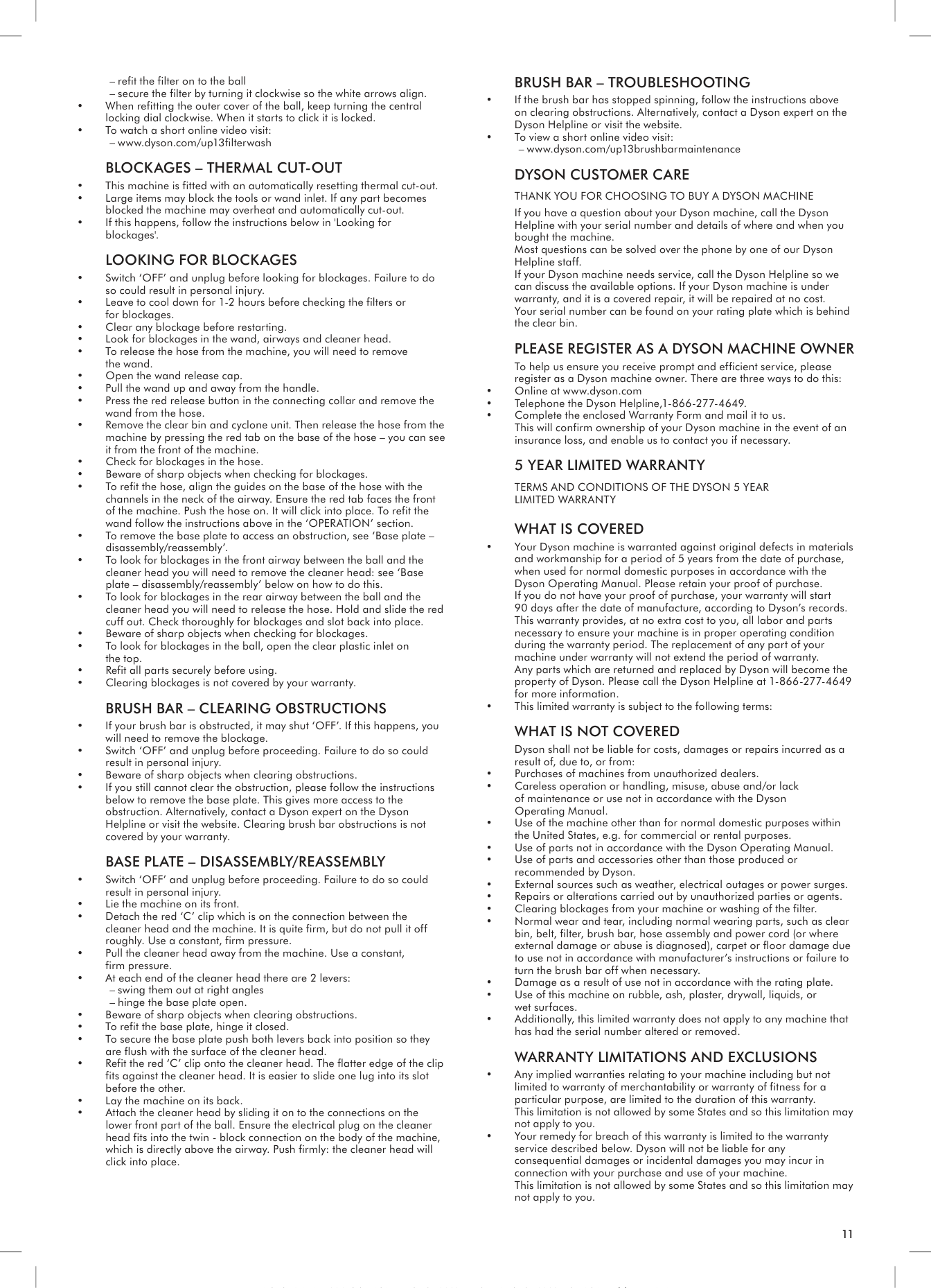 • If the brush bar has stopped spinning, follow the instructions above on clearing obstructions. Alternatively, contact a Dyson expert on the Dyson Helpline or visit the website. • To view a short online video visit: –– www.dyson.com/up13brushbarmaintenanceDyson Customer Care