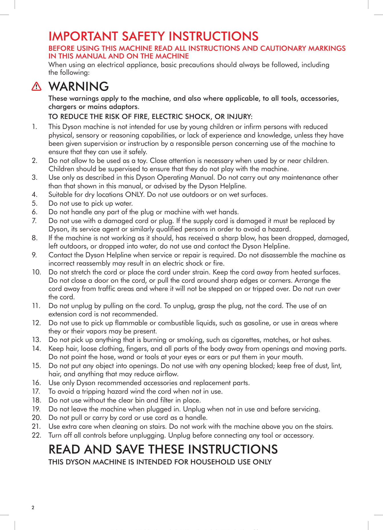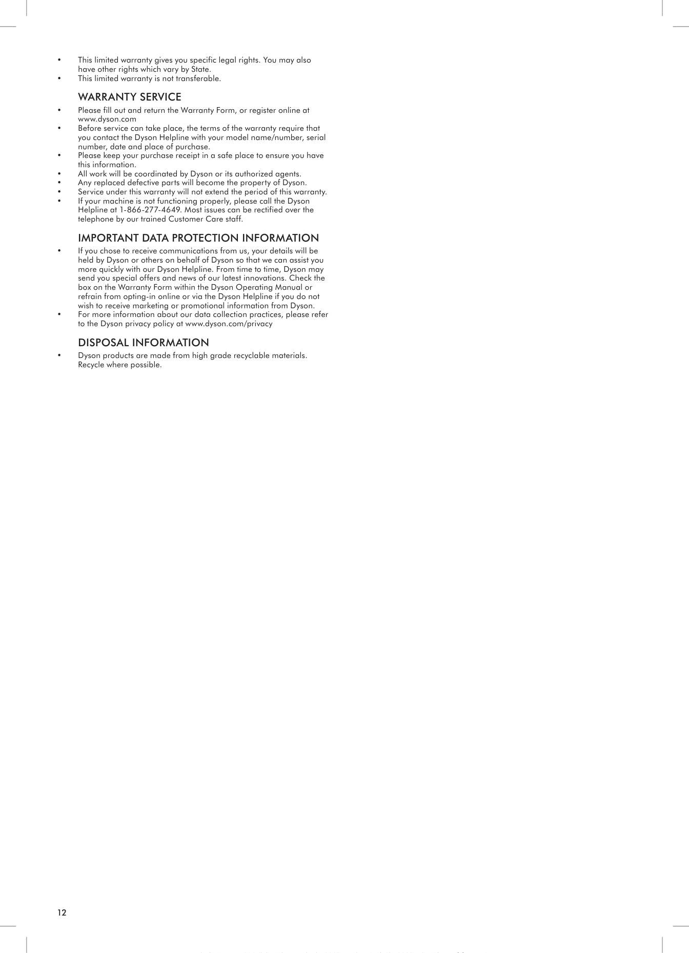 • Please fill out and return the Warranty Form, or register online at www.dyson.com • Before service can take place, the terms of the warranty require that you contact the Dyson Helpline with your model name/number, serial number, date and place of purchase. • Please keep your purchase receipt in a safe place to ensure you have this information. • All work will be coordinated by Dyson or its authorized agents. • Any replaced defective parts will become the property of Dyson. • Service under this warranty will not extend the period of this warranty. • If your machine is not functioning properly, please call the Dyson Helpline at 1-866-277-4649. Most issues can be rectified over the telephone by our trained Customer Care staff.Important Data Protection Information