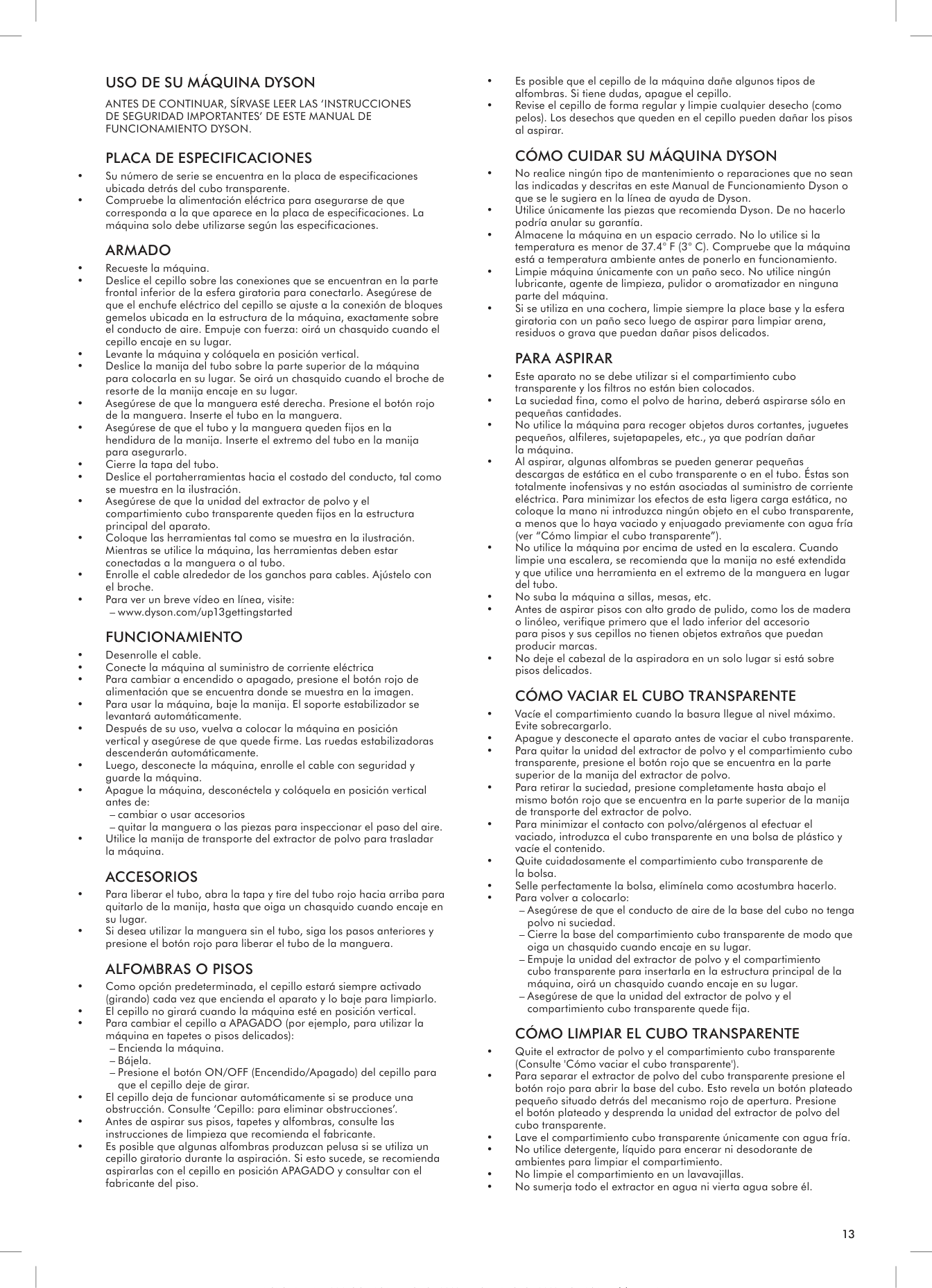 • No realice ningún tipo de mantenimiento o reparaciones que no sean las indicadas y descritas en este Manual de Funcionamiento Dyson o que se le sugiera en la línea de ayuda de Dyson. • Utilice únicamente las piezas que recomienda Dyson. De no hacerlo podría anular su garantía. • Almacene la máquina en un espacio cerrado. No lo utilice si la temperatura es menor de 37.4° F (3° C). Compruebe que la máquina está a temperatura ambiente antes de ponerlo en funcionamiento. • Limpie máquina únicamente con un paño seco. No utilice ningún lubricante, agente de limpieza, pulidor o aromatizador en ninguna parte del máquina. • Si se utiliza en una cochera, limpie siempre la place base y la esfera giratoria con un paño seco luego de aspirar para limpiar arena, residuos o grava que puedan dañar pisos delicados.Para Aspirar