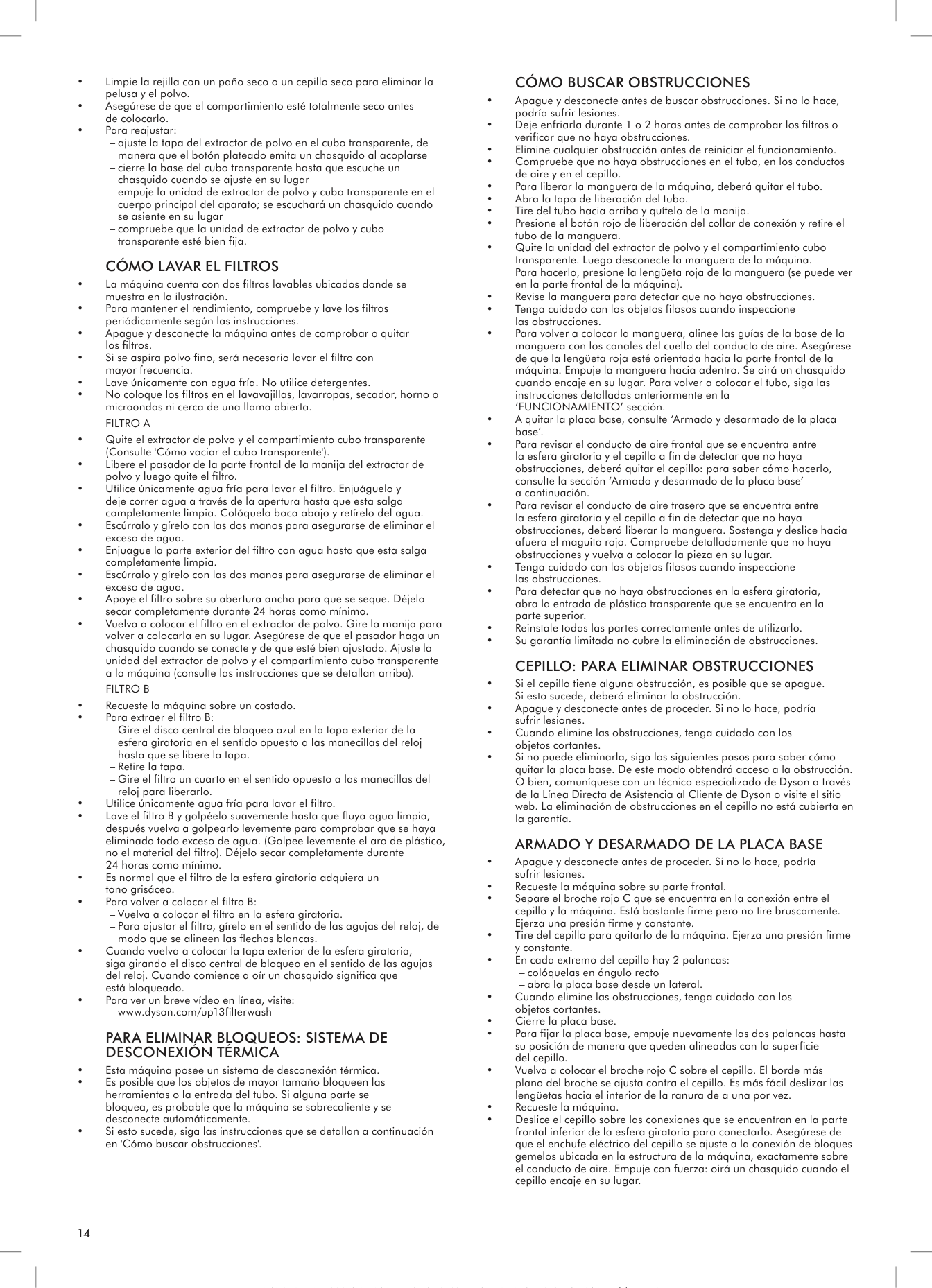 • Esta máquina posee un sistema de desconexión térmica. • Es posible que los objetos de mayor tamaño bloqueen las herramientas o la entrada del tubo. Si alguna parte se bloquea, es probable que la máquina se sobrecaliente y se desconecte automáticamente. • Si esto sucede, siga las instrucciones que se detallan a continuación en 'Cómo buscar obstrucciones'.Cómo buscar obstrucciones • Apague y desconecte antes de buscar obstrucciones. Si no lo hace, podría sufrir lesiones. • Deje enfriarla durante 1 o 2 horas antes de comprobar los filtros o verificar que no haya obstrucciones. • Elimine cualquier obstrucción antes de reiniciar el funcionamiento. • Compruebe que no haya obstrucciones en el tubo, en los conductos de aire y en el cepillo. • Para liberar la manguera de la máquina, deberá quitar el tubo. • Abra la tapa de liberación del tubo. • Tire del tubo hacia arriba y quítelo de la manija. • Presione el botón rojo de liberación del collar de conexión y retire el tubo de la manguera. • Quite la unidad del extractor de polvo y el compartimiento cubo transparente. Luego desconecte la manguera de la máquina. Para hacerlo, presione la lengüeta roja de la manguera (se puede ver en la parte frontal de la máquina). • Revise la manguera para detectar que no haya obstrucciones. • Tenga cuidado con los objetos filosos cuando inspeccione las obstrucciones. • Para volver a colocar la manguera, alinee las guías de la base de la manguera con los canales del cuello del conducto de aire. Asegúrese de que la lengüeta roja esté orientada hacia la parte frontal de la máquina. Empuje la manguera hacia adentro. Se oirá un chasquido cuando encaje en su lugar. Para volver a colocar el tubo, siga las instrucciones detalladas anteriormente en la ‘FUNCIONAMIENTO’ sección. • A quitar la placa base, consulte ‘Armado y desarmado de la placa base’. • Para revisar el conducto de aire frontal que se encuentra entre la esfera giratoria y el cepillo a fin de detectar que no haya obstrucciones, deberá quitar el cepillo: para saber cómo hacerlo, consulte la sección ‘Armado y desarmado de la placa base’ a continuación. • Para revisar el conducto de aire trasero que se encuentra entre la esfera giratoria y el cepillo a fin de detectar que no haya obstrucciones, deberá liberar la manguera. Sostenga y deslice hacia afuera el maguito rojo. Compruebe detalladamente que no haya obstrucciones y vuelva a colocar la pieza en su lugar. • Tenga cuidado con los objetos filosos cuando inspeccione las obstrucciones. • Para detectar que no haya obstrucciones en la esfera giratoria, abra la entrada de plástico transparente que se encuentra en la parte superior. • Reinstale todas las partes correctamente antes de utilizarlo. • Su garantía limitada no cubre la eliminación de obstrucciones. Cepillo: para eliminar obstrucciones • Si el cepillo tiene alguna obstrucción, es posible que se apague. Si esto sucede, deberá eliminar la obstrucción. • Apague y desconecte antes de proceder. Si no lo hace, podría sufrir lesiones. • Cuando elimine las obstrucciones, tenga cuidado con los objetos cortantes. • Si no puede eliminarla, siga los siguientes pasos para saber cómo quitar la placa base. De este modo obtendrá acceso a la obstrucción. O bien, comuníquese con un técnico especializado de Dyson a través de la Línea Directa de Asistencia al Cliente de Dyson o visite el sitio web. La eliminación de obstrucciones en el cepillo no está cubierta en la garantía. Armado y desarmado de la placa base • Apague y desconecte antes de proceder. Si no lo hace, podría sufrir lesiones. • Recueste la máquina sobre su parte frontal. • Separe el broche rojo C que se encuentra en la conexión entre el cepillo y la máquina. Está bastante firme pero no tire bruscamente. Ejerza una presión firme y constante. • Tire del cepillo para quitarlo de la máquina. Ejerza una presión firme y constante. • En cada extremo del cepillo hay 2 palancas: –– colóquelas en ángulo recto –– abra la placa base desde un lateral. • Cuando elimine las obstrucciones, tenga cuidado con los objetos cortantes. • Cierre la placa base. • Para fijar la placa base, empuje nuevamente las dos palancas hasta su posición de manera que queden alineadas con la superficie del cepillo. • Vuelva a colocar el broche rojo C sobre el cepillo. El borde más plano del broche se ajusta contra el cepillo. Es más fácil deslizar las lengüetas hacia el interior de la ranura de a una por vez. • Recueste la máquina. • Deslice el cepillo sobre las conexiones que se encuentran en la parte frontal inferior de la esfera giratoria para conectarlo. Asegúrese de que el enchufe eléctrico del cepillo se ajuste a la conexión de bloques gemelos ubicada en la estructura de la máquina, exactamente sobre el conducto de aire. Empuje con fuerza: oirá un chasquido cuando el cepillo encaje en su lugar. dd