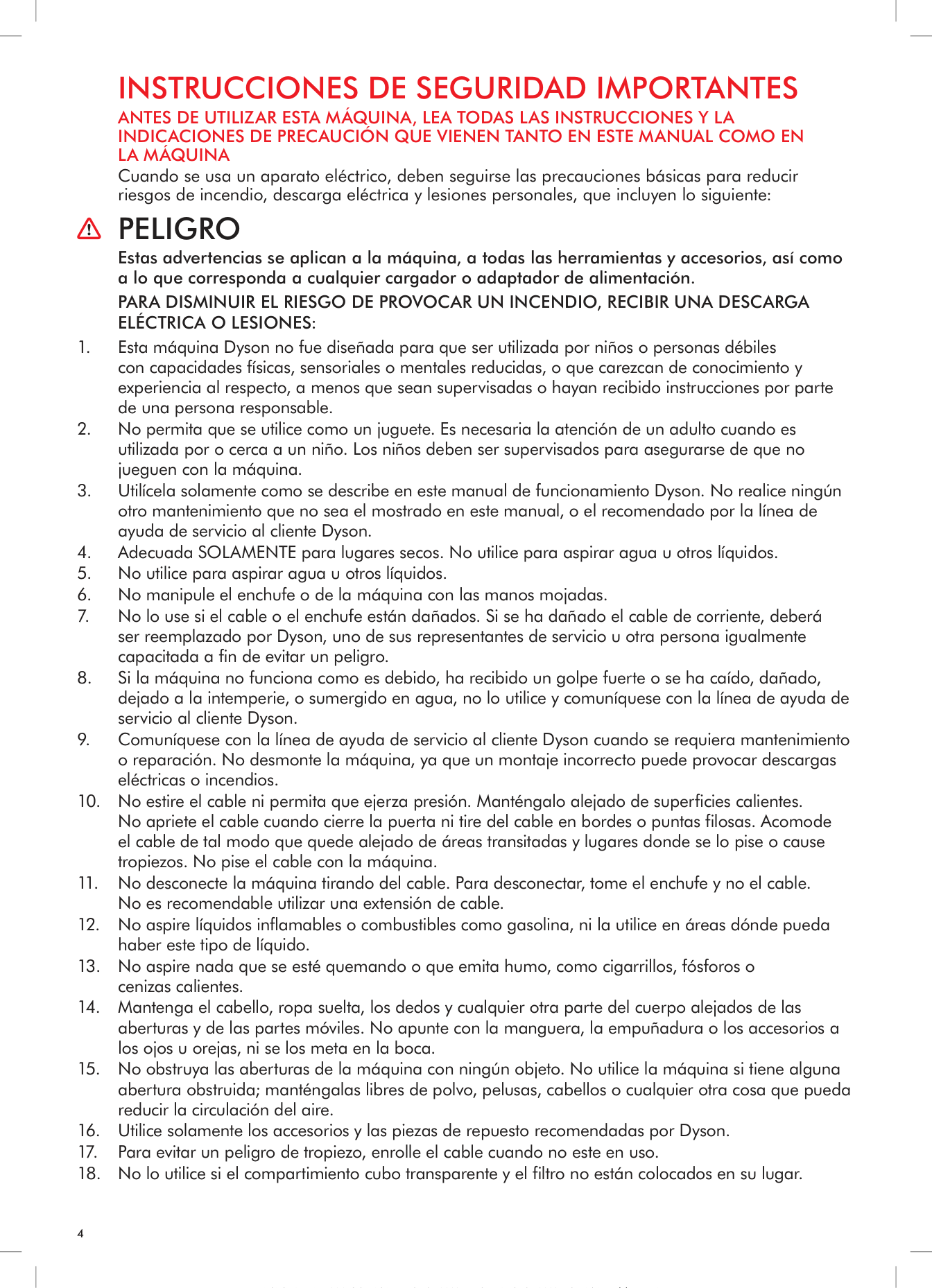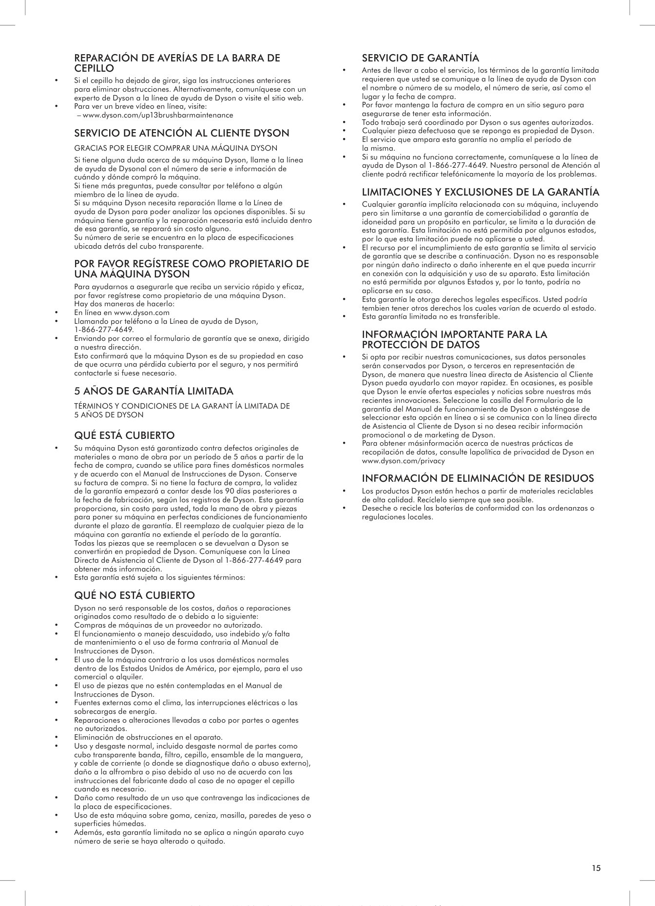 Dyson no será responsable de los costos, daños o reparaciones originados como resultado de o debido a lo siguiente: • Compras de máquinas de un proveedor no autorizado. • El funcionamiento o manejo descuidado, uso indebido y/o falta de mantenimiento o el uso de forma contraria al Manual de Instrucciones de Dyson. • El uso de la máquina contrario a los usos domésticos normales dentro de los Estados Unidos de América, por ejemplo, para el uso comercial o alquiler. • El uso de piezas que no estén contempladas en el Manual de Instrucciones de Dyson. • Fuentes externas como el clima, las interrupciones eléctricas o las sobrecargas de energía. • Reparaciones o alteraciones llevadas a cabo por partes o agentes no autorizados. • Eliminación de obstrucciones en el aparato. • Uso y desgaste normal, incluido desgaste normal de partes como cubo transparente banda, filtro, cepillo, ensamble de la manguera, y cable de corriente (o donde se diagnostique daño o abuso externo), daño a la alfrombra o piso debido al uso no de acuerdo con las instrucciones del fabricante dado al caso de no apager el cepillo cuando es necesario. • Daño como resultado de un uso que contravenga las indicaciones de la placa de especificaciones. • Uso de esta máquina sobre goma, ceniza, masilla, paredes de yeso o superficies húmedas. • Además, esta garantía limitada no se aplica a ningún aparato cuyo número de serie se haya alterado o quitado.Servicio De Garantía