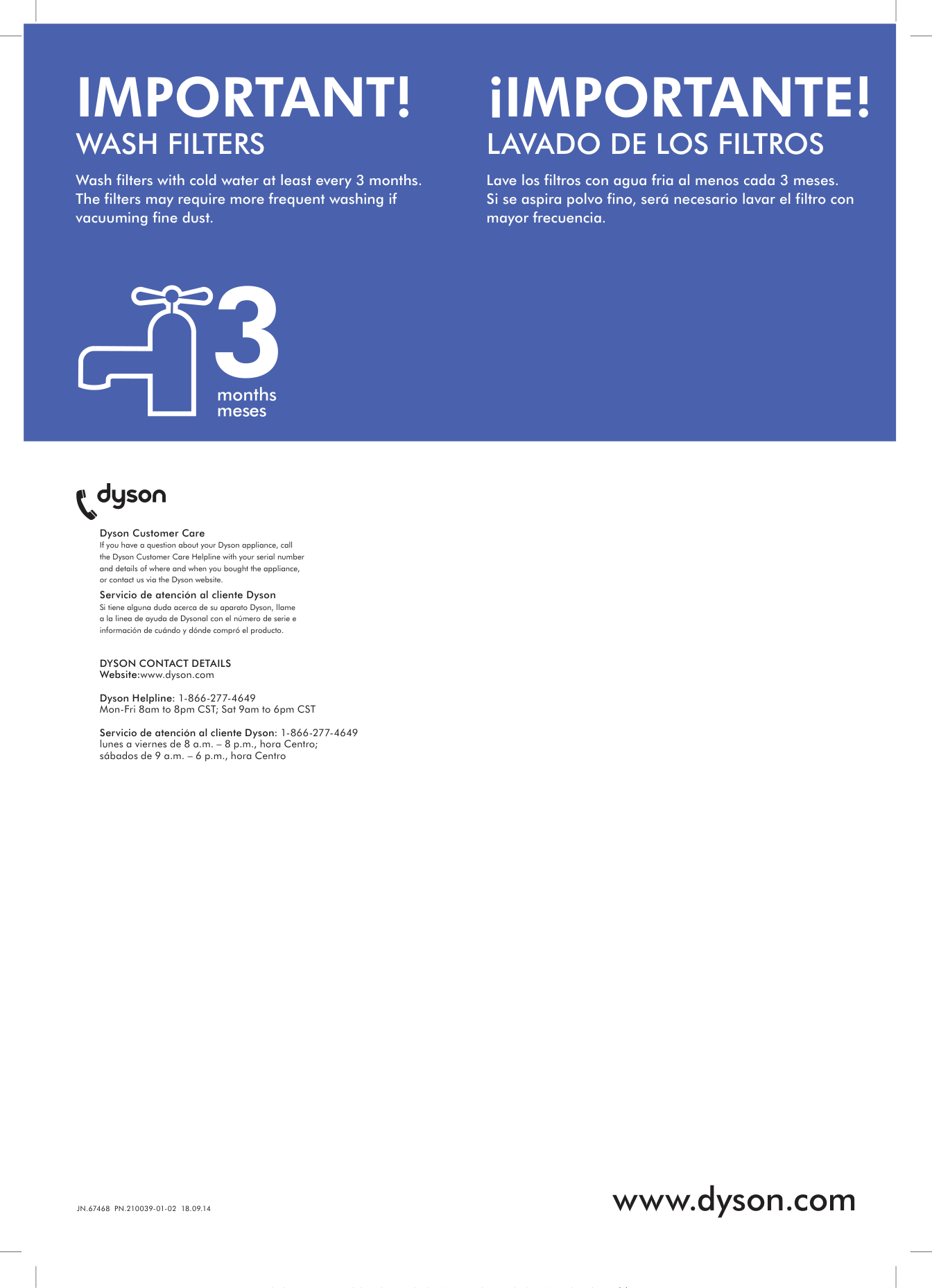 Website:www.dyson.comDyson Helpline: 1-866-277-4649 Mon-Fri 8am to 8pm CST; Sat 9am to 6pm CST Servicio de atención al cliente Dyson: 1-866-277-4649 lunes a viernes de 8 a.m. – 8 p.m., hora Centro; sábados de 9 a.m. – 6 p.m., hora Centro dd