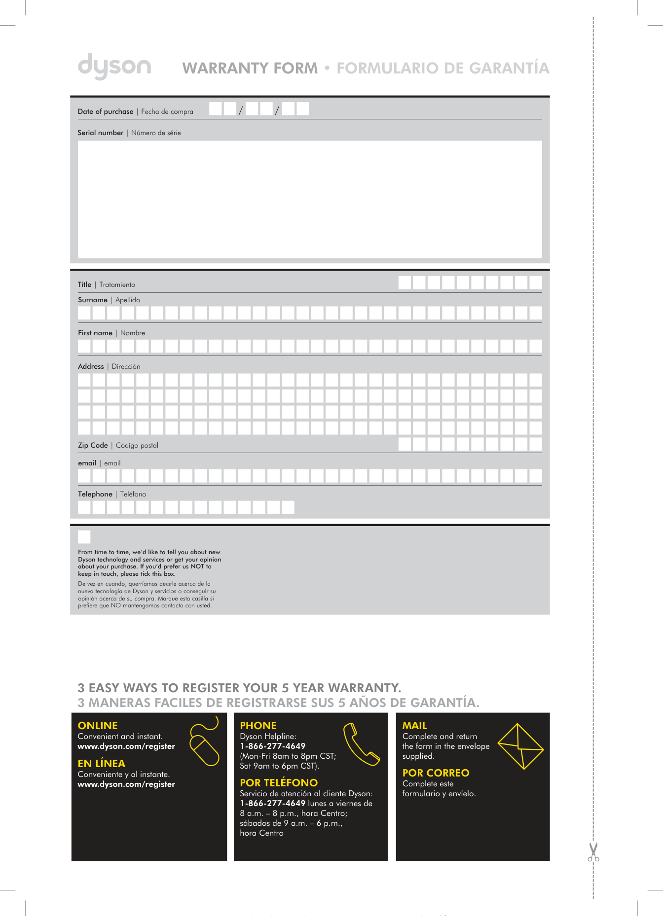 Title | Tratamiento Surname | Apellido First name | Nombre Telephone | Teléfono email | email Zip Code | Código postal Address | Dirección From time to time, we’d like to tell you about new Dyson technology and services or get your opinion about your purchase. If you’d prefer us NOT to keep in touch, please tick this box. De vez en cuando, querríamos decirle acerca de la nueva tecnología de Dyson y servicios o conseguir su opinión acerca de su compra. Marque esta casilla si prefiere que NO mantengamos contacto con usted. Date of purchase | Fecha de compra / / Serial number | Número de série