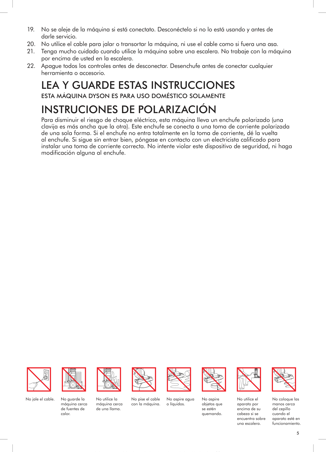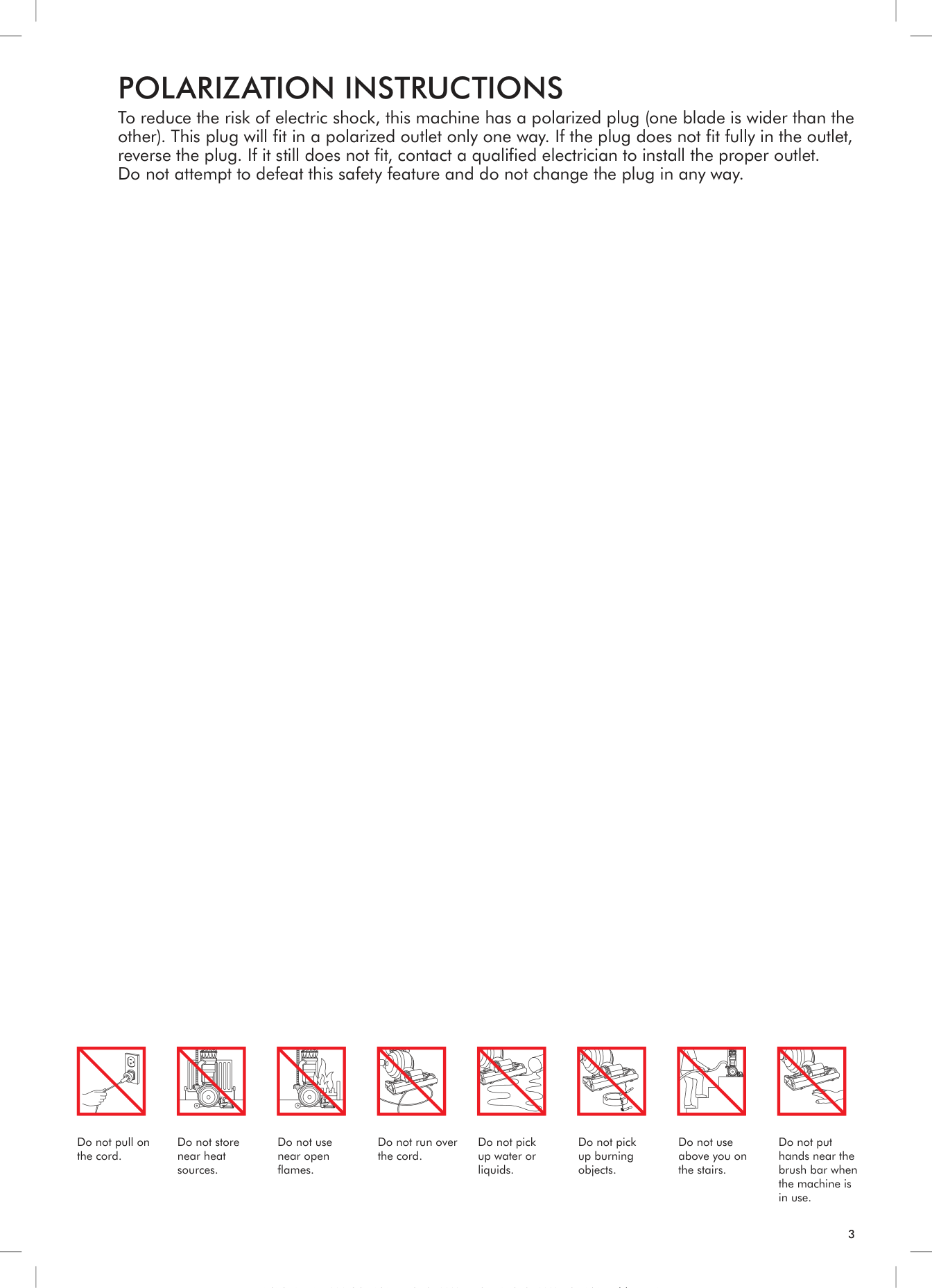 To reduce the risk of electric shock, this machine has a polarized plug (one blade is wider than the other). This plug will fit in a polarized outlet only one way. If the plug does not fit fully in the outlet, reverse the plug. If it still does not fit, contact a qualified electrician to install the proper outlet. Do not attempt to defeat this safety feature and do not change the plug in any way. Do not pull on the cord. Do not store near heat sources. Do not use near open flames. Do not run over the cord. Do not pick up water or liquids. Do not pick up burning objects. Do not use above you on the stairs. Do not put hands near the brush bar when the machine is in use. dd4