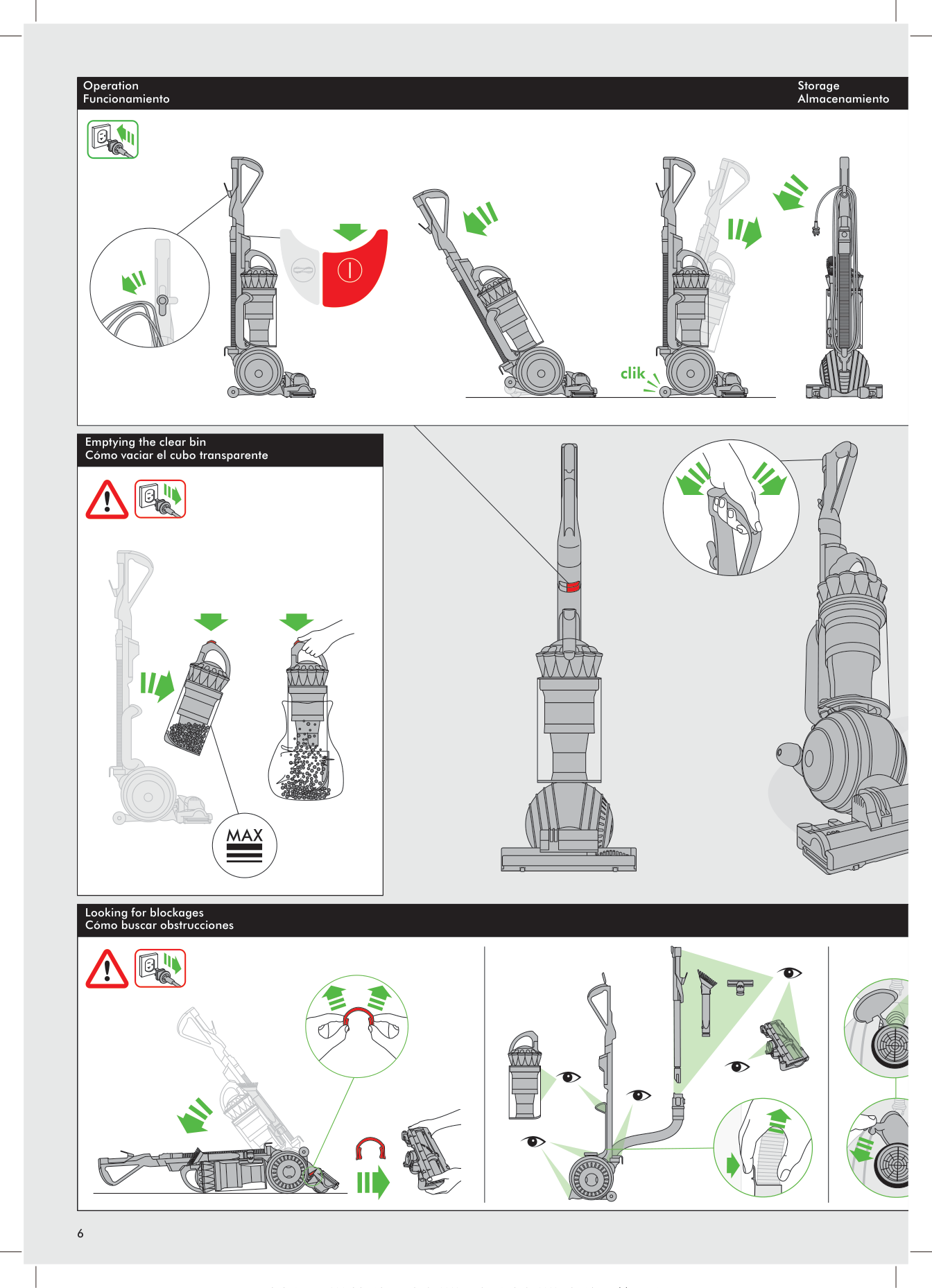 Para disminuir el riesgo de choque eléctrico, esta máquina lleva un enchufe polarizado (una clavija es más ancha que la otra). Este enchufe se conecta a una toma de corriente polarizada de una sola forma. Si el enchufe no entra totalmente en la toma de corriente, dé la vuelta al enchufe. Si sigue sin entrar bien, póngase en contacto con un electricista calificado para instalar una toma de corriente correcta. No intente violar este dispositivo de seguridad, ni haga modificación alguna al enchufe. No jale el cable. No guarde la máquina cerca de fuentes de calor. No utilice la máquina cerca de una llama. No pise el cable con la máquina. No aspire agua o líquidos. No aspire objetos que se estén quemando. No utilice el aparato por encima de su cabeza si se encuentra sobre una escalera. No coloque las manos cerca del cepillo cuando el aparato esté en funcionamiento. dd6 clik Operation Funcionamiento Looking for blockages Cómo buscar obstrucciones 6 Storage Almacenamiento Emptying the clear bin Cómo vaciar el cubo transparente dd