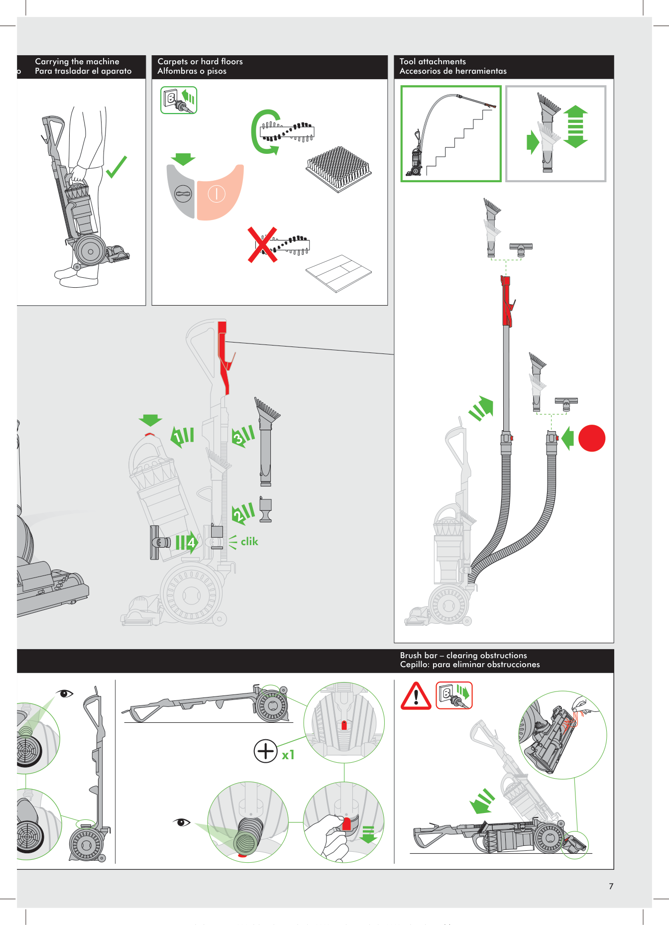 7 x1 clik o Brush bar – clearing obstructions Cepillo: para eliminar obstrucciones Tool attachments Accesorios de herramientas Carrying the machine Para trasladar el aparato Carpets or hard floors Alfombras o pisos 7 dd