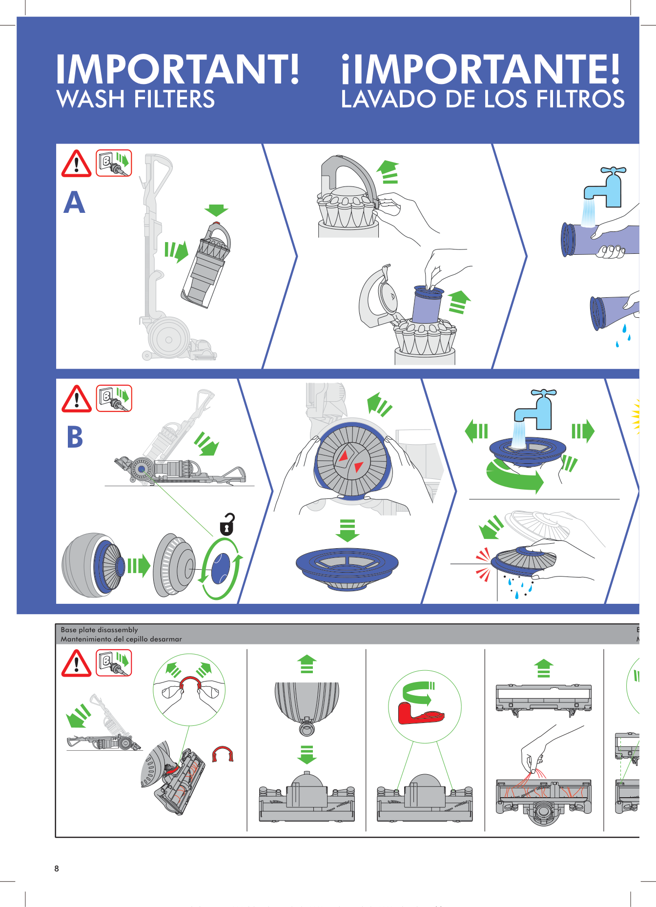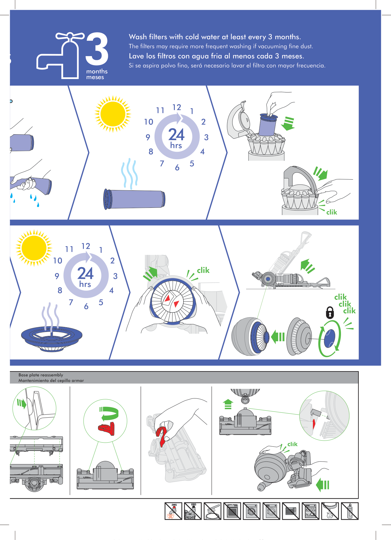 dd9 clik clik clik clik clik clik Wash filters with cold water at least every 3 months. The filters may require more frequent washing if vacuuming fine dust. Lave los filtros con agua fria al menos cada 3 meses. Si se aspira polvo fino, será necesario lavar el filtro con mayor frecuencia. Base plate reassembly Mantenimiento del cepillo armar