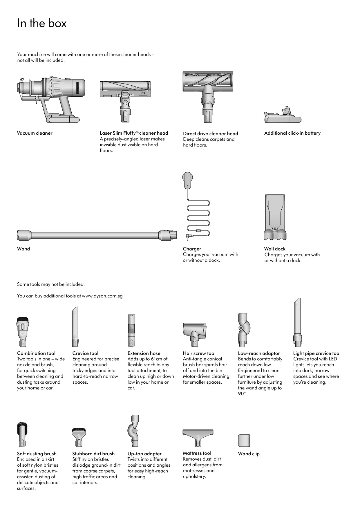 Top view of the Dyson V12 detect slim machine, showing cleaner head, wand, bin and main body. Dyson V12 detect slimIn the box Your machine will come with one or more of these cleaner heads – not all will be included. Vacuum cleaner Laser Slim Fluffy™ cleaner head A precisely-angled laser makes invisible dust visible on hard floors. Direct drive cleaner head Deep cleans carpets and hard floors. Additional click-in battery Wand Charger Charges your vacuum with or without a dock. Wall dock Charges your vacuum with or without a dock. Some tools may not be included. You can buy additional tools at www.dyson.com.sg Combination tool Two tools in one – wide nozzle and brush, for quick switching between cleaning and dusting tasks around your home or car. Crevice tool Engineered for precise cleaning around tricky edges and into hard-to-reach narrow spaces. Extension hose Adds up to 61cm of flexible reach to any tool attachment, to clean up high or down low in your home or car. Hair screw tool Anti-tangle conical brush bar spirals hair off and into the bin. Motor-driven cleaning for smaller spaces. Low-reach adaptor Bends to comfortably reach down low. Engineered to clean further under low furniture by adjusting the wand angle up to 90°. Light pipe crevice tool Crevice tool with LED lights lets you reach into dark, narrow spaces and see where you’re cleaning. Soft dusting brush Enclosed in a skirt of soft nylon bristles for gentle, vacuum- assisted dusting of delicate objects and surfaces. Stubborn dirt brush Stiff nylon bristles dislodge ground-in dirt from coarse carpets, high traffic areas and car interiors. Up-top adapter Twists into different positions and angles for easy high-reach cleaning. Mattress tool Removes dust, dirt and allergens from mattresses and upholstery. Wand clip