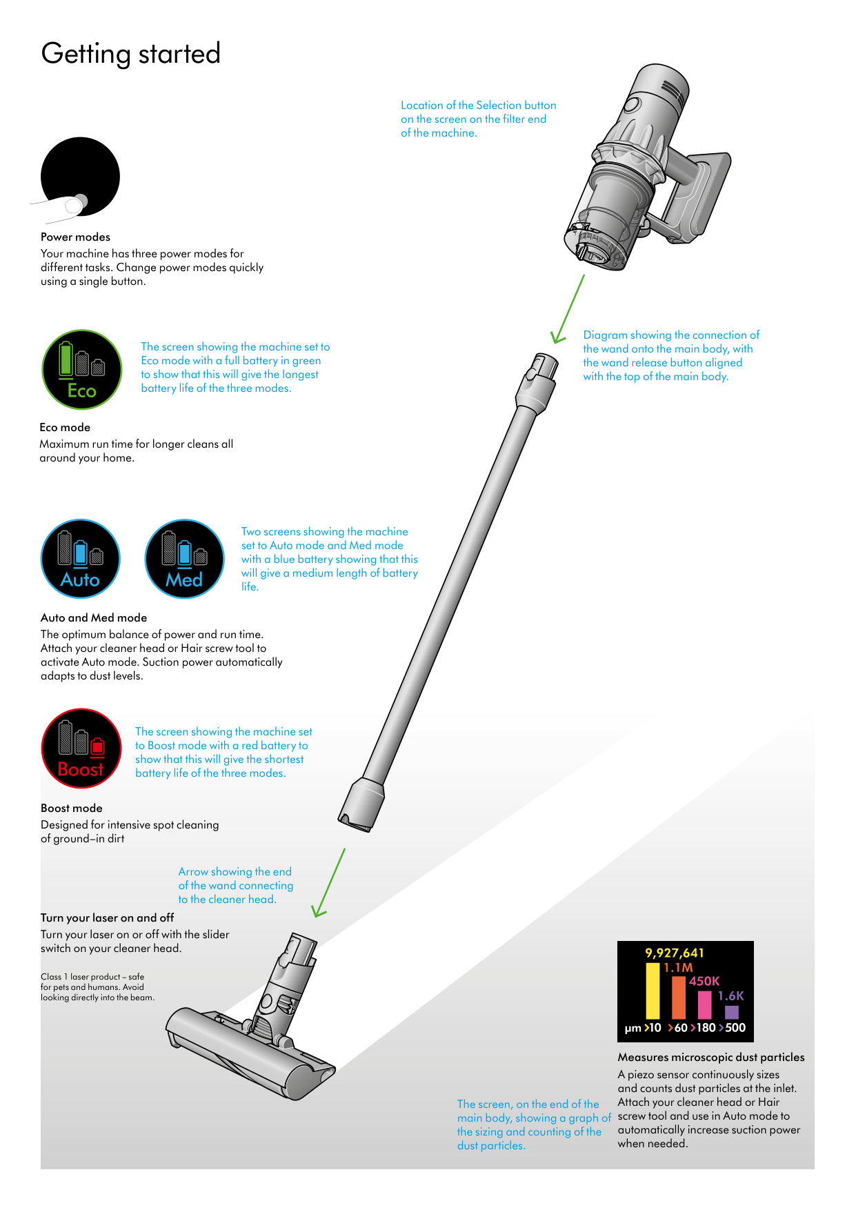 Getting started Power modes Your machine has three power modes for different tasks. Change power modes quickly using a single button. Eco mode Maximum run time for longer cleans all around your home. Auto and Med mode The optimum balance of power and run time. Attach your cleaner head or Hair screw tool to activate Auto mode. Suction power automatically adapts to dust levels. Boost mode Designed for intensive spot cleaning of ground–in dirt Turn your laser on and off Turn your laser on or off with the slider switch on your cleaner head. Class 1 laser product – safe for pets and humans. Avoid looking directly into the beam. Measures microscopic dust particles A piezo sensor continuously sizes and counts dust particles at the inlet. Attach your cleaner head or Hair screw tool and use in Auto mode to automatically increase suction power when needed. Diagram showing the connection of the wand onto the main body, with the wand release button aligned with the top of the main body. The screen showing the machine set to Eco mode with a full battery in green to show that this will give the longest battery life of the three modes. The screen showing the machine set to Boost mode with a red battery to show that this will give the shortest battery life of the three modes. Location of the Selection button on the screen on the filter end of the machine. The screen, on the end of the main body, showing a graph of the sizing and counting of the dust particles. Arrow showing the end of the wand connecting to the cleaner head. Two screens showing the machine set to Auto mode and Med mode with a blue battery showing that this will give a medium length of battery life.