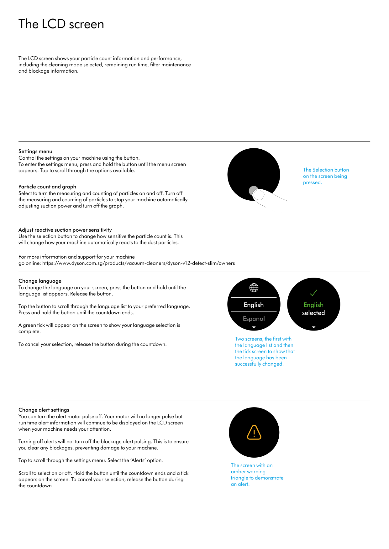 The LCD screen The LCD screen shows your particle count information and performance, including the cleaning mode selected, remaining run time, filter maintenance and blockage information. Settings menu Control the settings on your machine using the button. To enter the settings menu, press and hold the button until the menu screen appears. Tap to scroll through the options available. Particle count and graph Select to turn the measuring and counting of particles on and off. Turn off the measuring and counting of particles to stop your machine automatically adjusting suction power and turn off the graph. Adjust reactive suction power sensitivity Use the selection button to change how sensitive the particle count is. This will change how your machine automatically reacts to the dust particles. For more information and support for your machine go online: https://www.dyson.com.sg/products/vacuum-cleaners/dyson-v12-detect-slim/owners Change language To change the language on your screen, press the button and hold until the language list appears. Release the button. Tap the button to scroll through the language list to your preferred language. Press and hold the button until the countdown ends. A green tick will appear on the screen to show your language selection is complete. To cancel your selection, release the button during the countdown. Change alert settings You can turn the alert motor pulse off. Your motor will no longer pulse but run time alert information will continue to be displayed on the LCD screen when your machine needs your attention. Turning off alerts will not turn off the blockage alert pulsing. This is to ensure you clear any blockages, preventing damage to your machine. Tap to scroll through the settings menu. Select the ‘Alerts’ option. Scroll to select on or off. Hold the button until the countdown ends and a tick appears on the screen. To cancel your selection, release the button during the countdown The Selection button on the screen being pressed. Two screens, the first with the language list and then the tick screen to show that the language has been successfully changed. The screen with an amber warning triangle to demonstrate an alert.