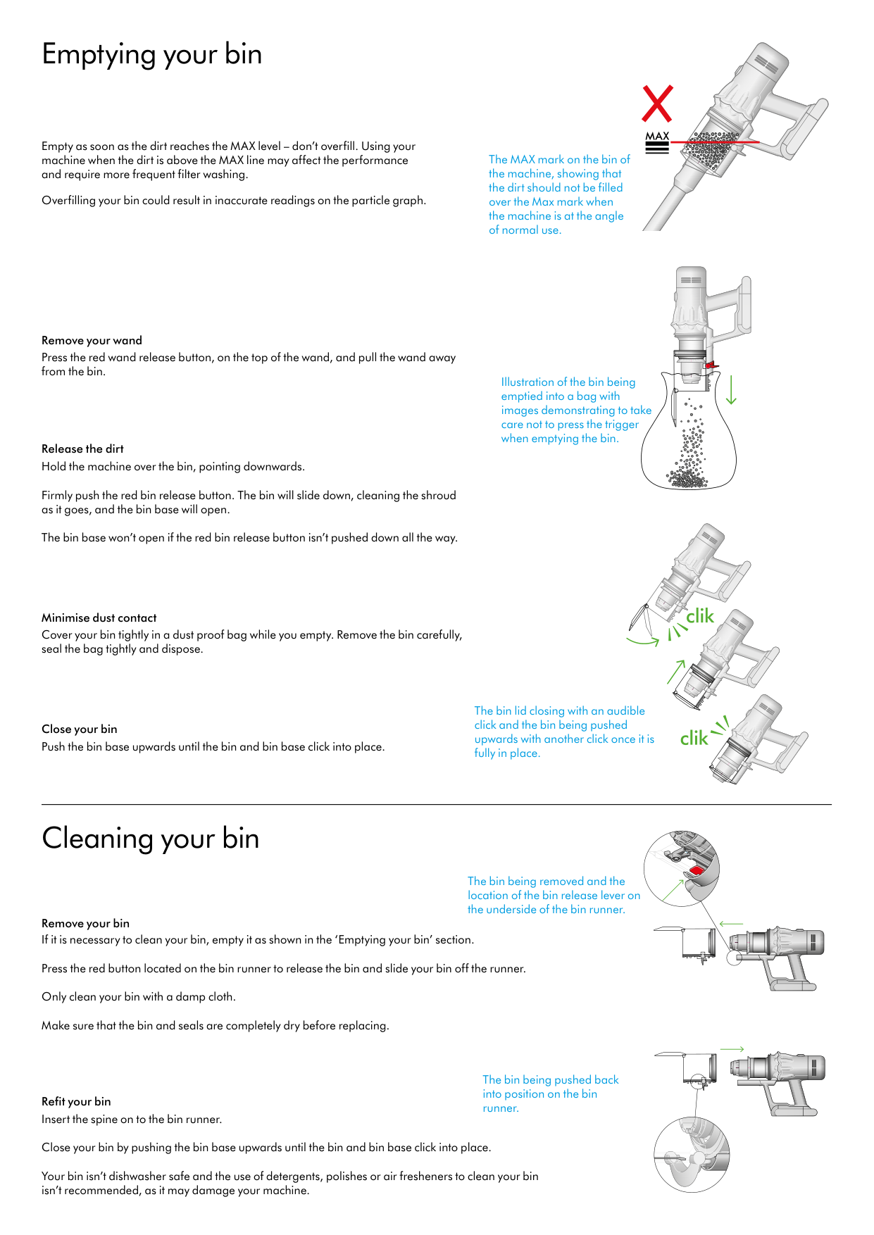 Emptying your bin Empty as soon as the dirt reaches the MAX level – don’t overfill. Using your machine when the dirt is above the MAX line may affect the performance and require more frequent filter washing. Overfilling your bin could result in inaccurate readings on the particle graph. Remove your wand Press the red wand release button, on the top of the wand, and pull the wand away from the bin. Release the dirt Hold the machine over the bin, pointing downwards. Firmly push the red bin release button. The bin will slide down, cleaning the shroud as it goes, and the bin base will open. The bin base won’t open if the red bin release button isn’t pushed down all the way. Minimise dust contact Cover your bin tightly in a dust proof bag while you empty. Remove the bin carefully, seal the bag tightly and dispose. Close your bin Push the bin base upwards until the bin and bin base click into place. Cleaning your bin Remove your bin If it is necessary to clean your bin, empty it as shown in the ‘Emptying your bin’ section. Press the red button located on the bin runner to release the bin and slide your bin off the runner. Only clean your bin with a damp cloth. Make sure that the bin and seals are completely dry before replacing. Refit your bin Insert the spine on to the bin runner. Close your bin by pushing the bin base upwards until the bin and bin base click into place. Your bin isn’t dishwasher safe and the use of detergents, polishes or air fresheners to clean your bin isn’t recommended, as it may damage your machine. The MAX mark on the bin of the machine, showing that the dirt should not be filled over the Max mark when the machine is at the angle of normal use. Illustration of the bin being emptied into a bag with images demonstrating to take care not to press the trigger when emptying the bin. The bin lid closing with an audible click and the bin being pushed upwards with another click once it is fully in place. The bin being removed and the location of the bin release lever on the underside of the bin runner. The bin being pushed back into position on the bin runner.