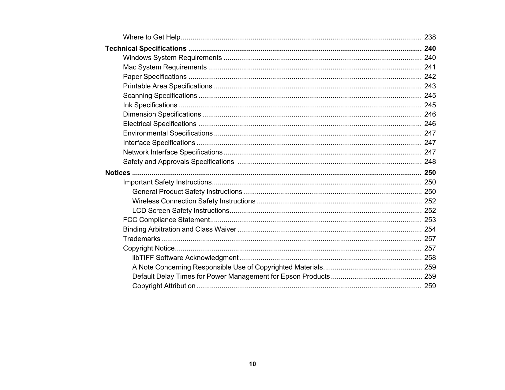 10 Where to Get Help............................................................................................................................ 238 Technical Specifications ........................................................................................................................ 240 Windows System Requirements ...................................................................................................... 240 Mac System Requirements .............................................................................................................. 241 Paper Specifications ........................................................................................................................ 242 Printable Area Specifications ........................................................................................................... 243 Scanning Specifications ................................................................................................................... 245 Ink Specifications ............................................................................................................................. 245 Dimension Specifications ................................................................................................................. 246 Electrical Specifications ................................................................................................................... 246 Environmental Specifications ........................................................................................................... 247 Interface Specifications .................................................................................................................... 247 Network Interface Specifications...................................................................................................... 247 Safety and Approvals Specifications ............................................................................................... 248 Notices ..................................................................................................................................................... 250 Important Safety Instructions............................................................................................................ 250 General Product Safety Instructions............................................................................................ 250 Wireless Connection Safety Instructions ..................................................................................... 252 LCD Screen Safety Instructions................................................................................................... 252 FCC Compliance Statement............................................................................................................. 253 Binding Arbitration and Class Waiver............................................................................................... 254 Trademarks...................................................................................................................................... 257 Copyright Notice............................................................................................................................... 257 libTIFF Software Acknowledgment.............................................................................................. 258 A Note Concerning Responsible Use of Copyrighted Materials................................................... 259 Default Delay Times for Power Management for Epson Products............................................... 259 Copyright Attribution.................................................................................................................... 259