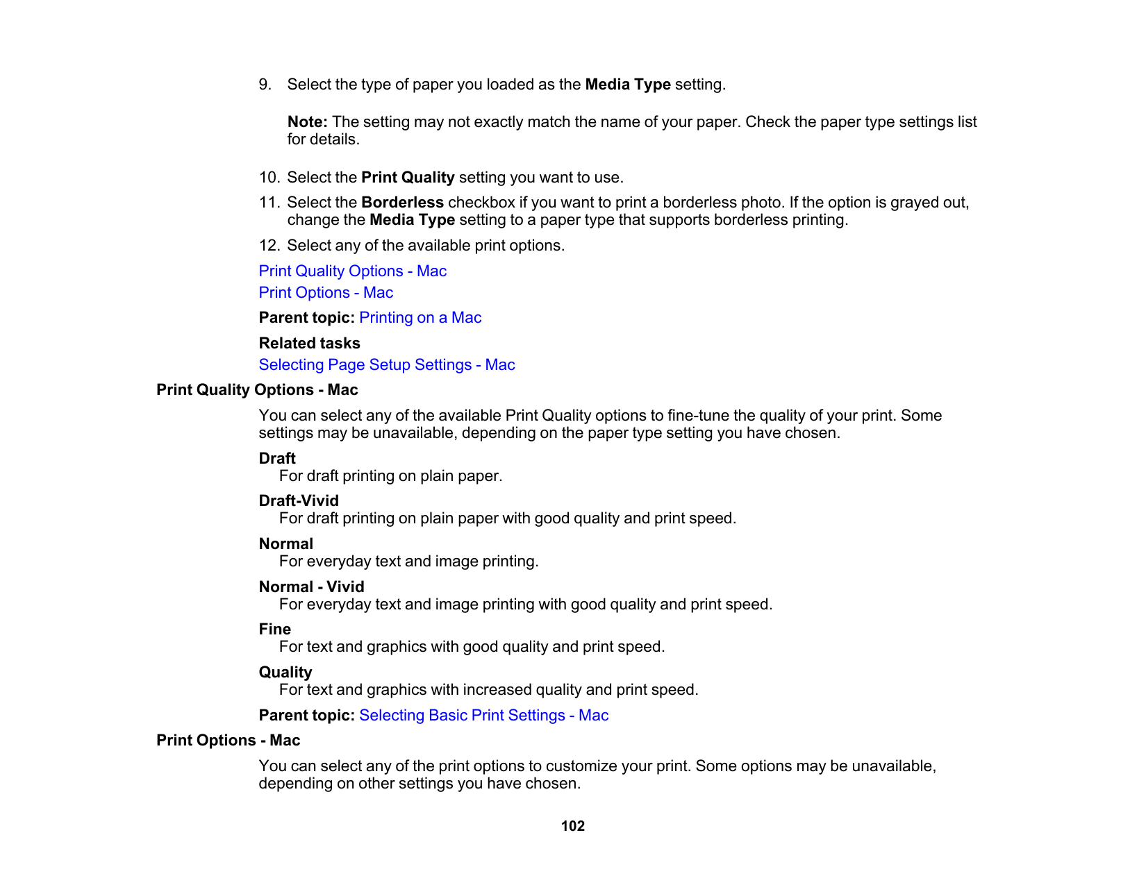 223 Related tasks Refilling the Ink Tanks Selecting Additional Layout and Print Options - Windows Selecting Printing Preferences - Mac Loading Paper in the Rear Paper Feeder Selecting Basic Print Settings - Mac Selecting Basic Print Settings - Windows Blurry or Smeared Printout If your printouts are blurry or smeared, try these solutions: