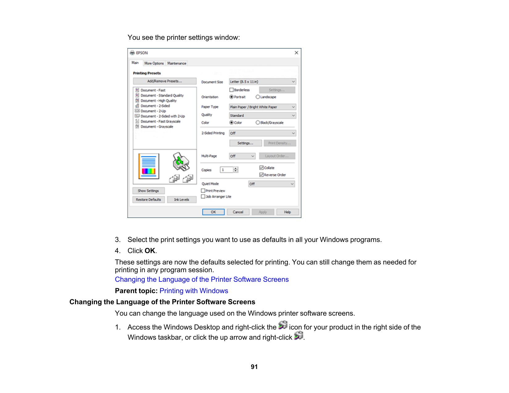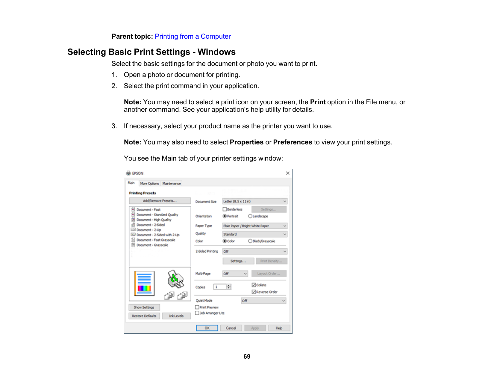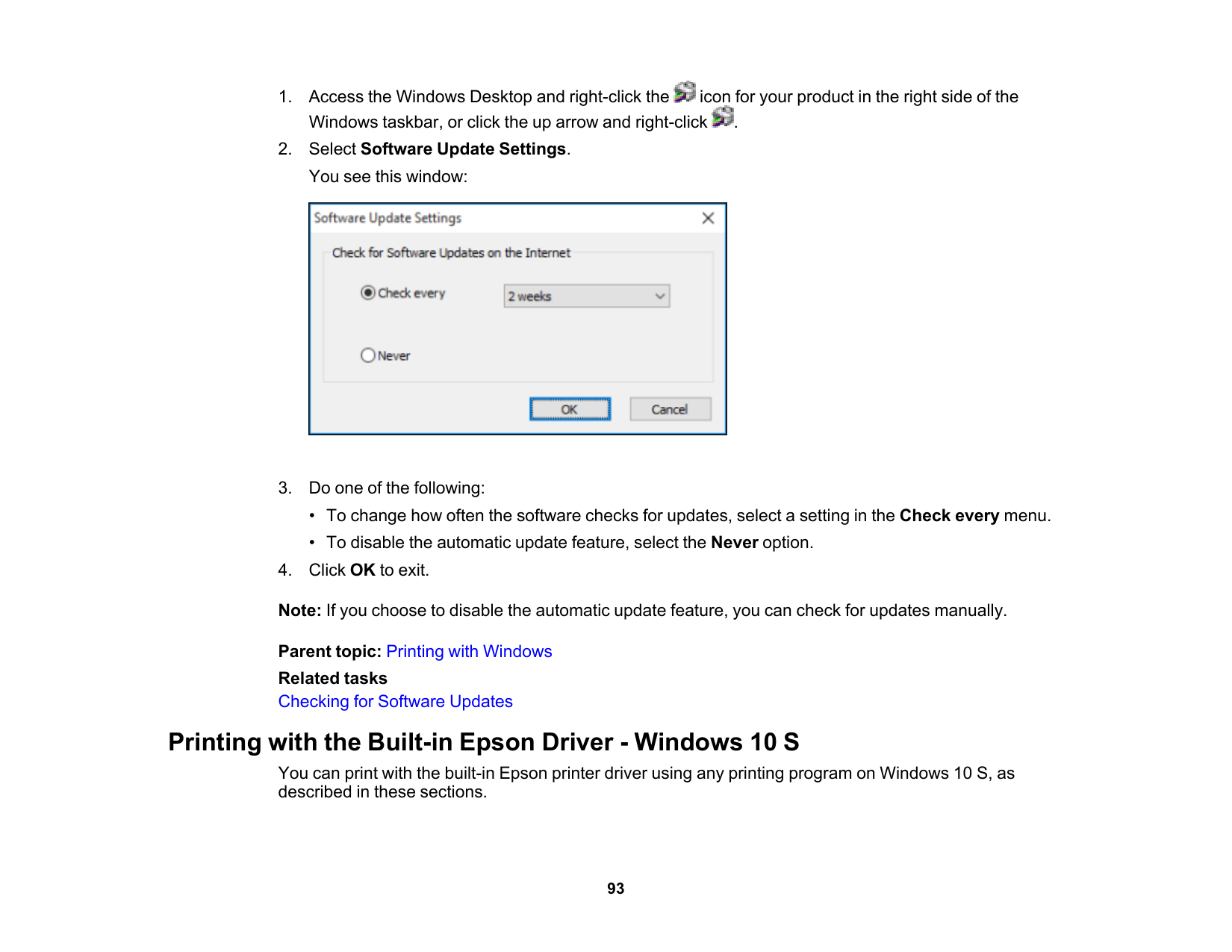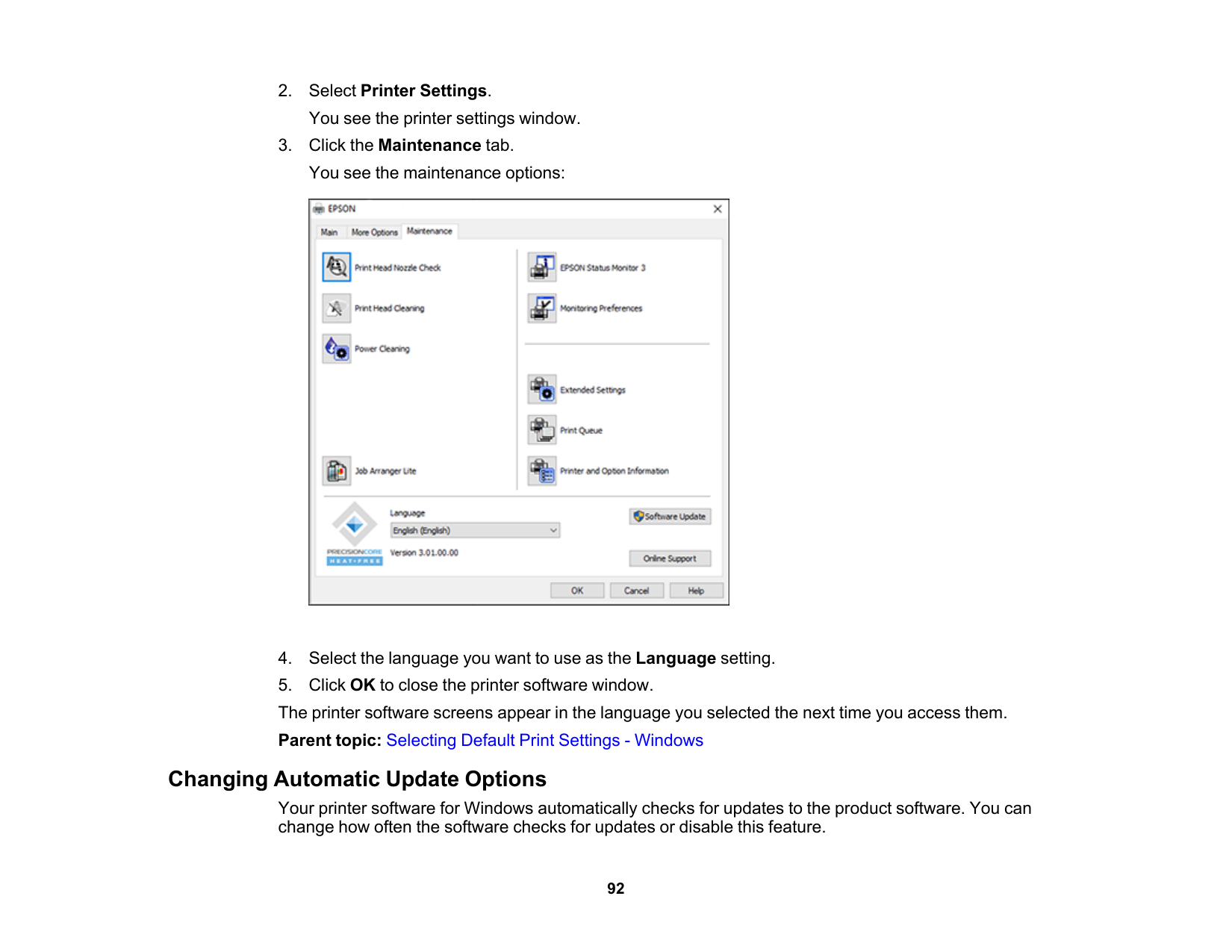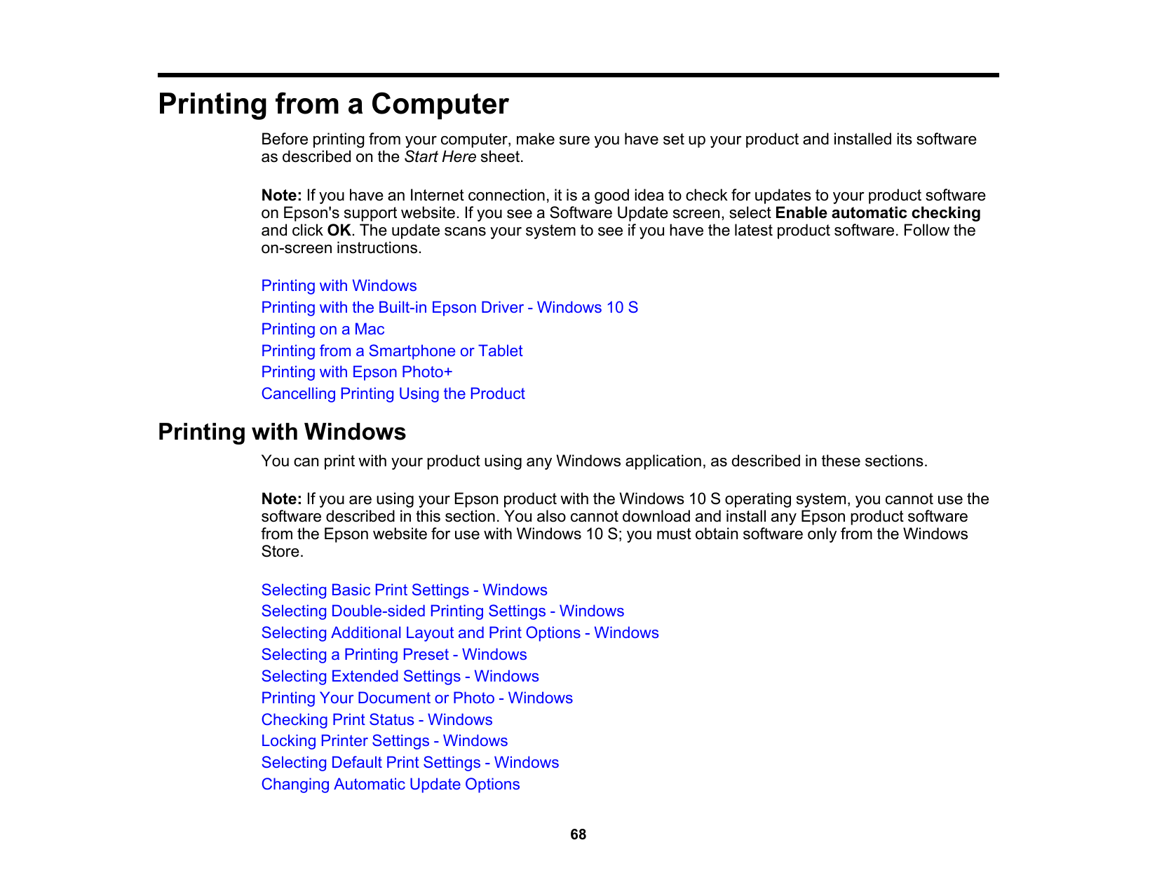 5 Printing from a Computer ......................................................................................................................... 68 Printing with Windows ........................................................................................................................ 68 Selecting Basic Print Settings - Windows ...................................................................................... 69 Print Quality Options - Windows ............................................................................................... 71 Multi-Page Printing Options - Windows..................................................................................... 71 Selecting Double-sided Printing Settings - Windows..................................................................... 72 Double-sided Printing Options - Windows................................................................................. 75 Print Density Adjustments - Windows ....................................................................................... 75 Selecting Additional Layout and Print Options - Windows ............................................................. 76 Custom Color Correction Options - Windows............................................................................ 78 Image Options and Additional Settings - Windows.................................................................... 79 Header/Footer Settings - Windows ........................................................................................... 80 Selecting a Printing Preset - Windows........................................................................................... 81 Selecting Extended Settings - Windows ........................................................................................ 82 Extended Settings - Windows ................................................................................................... 84 Printing Your Document or Photo - Windows................................................................................. 86 Checking Print Status - Windows .................................................................................................. 87 Locking Printer Settings - Windows ............................................................................................... 87 Locked Setting Options............................................................................................................. 89 Selecting Default Print Settings - Windows.................................................................................... 90 Changing the Language of the Printer Software Screens ......................................................... 91 Changing Automatic Update Options ............................................................................................ 92 Printing with the Built-in Epson Driver - Windows 10 S....................................................................... 93 Selecting Print Settings - Windows 10 S........................................................................................ 94 Printing on a Mac ............................................................................................................................... 98 Selecting Basic Print Settings - Mac ............................................................................................. 99 Print Quality Options - Mac ..................................................................................................... 102 Print Options - Mac ................................................................................................................. 102 Selecting Page Setup Settings - Mac .......................................................................................... 103 Selecting Print Layout Options - Mac........................................................................................... 104 Selecting Double-sided Printing Settings - Mac........................................................................... 104 Double-sided Printing Options and Adjustments - Mac........................................................... 106 Managing Color - Mac ................................................................................................................. 106