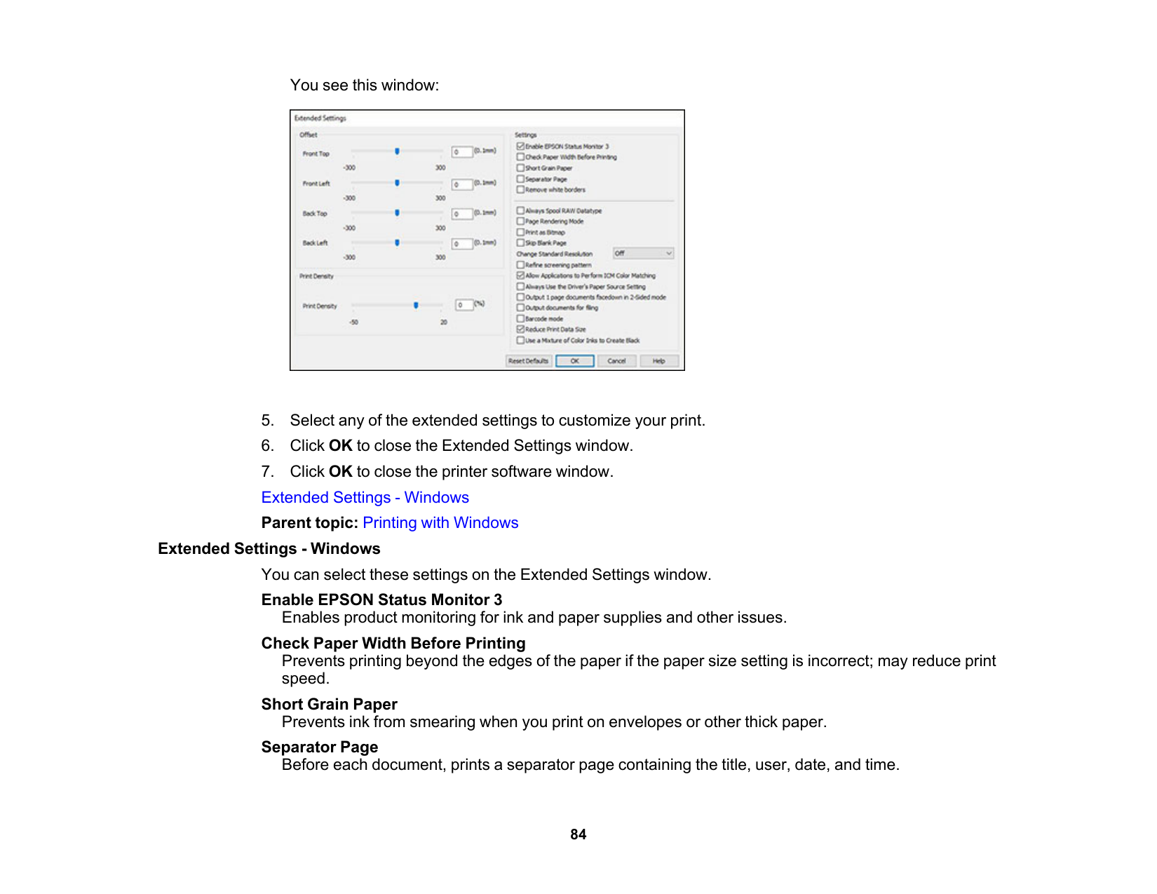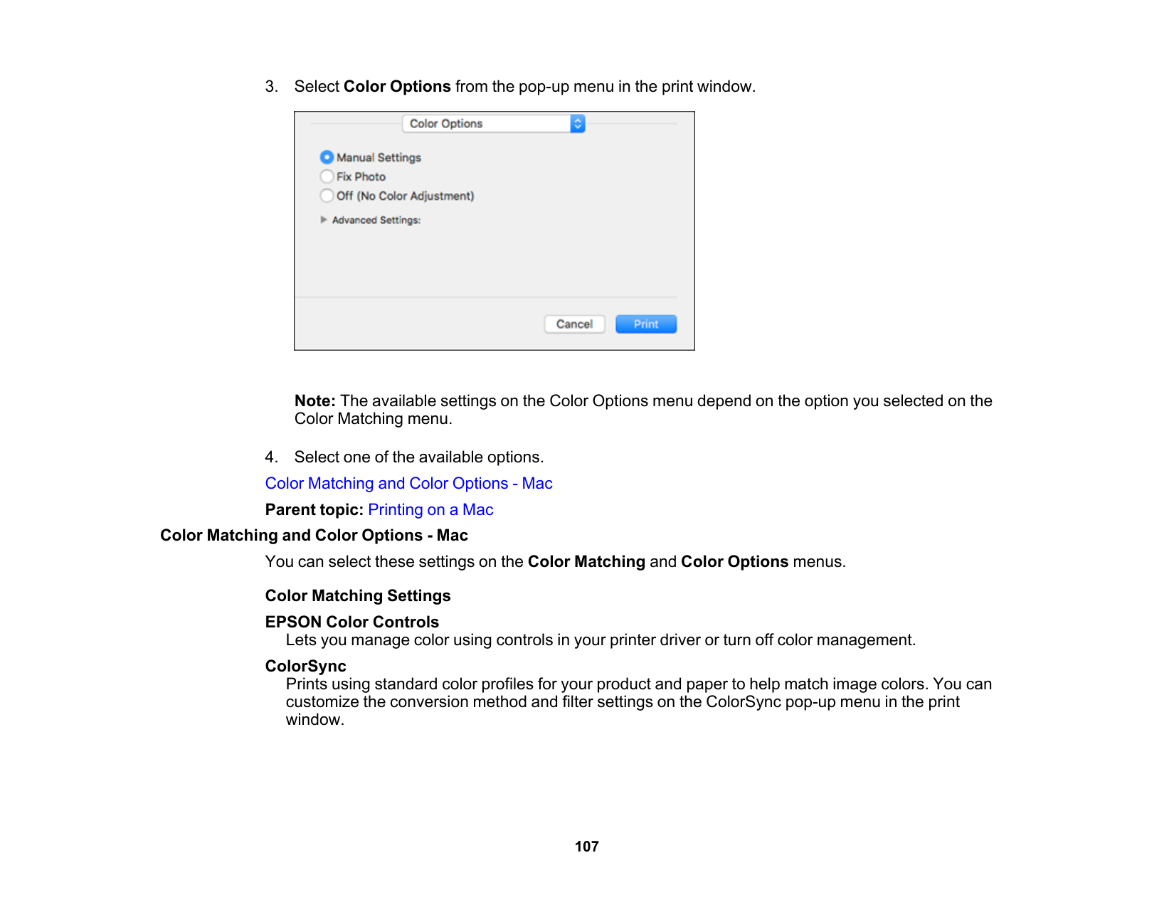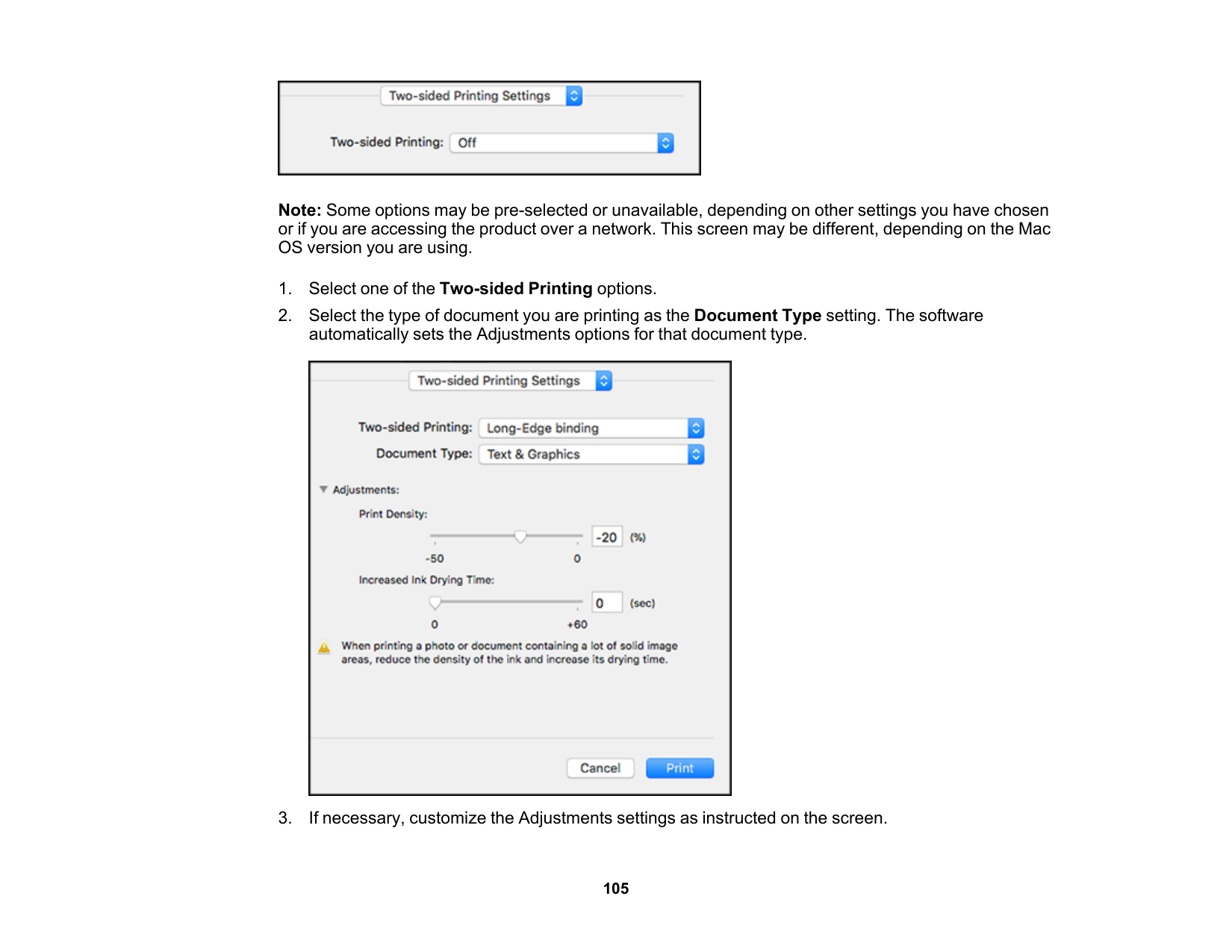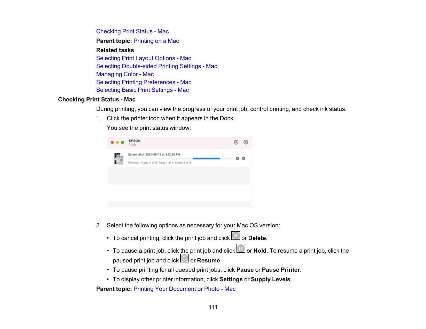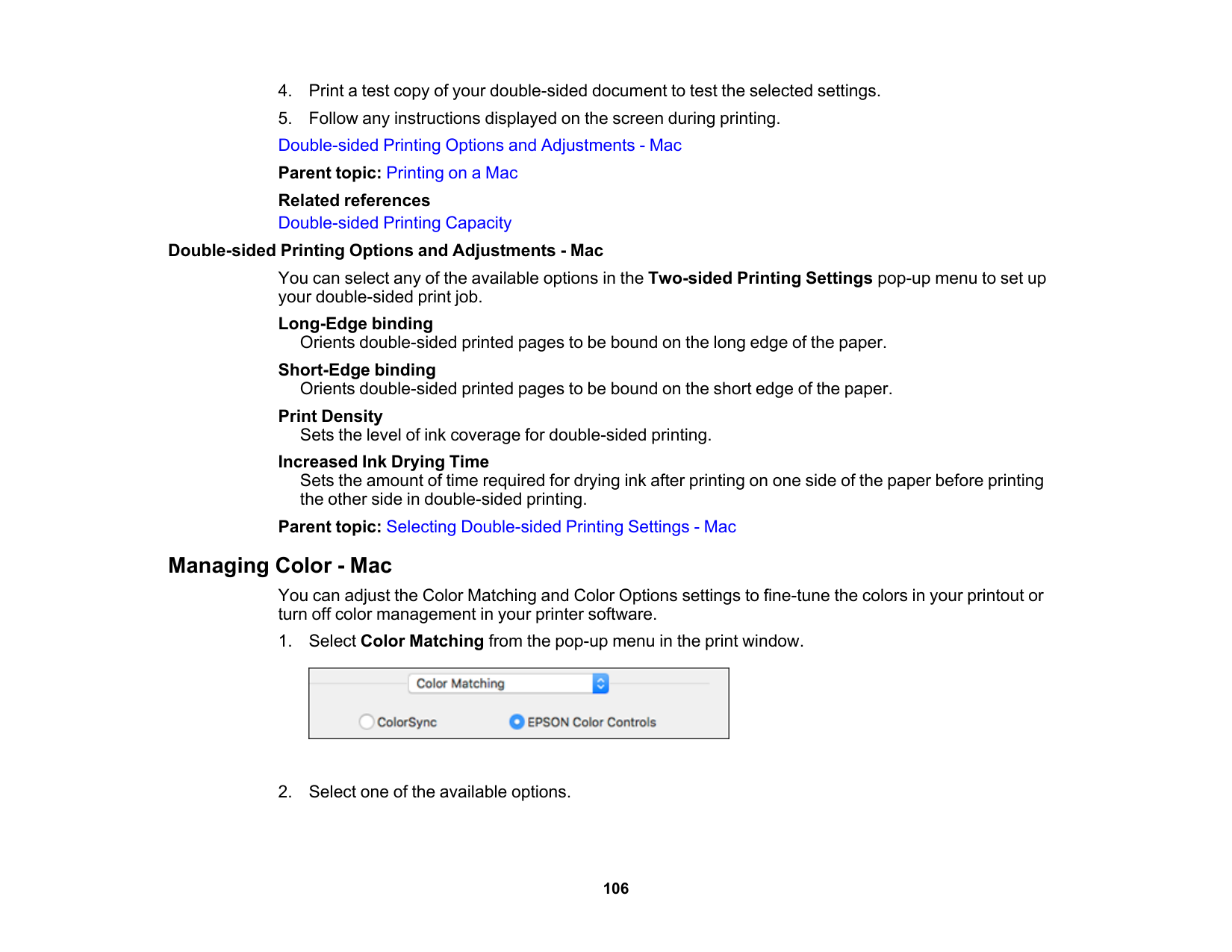 5 Printing from a Computer ......................................................................................................................... 68 Printing with Windows ........................................................................................................................ 68 Selecting Basic Print Settings - Windows ...................................................................................... 69 Print Quality Options - Windows ............................................................................................... 71 Multi-Page Printing Options - Windows..................................................................................... 71 Selecting Double-sided Printing Settings - Windows..................................................................... 72 Double-sided Printing Options - Windows................................................................................. 75 Print Density Adjustments - Windows ....................................................................................... 75 Selecting Additional Layout and Print Options - Windows ............................................................. 76 Custom Color Correction Options - Windows............................................................................ 78 Image Options and Additional Settings - Windows.................................................................... 79 Header/Footer Settings - Windows ........................................................................................... 80 Selecting a Printing Preset - Windows........................................................................................... 81 Selecting Extended Settings - Windows ........................................................................................ 82 Extended Settings - Windows ................................................................................................... 84 Printing Your Document or Photo - Windows................................................................................. 86 Checking Print Status - Windows .................................................................................................. 87 Locking Printer Settings - Windows ............................................................................................... 87 Locked Setting Options............................................................................................................. 89 Selecting Default Print Settings - Windows.................................................................................... 90 Changing the Language of the Printer Software Screens ......................................................... 91 Changing Automatic Update Options ............................................................................................ 92 Printing with the Built-in Epson Driver - Windows 10 S....................................................................... 93 Selecting Print Settings - Windows 10 S........................................................................................ 94 Printing on a Mac ............................................................................................................................... 98 Selecting Basic Print Settings - Mac ............................................................................................. 99 Print Quality Options - Mac ..................................................................................................... 102 Print Options - Mac ................................................................................................................. 102 Selecting Page Setup Settings - Mac .......................................................................................... 103 Selecting Print Layout Options - Mac........................................................................................... 104 Selecting Double-sided Printing Settings - Mac........................................................................... 104 Double-sided Printing Options and Adjustments - Mac........................................................... 106 Managing Color - Mac ................................................................................................................. 106