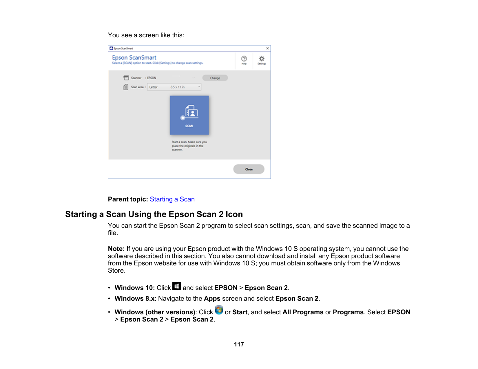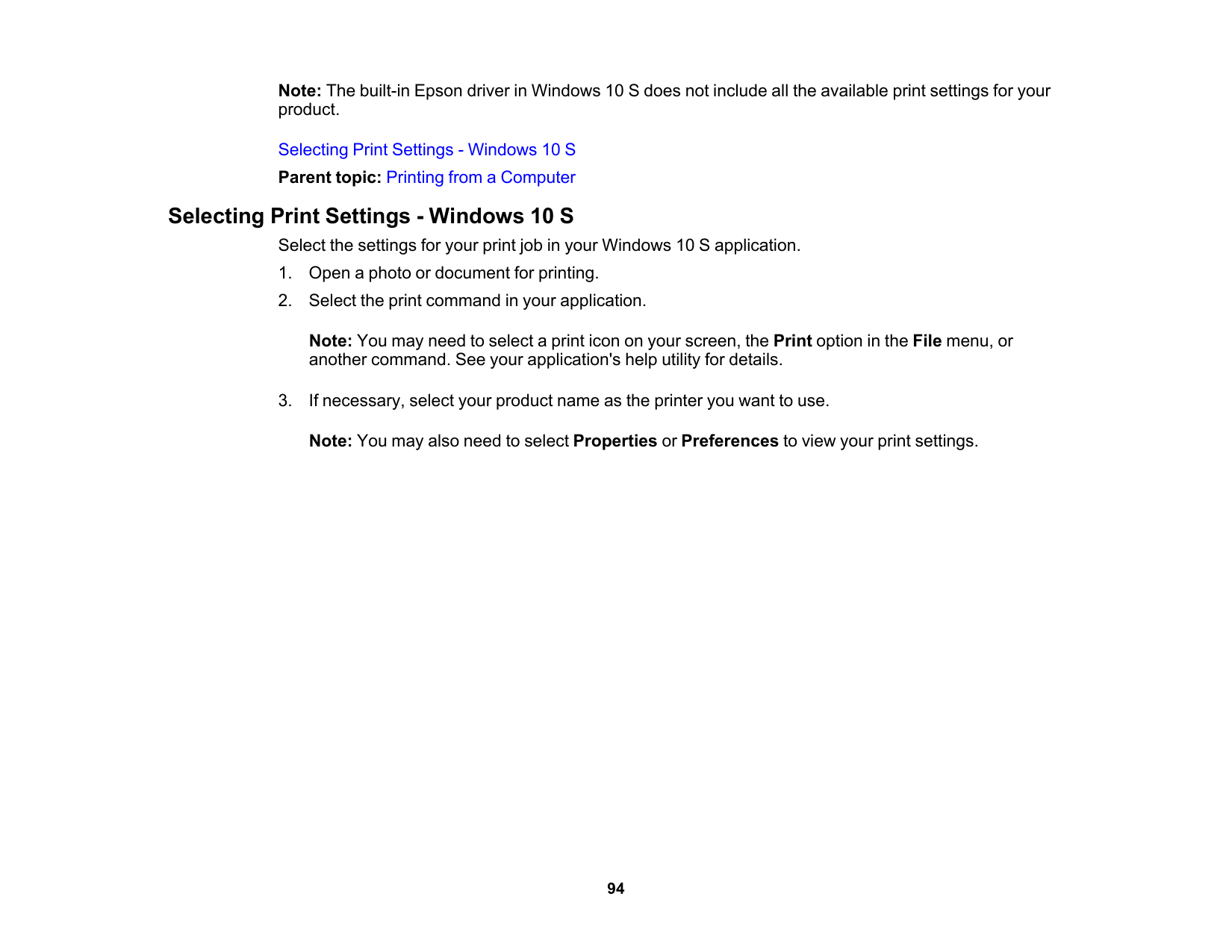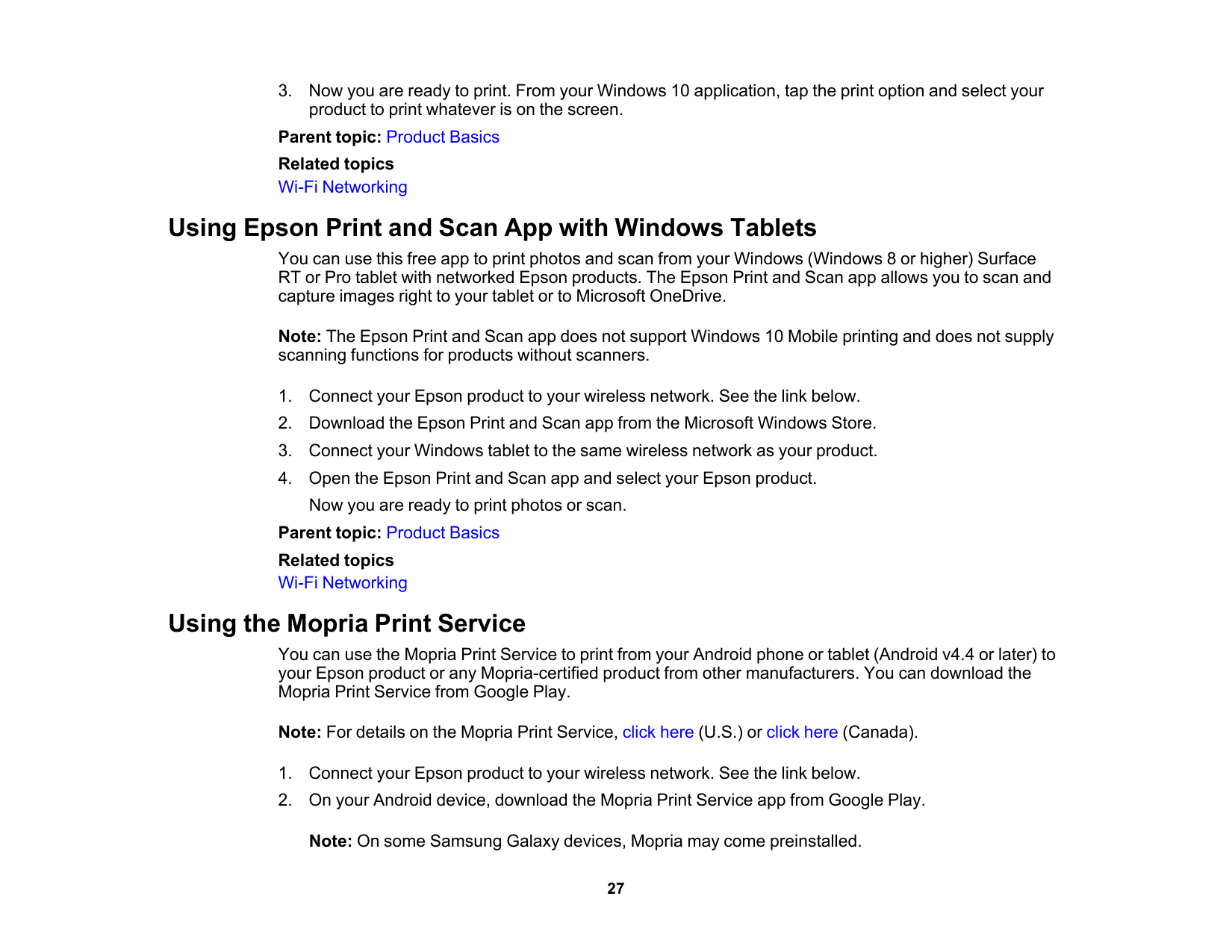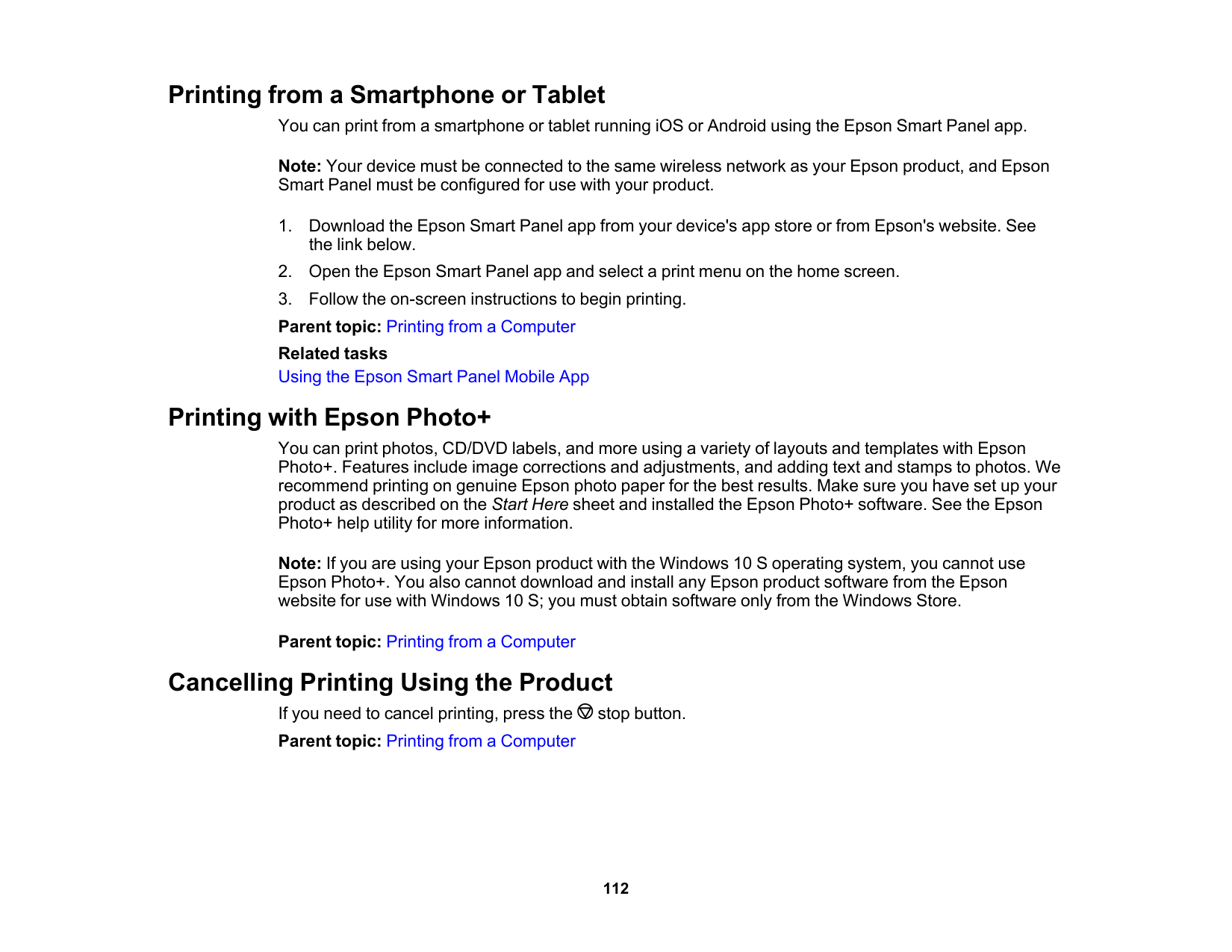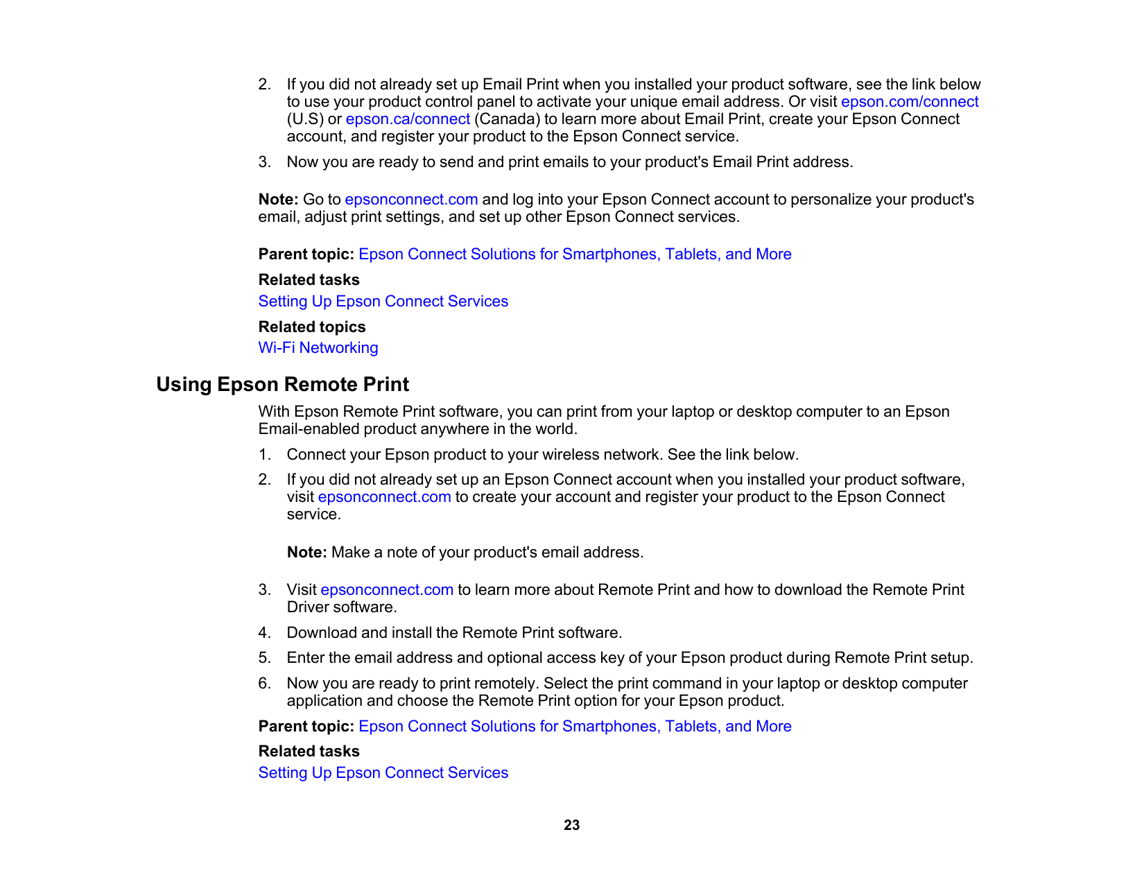 21 Now you are ready to print with your voice and your Epson product. Parent topic: Product Basics Related tasks Setting Up Epson Connect Services Related topics Wi-Fi Networking Epson Connect Solutions for Smartphones, Tablets, and More Use your smartphone, tablet, or computer to print and scan documents, photos, emails, and web pages from your home, office, or even across the globe. Note: If you are using your Epson product with the Windows 10 S operating system, you cannot use the software described in this section. You also cannot download and install any Epson product software from the Epson website for use with Windows 10 S; you must obtain software only from the Windows Store. Print from anywhere with these Epson Connect solutions: