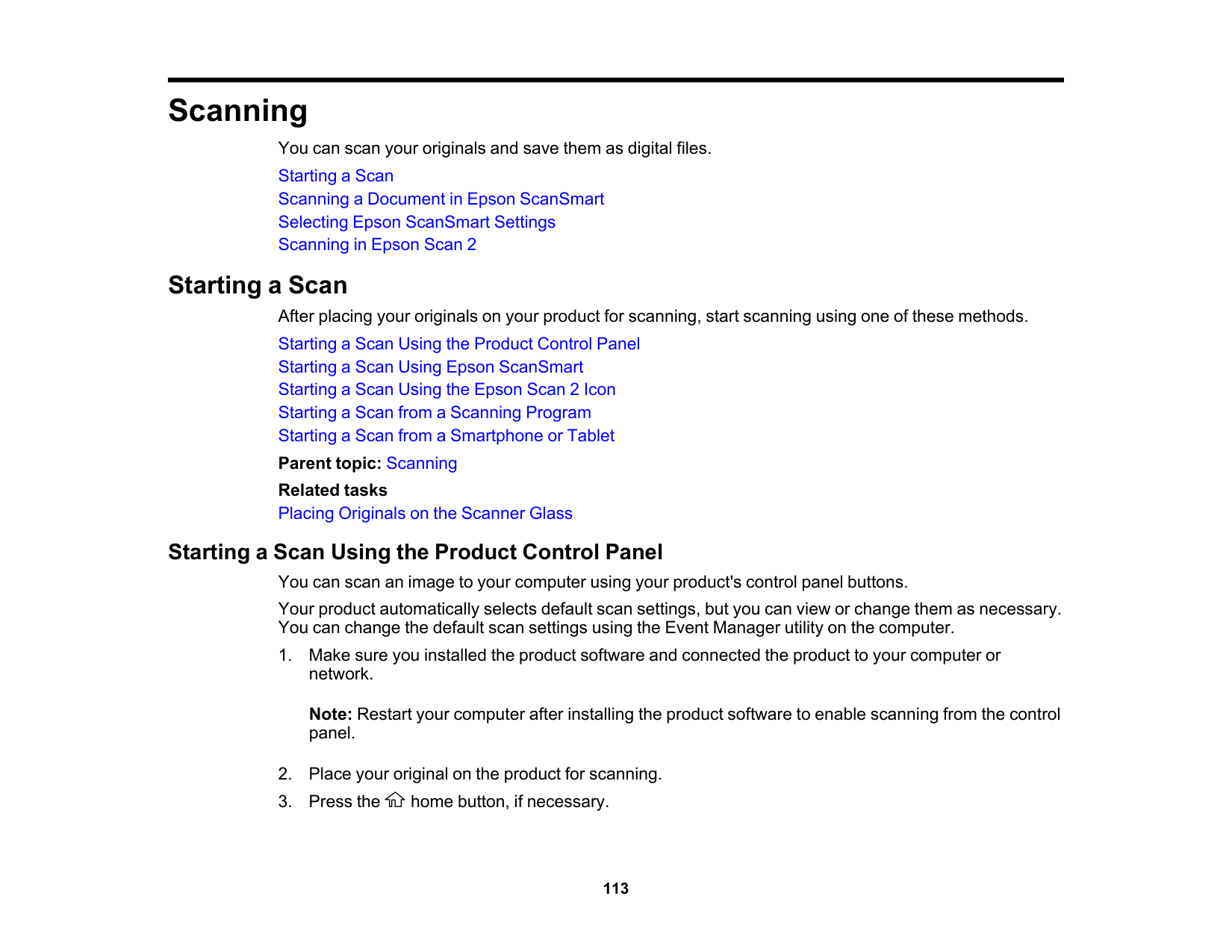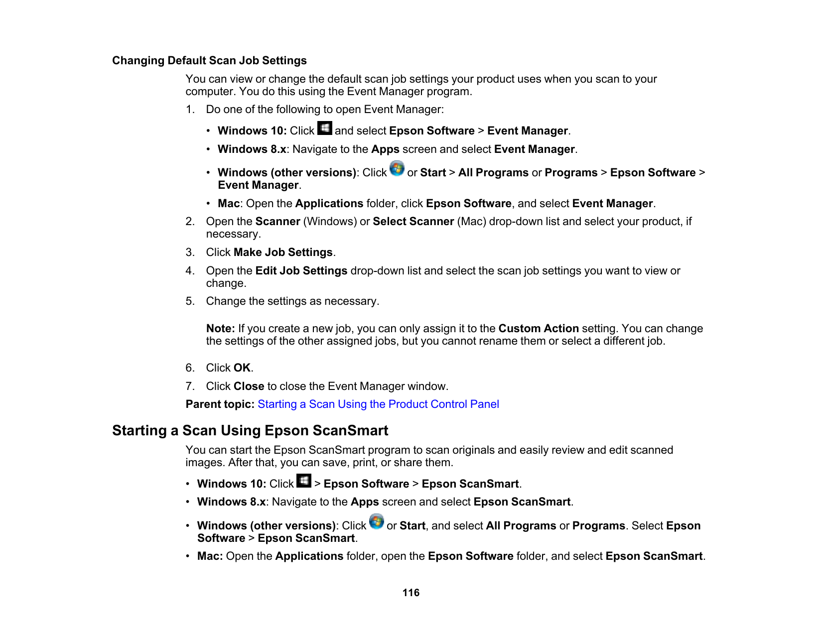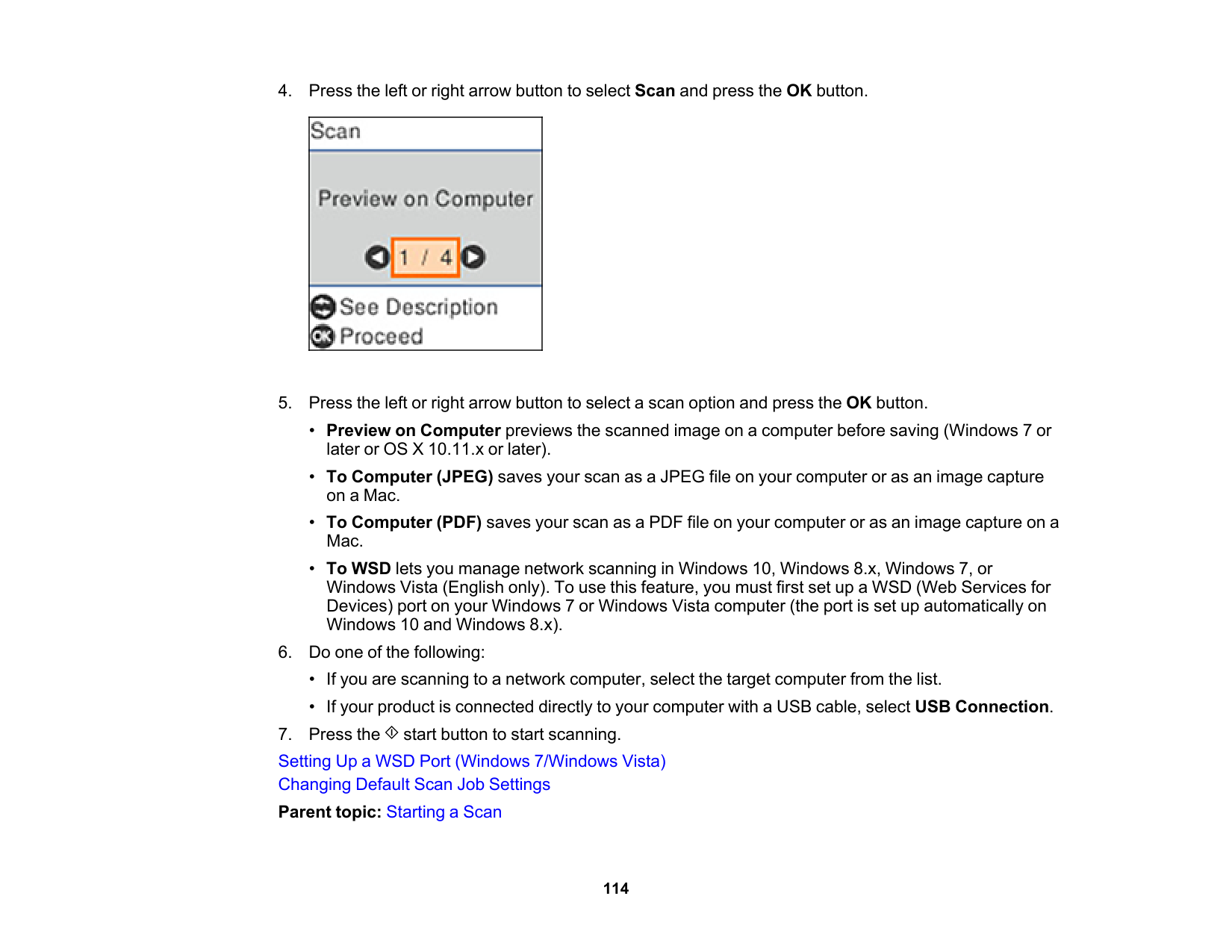 6 Color Matching and Color Options - Mac ................................................................................ 107 Selecting Printing Preferences - Mac .......................................................................................... 108 Printing Preferences - Mac...................................................................................................... 109 Printing Your Document or Photo - Mac ...................................................................................... 110 Checking Print Status - Mac.................................................................................................... 111 Printing from a Smartphone or Tablet............................................................................................... 112 Printing with Epson Photo+ .............................................................................................................. 112 Cancelling Printing Using the Product.............................................................................................. 112 Scanning .................................................................................................................................................. 113 Starting a Scan................................................................................................................................. 113 Starting a Scan Using the Product Control Panel ........................................................................ 113 Setting Up a WSD Port (Windows 7/Windows Vista) .............................................................. 115 Changing Default Scan Job Settings ...................................................................................... 116 Starting a Scan Using Epson ScanSmart .................................................................................... 116 Starting a Scan Using the Epson Scan 2 Icon ............................................................................. 117 Starting a Scan from a Scanning Program................................................................................... 119 Starting a Scan from a Smartphone or Tablet.............................................................................. 121 Scanning a Document in Epson ScanSmart..................................................................................... 121 Saving a Scan ............................................................................................................................. 124 Attaching a Scan to Email............................................................................................................ 125 Sending a Scan to a Cloud Service ............................................................................................. 126 Printing a Scan ............................................................................................................................ 127 Selecting Epson ScanSmart Settings............................................................................................... 129 Changing the Epson Product....................................................................................................... 129 Changing the Scan Settings ........................................................................................................ 130 Changing the File Name Settings ................................................................................................ 132 Changing the Save Settings ........................................................................................................ 133 Save Settings.......................................................................................................................... 135 Customizing Action Icons ............................................................................................................ 137 Scanning in Epson Scan 2 ............................................................................................................... 138 Additional Scanning Settings - Main Settings Tab ....................................................................... 141 Additional Scanning Settings - Advanced Settings Tab............................................................... 141 Saving Scanned Documents as a Searchable PDF Using Epson Scan 2 ................................... 143