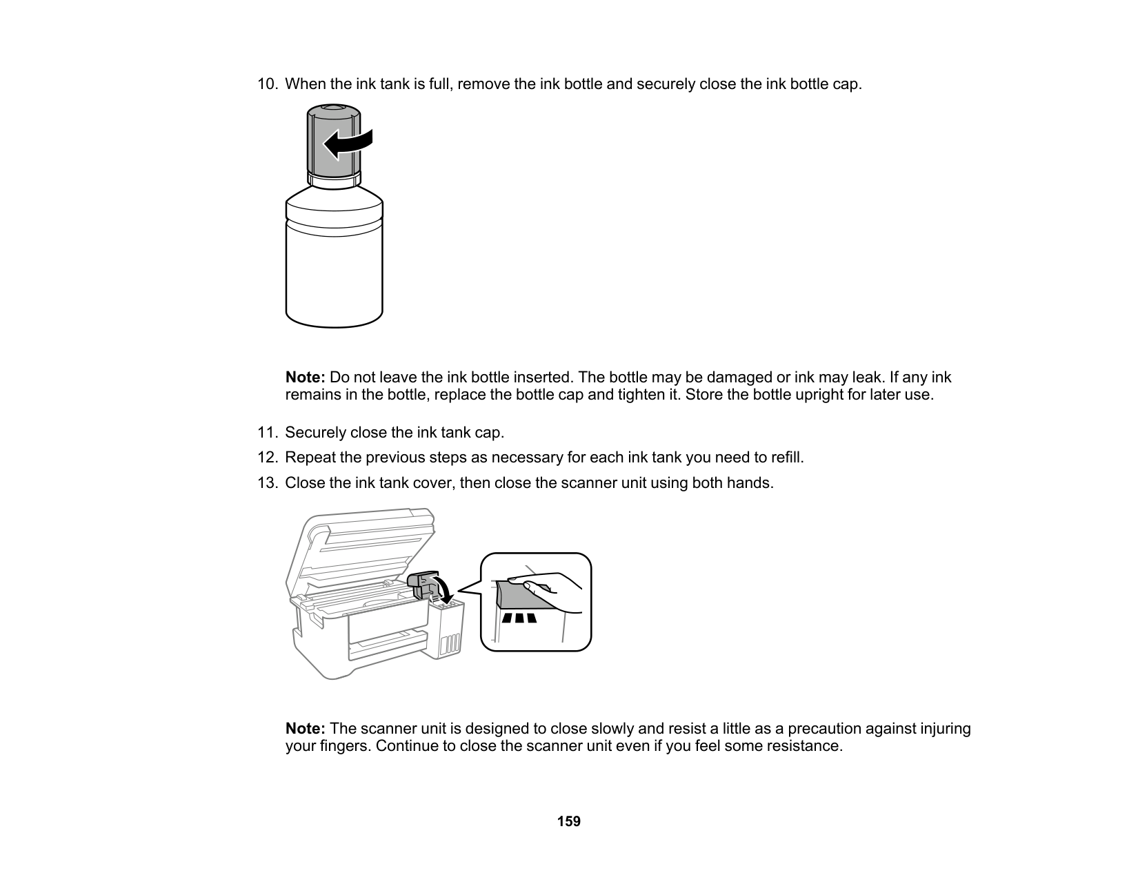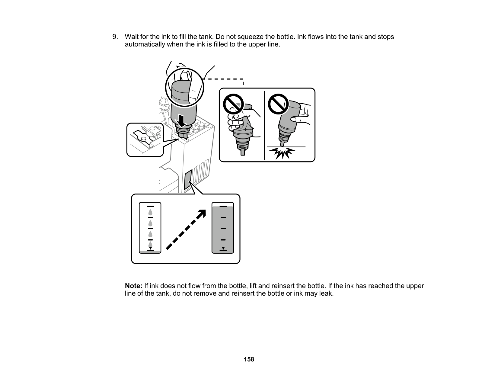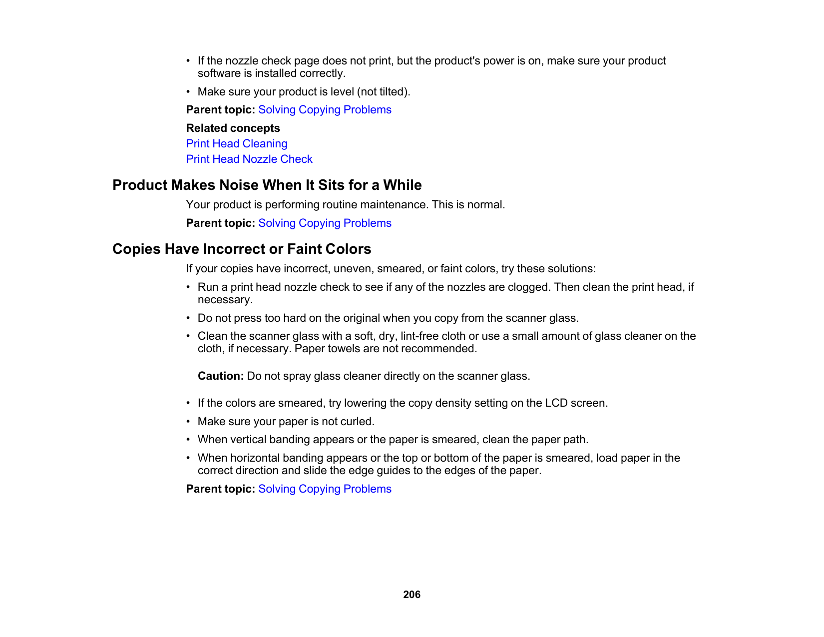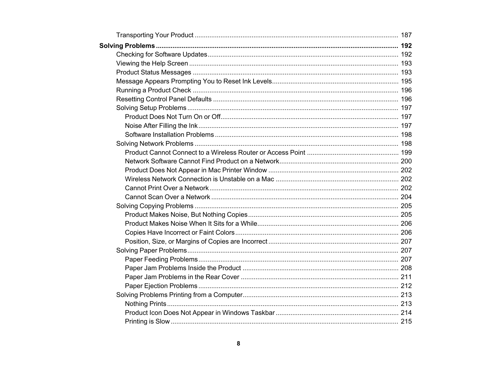 8 Transporting Your Product ............................................................................................................... 187 Solving Problems.................................................................................................................................... 192 Checking for Software Updates........................................................................................................ 192 Viewing the Help Screen .................................................................................................................. 193 Product Status Messages ................................................................................................................ 193 Message Appears Prompting You to Reset Ink Levels..................................................................... 195 Running a Product Check ................................................................................................................ 196 Resetting Control Panel Defaults ..................................................................................................... 196 Solving Setup Problems................................................................................................................... 197 Product Does Not Turn On or Off................................................................................................. 197 Noise After Filling the Ink............................................................................................................. 197 Software Installation Problems.................................................................................................... 198 Solving Network Problems ............................................................................................................... 198 Product Cannot Connect to a Wireless Router or Access Point .................................................. 199 Network Software Cannot Find Product on a Network................................................................. 200 Product Does Not Appear in Mac Printer Window ....................................................................... 202 Wireless Network Connection is Unstable on a Mac ................................................................... 202 Cannot Print Over a Network....................................................................................................... 202 Cannot Scan Over a Network ...................................................................................................... 204 Solving Copying Problems ............................................................................................................... 205 Product Makes Noise, But Nothing Copies.................................................................................. 205 Product Makes Noise When It Sits for a While............................................................................. 206 Copies Have Incorrect or Faint Colors......................................................................................... 206 Position, Size, or Margins of Copies are Incorrect ....................................................................... 207 Solving Paper Problems................................................................................................................... 207 Paper Feeding Problems............................................................................................................. 207 Paper Jam Problems Inside the Product ..................................................................................... 208 Paper Jam Problems in the Rear Cover ...................................................................................... 211 Paper Ejection Problems............................................................................................................. 212 Solving Problems Printing from a Computer..................................................................................... 213 Nothing Prints.............................................................................................................................. 213 Product Icon Does Not Appear in Windows Taskbar................................................................... 214 Printing is Slow............................................................................................................................ 215