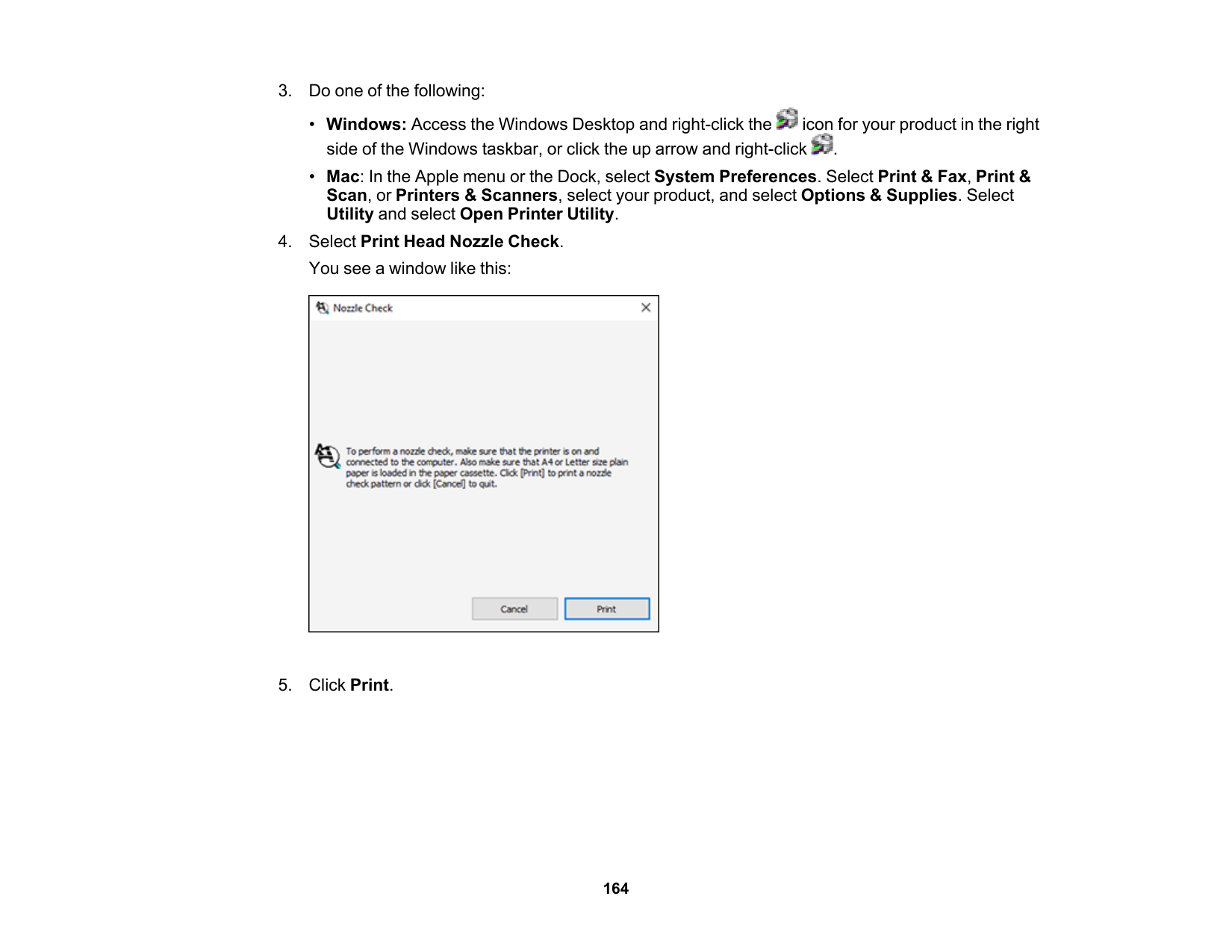 You can check the nozzles using the product control panel by selecting the appropriate menu option, or you can use a computer utility to perform the nozzle check. Detailed instructions for both methods are available on pages 161-163 of the manual.