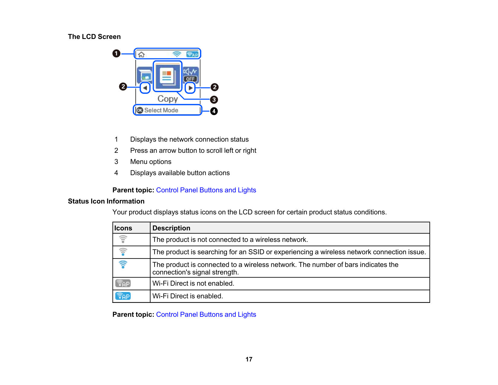 17 The LCD Screen 1 Displays the network connection status 2 Press an arrow button to scroll left or right 3 Menu options 4 Displays available button actions Parent topic: Control Panel Buttons and Lights Status Icon Information Your product displays status icons on the LCD screen for certain product status conditions. Icons Description The product is not connected to a wireless network. The product is searching for an SSID or experiencing a wireless network connection issue. The product is connected to a wireless network. The number of bars indicates the connection's signal strength. Wi-Fi Direct is not enabled. Wi-Fi Direct is enabled. Parent topic: Control Panel Buttons and Lights