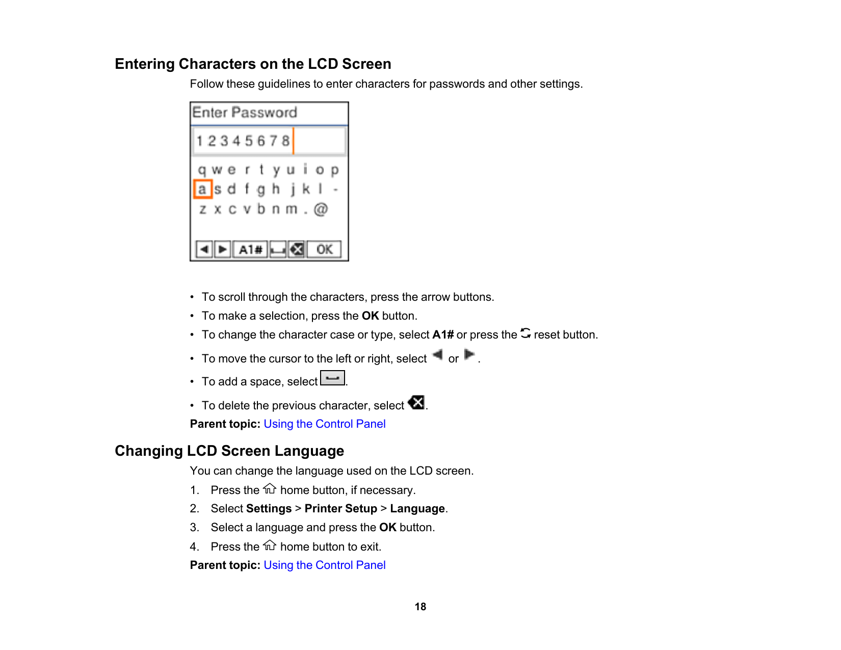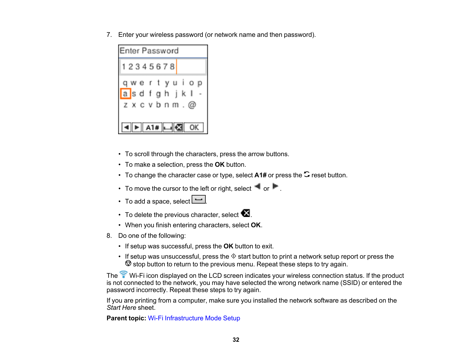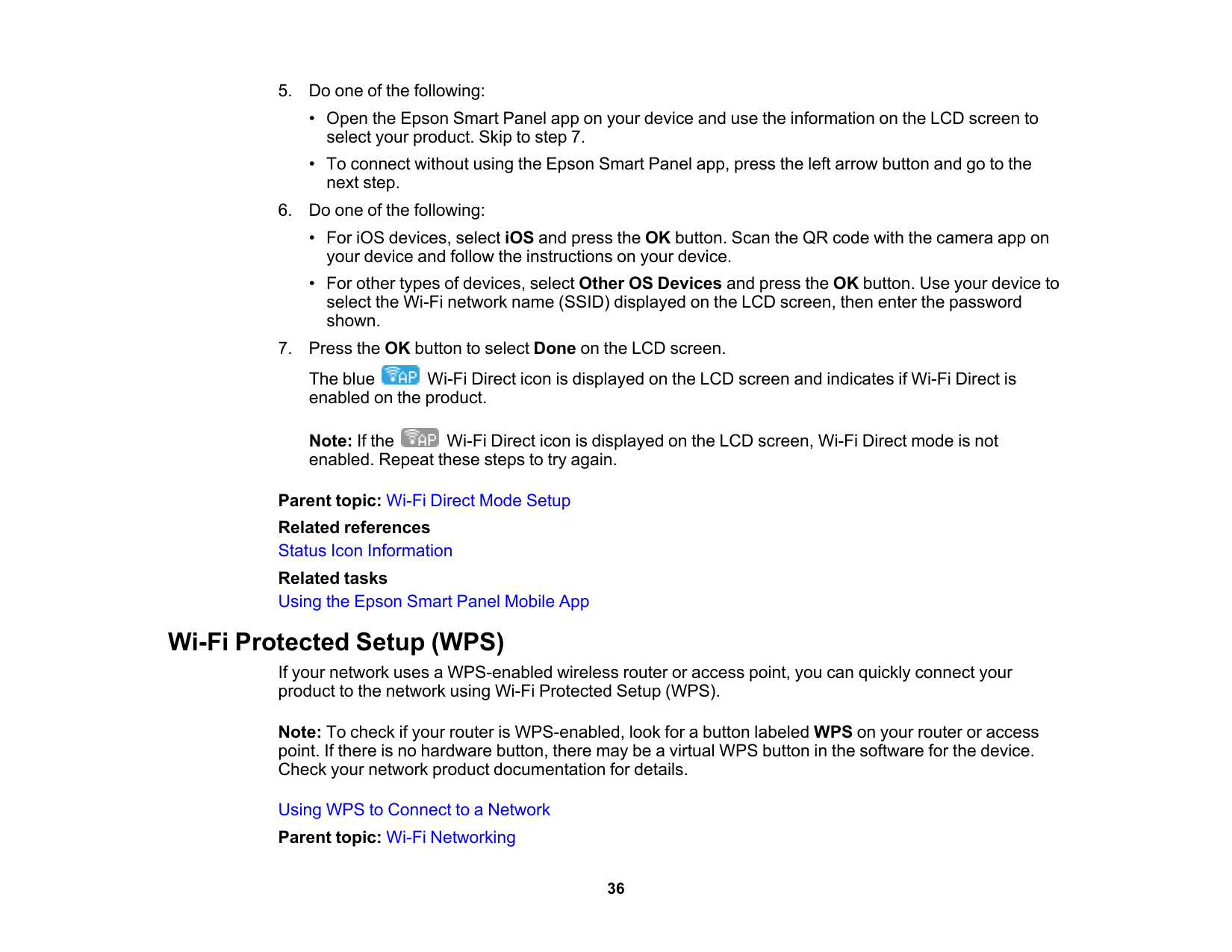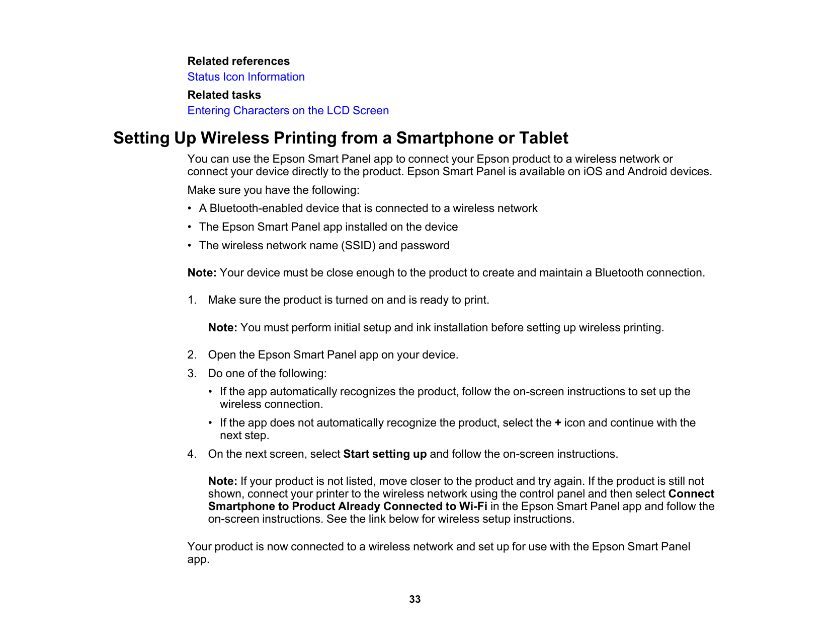 33 Related references Status Icon Information Related tasks Entering Characters on the LCD Screen Setting Up Wireless Printing from a Smartphone or Tablet You can use the Epson Smart Panel app to connect your Epson product to a wireless network or connect your device directly to the product. Epson Smart Panel is available on iOS and Android devices. Make sure you have the following: