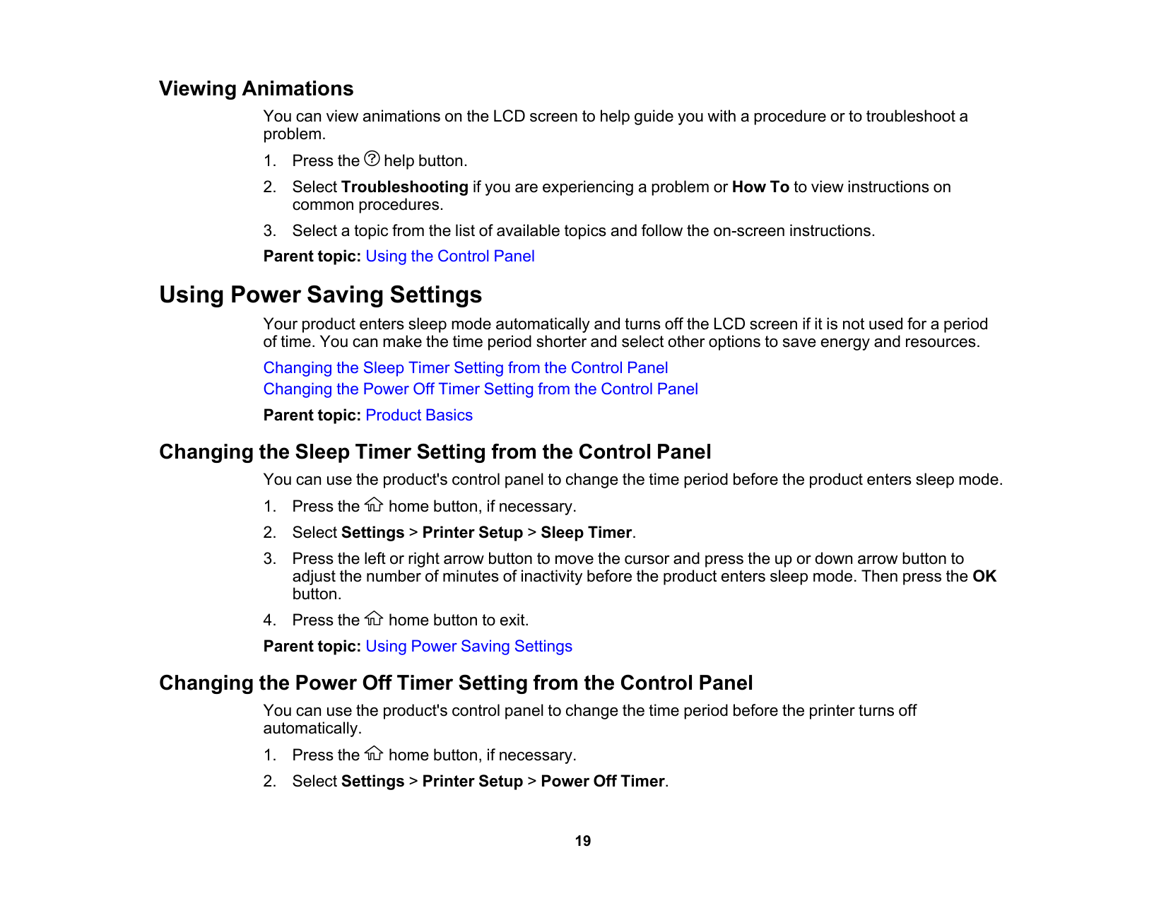 12 Product Basics See these sections to learn about the basic features of your product. Product Parts Locations Using the Control Panel Using Power Saving Settings Using the Epson Smart Panel Mobile App Voice-activated Printing Epson Connect Solutions for Smartphones, Tablets, and More Using AirPrint Setting Up Printing on a Chromebook Android Printing Using the Epson Print Enabler Using Fire OS Printing Using Windows 10 Mobile Printing Using Epson Print and Scan App with Windows Tablets Using the Mopria Print Service Product Parts Locations See these sections to identify the parts on your product. Product Parts - Front Product Parts - Inside Product Parts - Back Parent topic: Product Basics