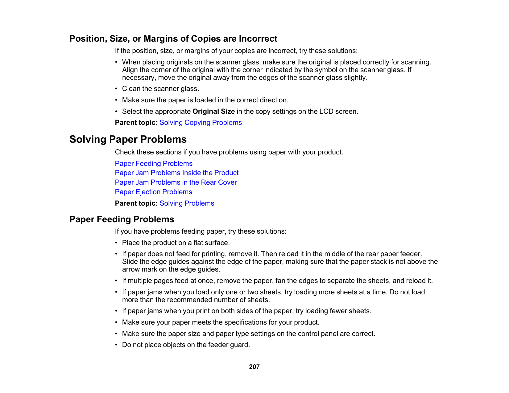 207 Position, Size, or Margins of Copies are Incorrect If the position, size, or margins of your copies are incorrect, try these solutions: