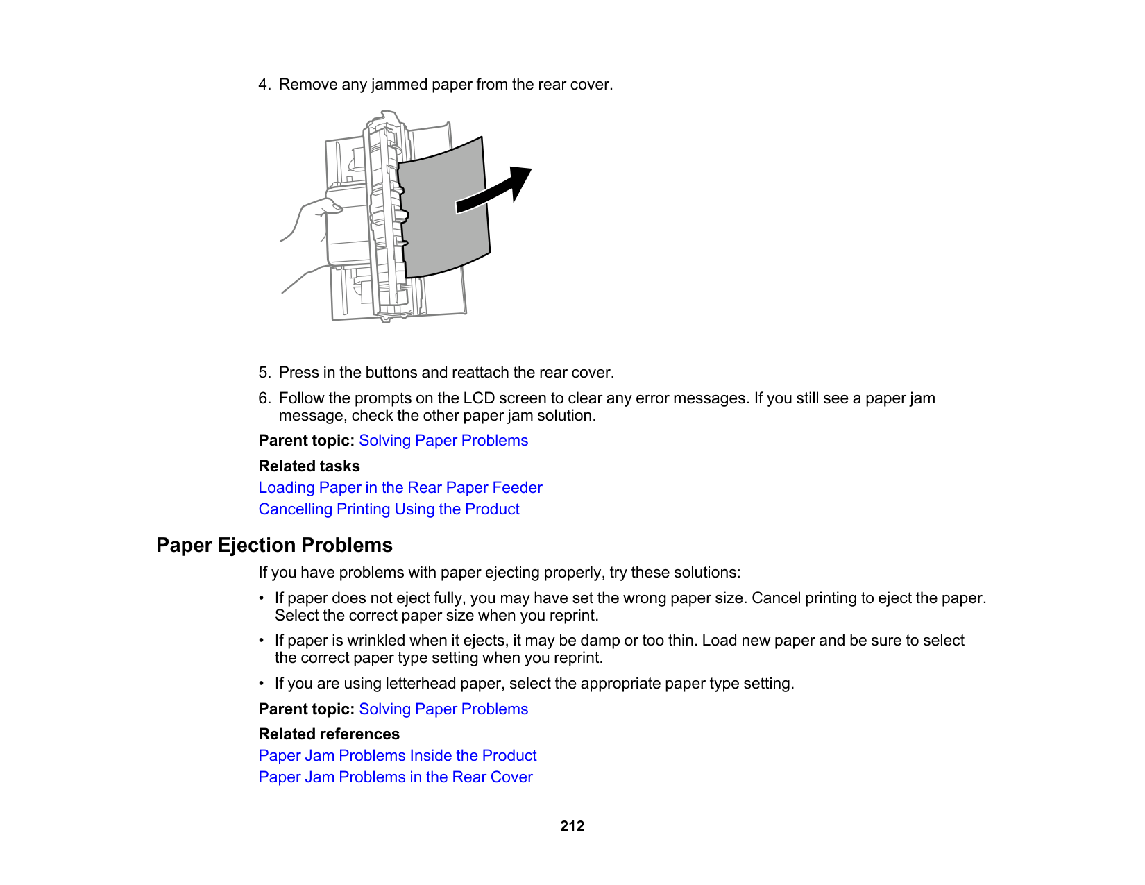 211 Paper Jam Problems in the Rear Cover If you see a message that paper has jammed in the rear cover, follow the steps here.