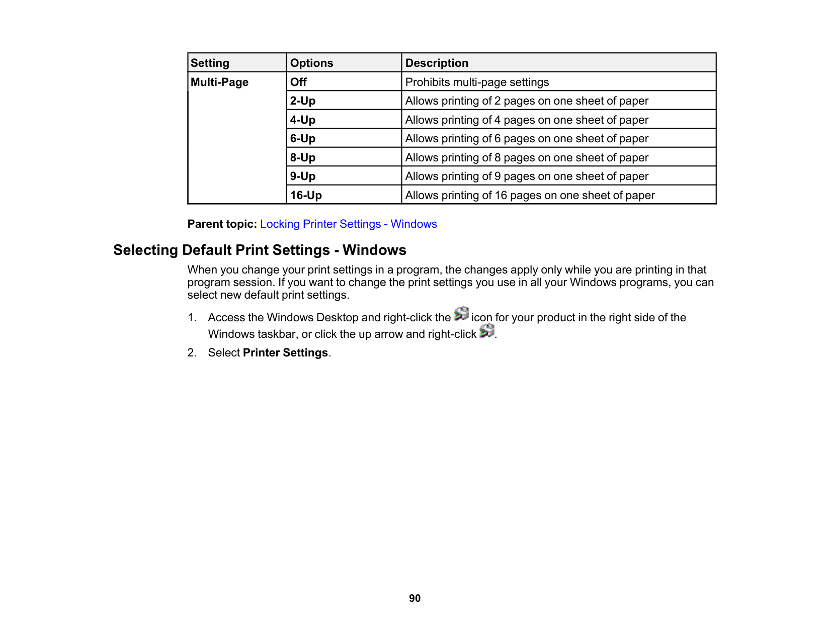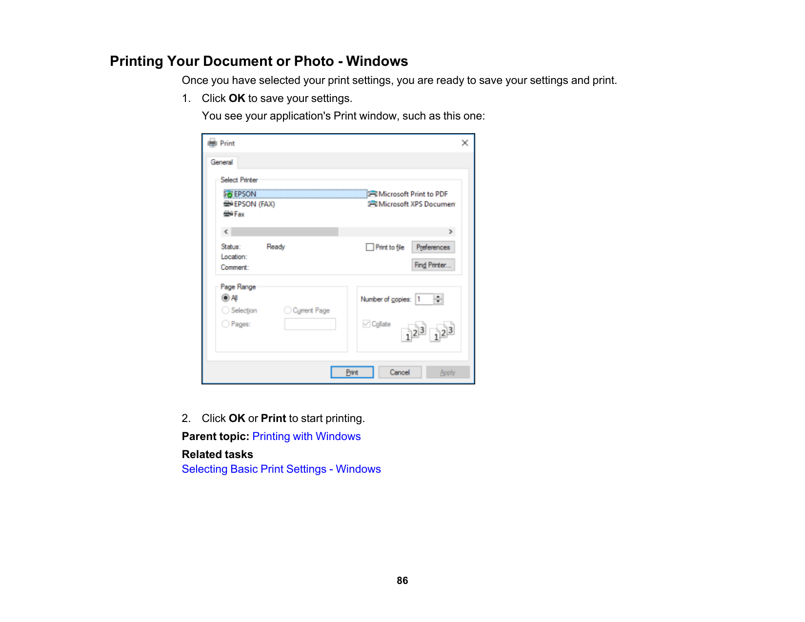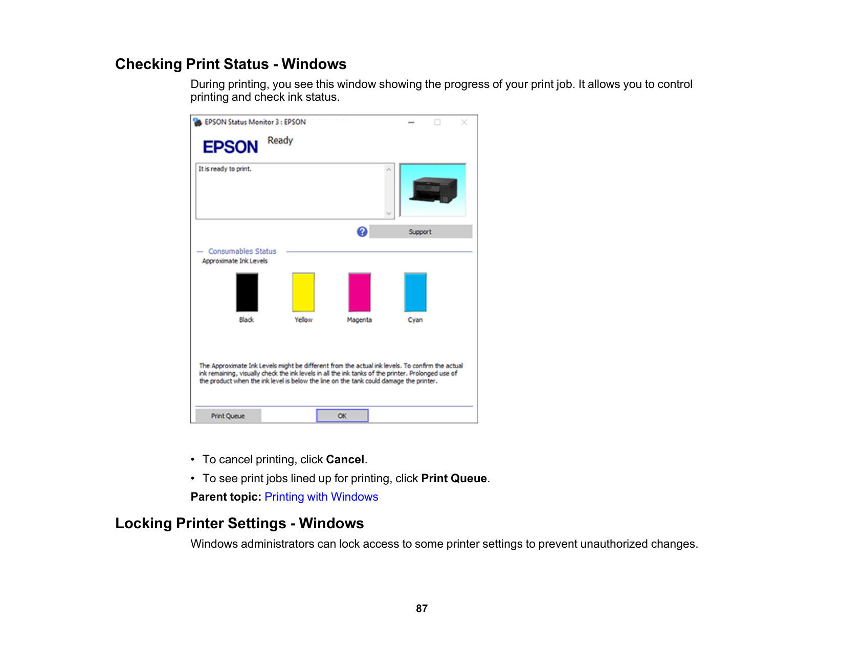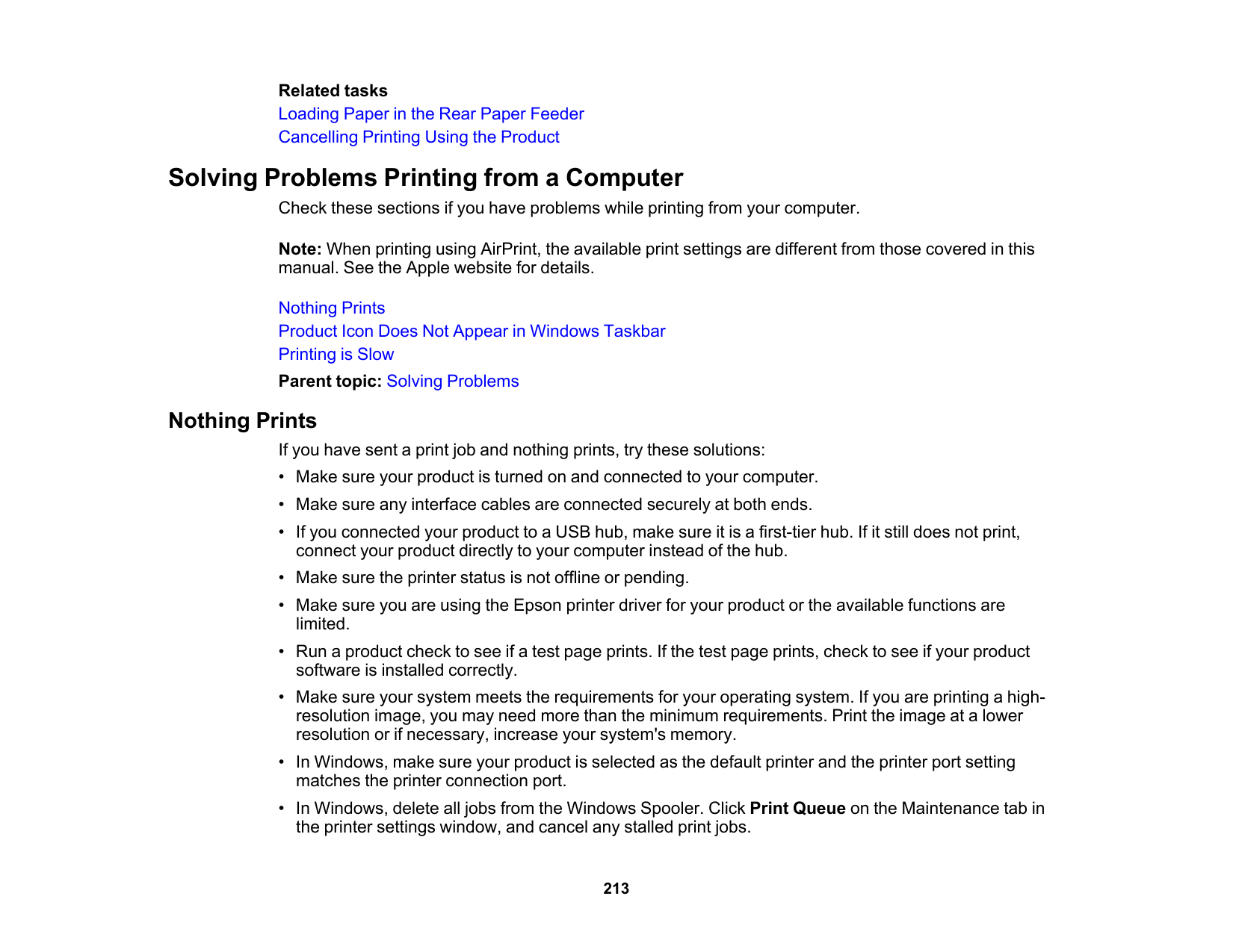 213 Related tasks Loading Paper in the Rear Paper Feeder Cancelling Printing Using the Product Solving Problems Printing from a Computer Check these sections if you have problems while printing from your computer. Note: When printing using AirPrint, the available print settings are different from those covered in this manual. See the Apple website for details. Nothing Prints Product Icon Does Not Appear in Windows Taskbar Printing is Slow Parent topic: Solving Problems Nothing Prints If you have sent a print job and nothing prints, try these solutions: