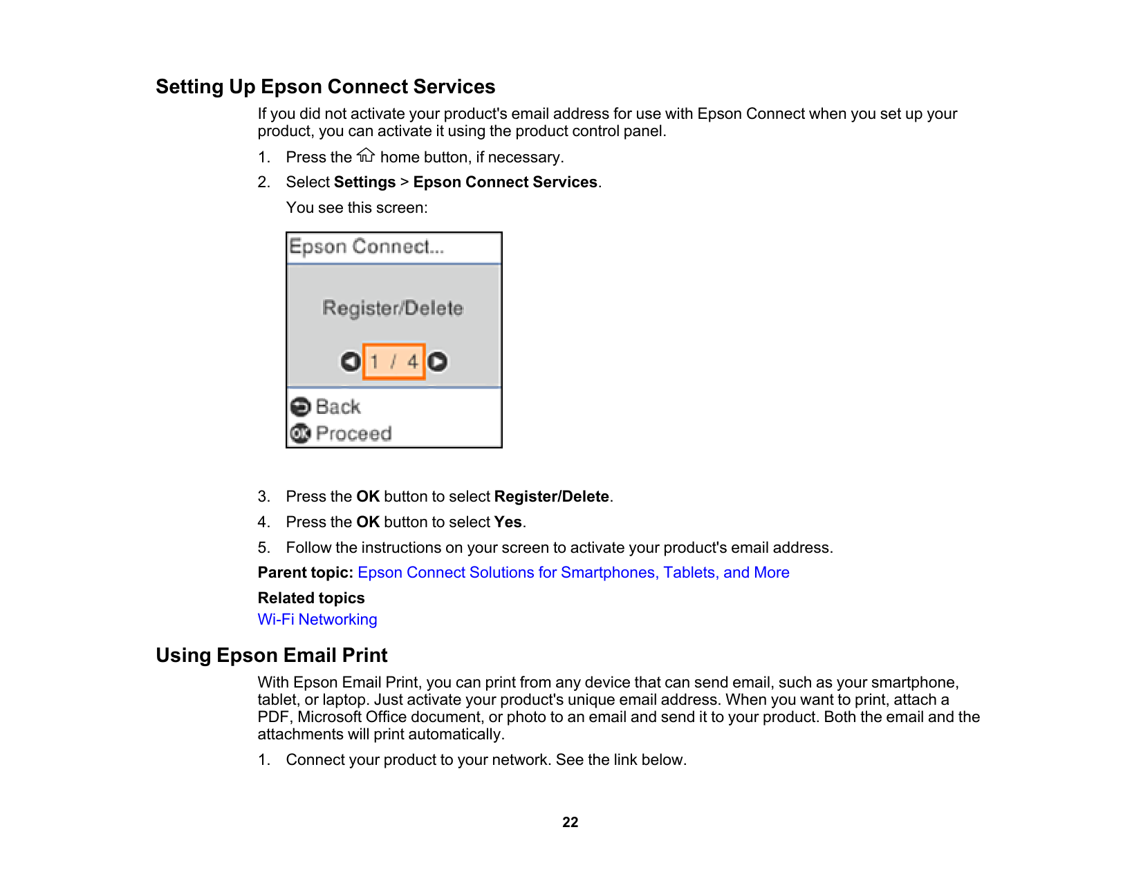22 Setting Up Epson Connect Services If you did not activate your product's email address for use with Epson Connect when you set up your product, you can activate it using the product control panel.