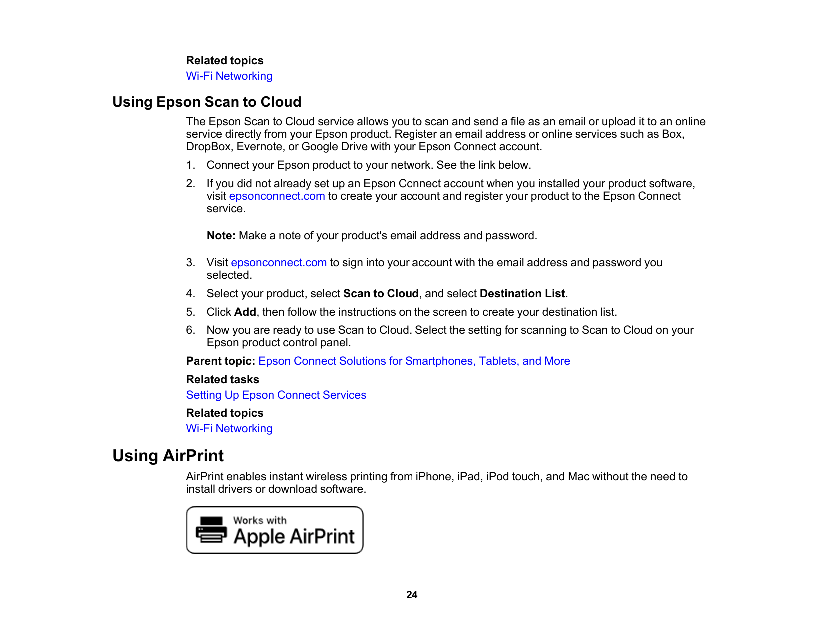 24 Related topics Wi-Fi Networking Using Epson Scan to Cloud The Epson Scan to Cloud service allows you to scan and send a file as an email or upload it to an online service directly from your Epson product. Register an email address or online services such as Box, DropBox, Evernote, or Google Drive with your Epson Connect account.