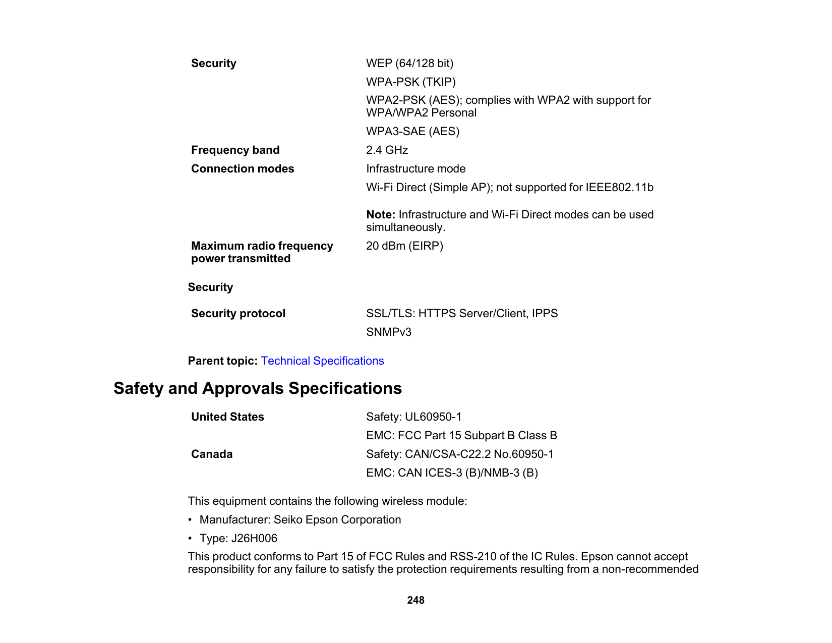 Frequency band 2.4 GHz Connection modes Infrastructure mode Wi-Fi Direct (Simple AP); not supported for IEEE802.11b Note: Infrastructure and Wi-Fi Direct modes can be used simultaneously. Maximum radio frequency power transmitted 20 dBm (EIRP) Security Security protocol SSL/TLS: HTTPS Server/Client, IPPS SNMPv3 Parent topic: Technical Specifications Safety and Approvals Specifications United States Safety: UL60950-1 EMC: FCC Part 15 Subpart B Class B Canada Safety: CAN/CSA-C22.2 No.60950-1Emc: Can Ices-3 (B)/Nmb-3 (B)