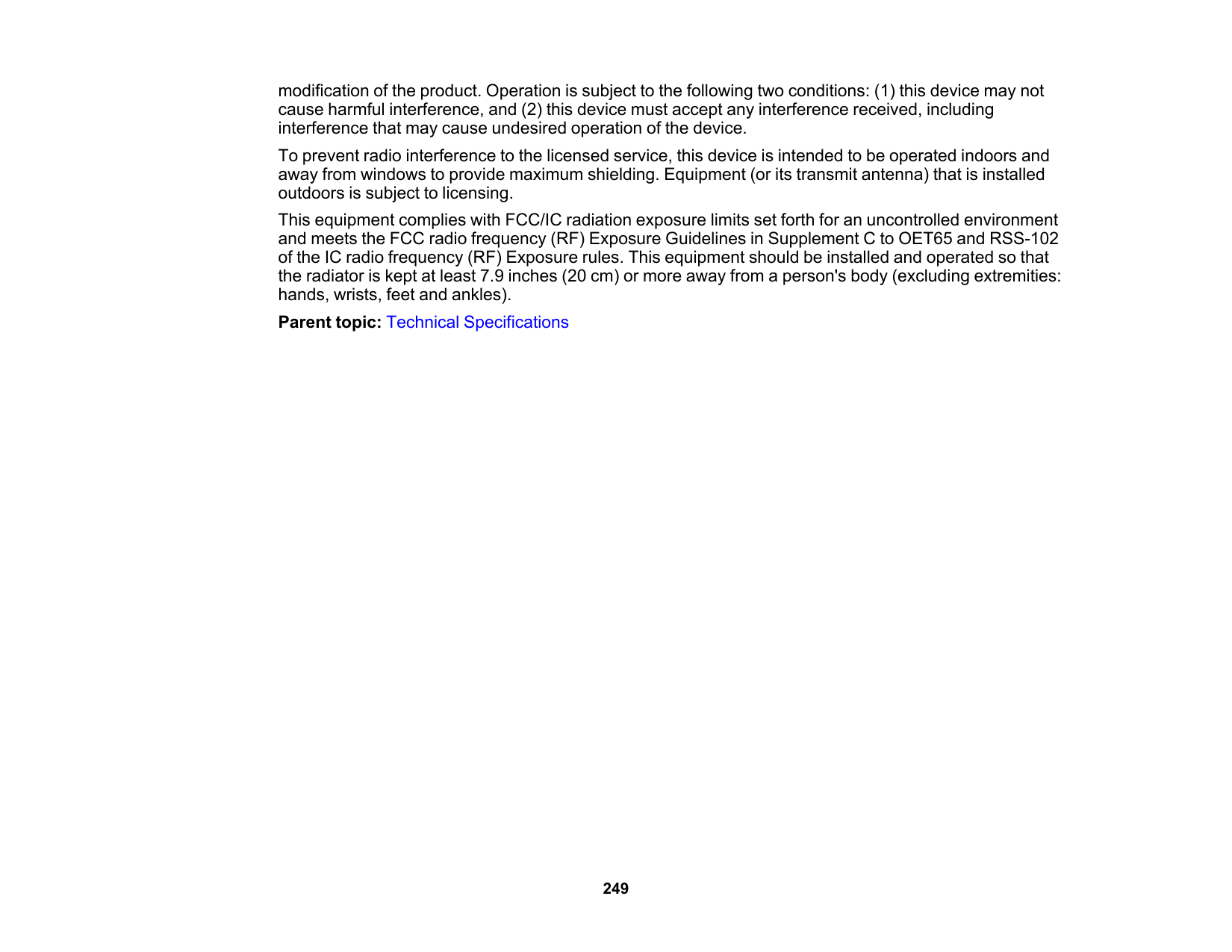 This equipment contains the following wireless module:249 modification of the product. Operation is subject to the following two conditions: (1) this device may not cause harmful interference, and (2) this device must accept any interference received, including interference that may cause undesired operation of the device. To prevent radio interference to the licensed service, this device is intended to be operated indoors and away from windows to provide maximum shielding. Equipment (or its transmit antenna) that is installed outdoors is subject to licensing. This equipment complies with FCC/IC radiation exposure limits set forth for an uncontrolled environment and meets the FCC radio frequency (RF) Exposure Guidelines in Supplement C to OET65 and RSS-102 of the IC radio frequency (RF) Exposure rules. This equipment should be installed and operated so that the radiator is kept at least 7.9 inches (20 cm) or more away from a person's body (excluding extremities: hands, wrists, feet and ankles). Parent topic: Technical Specifications