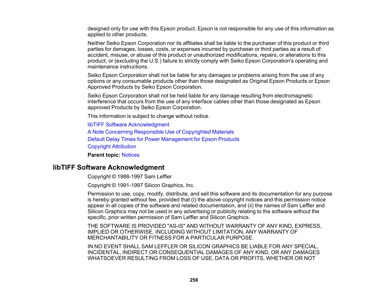 258 designed only for use with this Epson product. Epson is not responsible for any use of this information as applied to other products. Neither Seiko Epson Corporation nor its affiliates shall be liable to the purchaser of this product or third parties for damages, losses, costs, or expenses incurred by purchaser or third parties as a result of: accident, misuse, or abuse of this product or unauthorized modifications, repairs, or alterations to this product, or (excluding the U.S.) failure to strictly comply with Seiko Epson Corporation's operating and maintenance instructions. Seiko Epson Corporation shall not be liable for any damages or problems arising from the use of any options or any consumable products other than those designated as Original Epson Products or Epson Approved Products by Seiko Epson Corporation. Seiko Epson Corporation shall not be held liable for any damage resulting from electromagnetic interference that occurs from the use of any interface cables other than those designated as Epson approved Products by Seiko Epson Corporation. This information is subject to change without notice. libTIFF Software Acknowledgment A Note Concerning Responsible Use of Copyrighted Materials Default Delay Times for Power Management for Epson Products Copyright Attribution Parent topic: Notices libTIFF Software Acknowledgment Copyright © 1988-1997 Sam Leffler Copyright © 1991-1997 Silicon Graphics, Inc. Permission to use, copy, modify, distribute, and sell this software and its documentation for any purpose is hereby granted without fee, provided that (I) the above copyright notices and this permission notice appear in all copies of the software and related documentation, and (ii) the names of Sam Leffler and Silicon Graphics may not be used in any advertising or publicity relating to the software without the specific, prior written permission of Sam Leffler and Silicon Graphics.