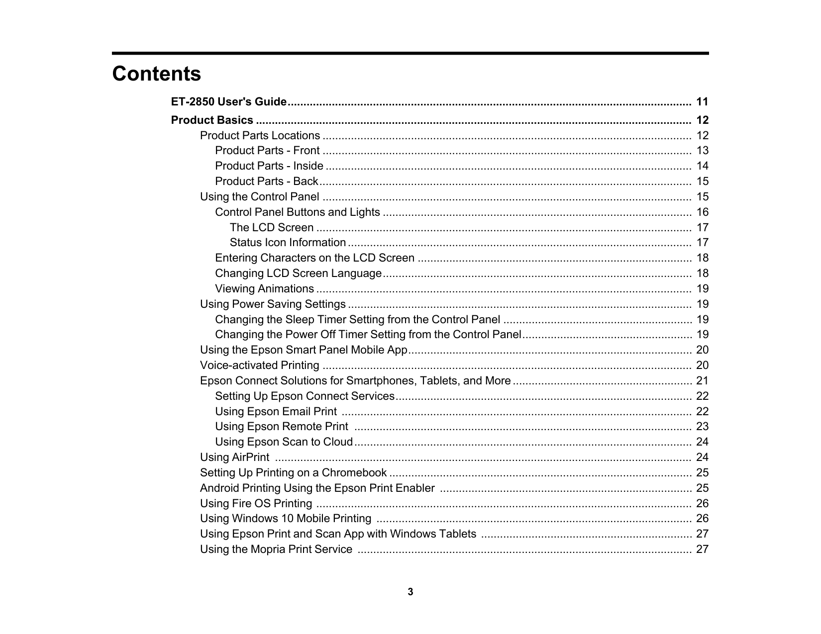 3 Contents ET-2850 User's Guide................................................................................................................................ 11 Product Basics .......................................................................................................................................... 12 Product Parts Locations ..................................................................................................................... 12 Product Parts - Front ..................................................................................................................... 13 Product Parts - Inside .................................................................................................................... 14 Product Parts - Back...................................................................................................................... 15 Using the Control Panel ..................................................................................................................... 15 Control Panel Buttons and Lights .................................................................................................. 16 The LCD Screen ....................................................................................................................... 17 Status Icon Information............................................................................................................. 17 Entering Characters on the LCD Screen ....................................................................................... 18 Changing LCD Screen Language.................................................................................................. 18 Viewing Animations ....................................................................................................................... 19 Using Power Saving Settings ............................................................................................................. 19 Changing the Sleep Timer Setting from the Control Panel ............................................................ 19 Changing the Power Off Timer Setting from the Control Panel...................................................... 19 Using the Epson Smart Panel Mobile App.......................................................................................... 20 Voice-activated Printing ..................................................................................................................... 20 Epson Connect Solutions for Smartphones, Tablets, and More......................................................... 21 Setting Up Epson Connect Services.............................................................................................. 22 Using Epson Email Print ............................................................................................................... 22 Using Epson Remote Print ........................................................................................................... 23 Using Epson Scan to Cloud........................................................................................................... 24 Using AirPrint .................................................................................................................................... 24 Setting Up Printing on a Chromebook ................................................................................................ 25 Android Printing Using the Epson Print Enabler ................................................................................ 25 Using Fire OS Printing ....................................................................................................................... 26 Using Windows 10 Mobile Printing .................................................................................................... 26 Using Epson Print and Scan App with Windows Tablets ................................................................... 27 Using the Mopria Print Service .......................................................................................................... 27