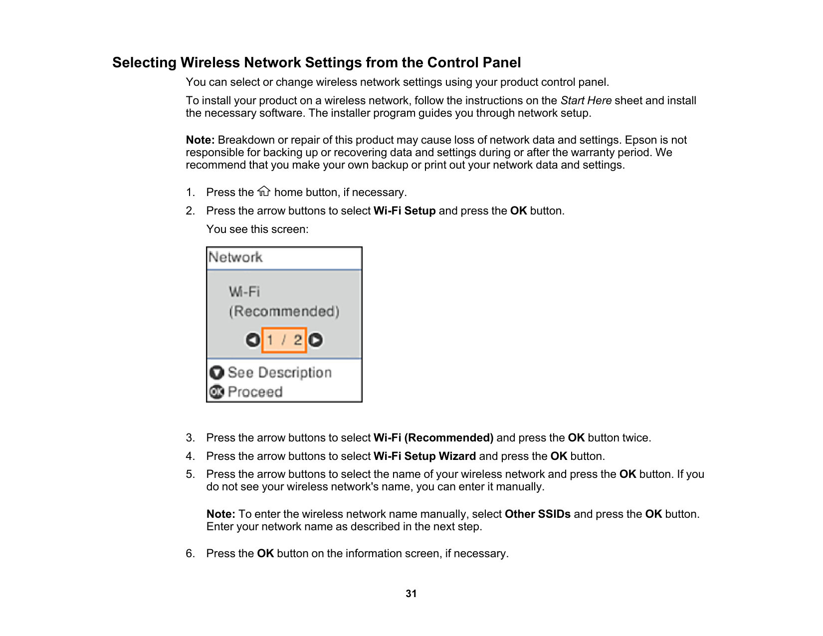 31 Selecting Wireless Network Settings from the Control Panel You can select or change wireless network settings using your product control panel. To install your product on a wireless network, follow the instructions on the Start Here sheet and install the necessary software. The installer program guides you through network setup. Note: Breakdown or repair of this product may cause loss of network data and settings. Epson is not responsible for backing up or recovering data and settings during or after the warranty period. We recommend that you make your own backup or print out your network data and settings.