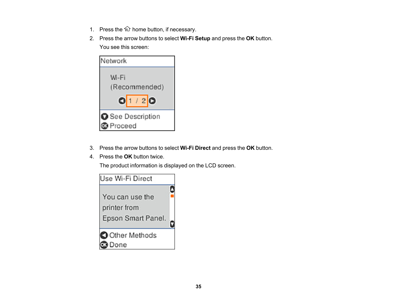 Press the home button, select Wi-Fi Setup, choose Wi-Fi Direct, and press OK twice. Product information will display on the LCD screen. You can then open the Epson Smart Panel app to connect your device, or manually select the Wi-Fi network name (SSID) and password displayed on the LCD screen. The blue Wi-Fi Direct icon will display when successfully enabled.