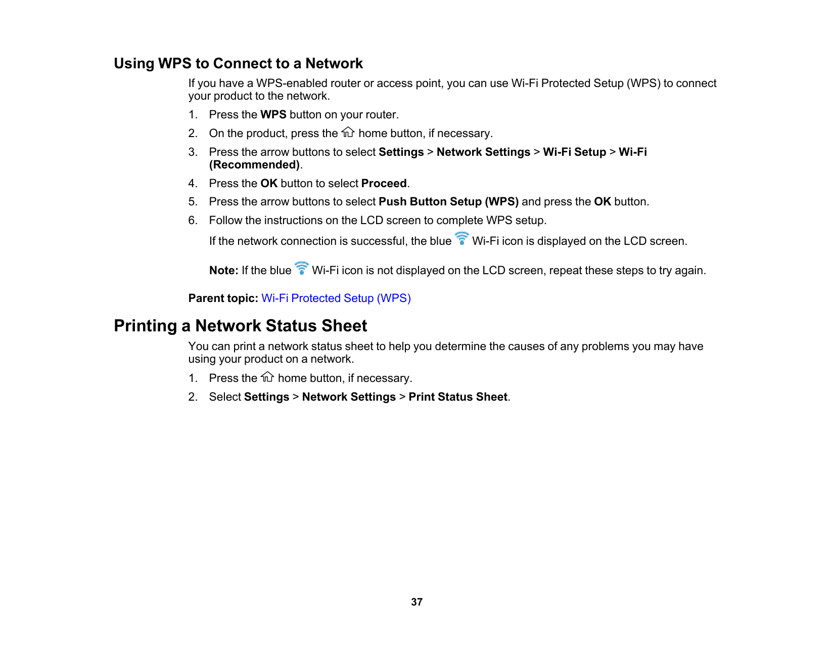 37 Using WPS to Connect to a Network If you have a WPS-enabled router or access point, you can use Wi-Fi Protected Setup (WPS) to connect your product to the network.