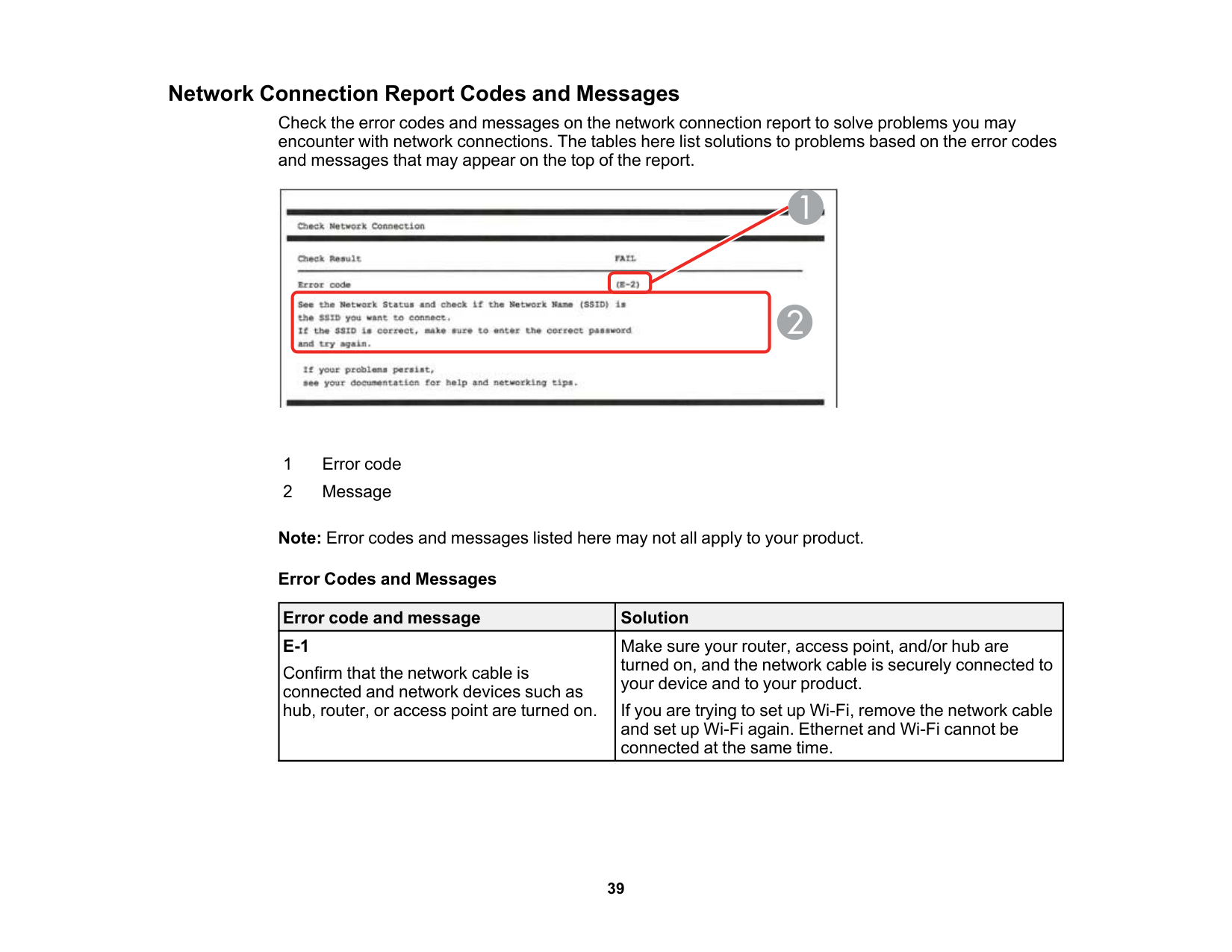 39 Network Connection Report Codes and Messages Check the error codes and messages on the network connection report to solve problems you may encounter with network connections. The tables here list solutions to problems based on the error codes and messages that may appear on the top of the report. 1 Error code 2 Message Note: Error codes and messages listed here may not all apply to your product. Error Codes and Messages Error code and message Solution