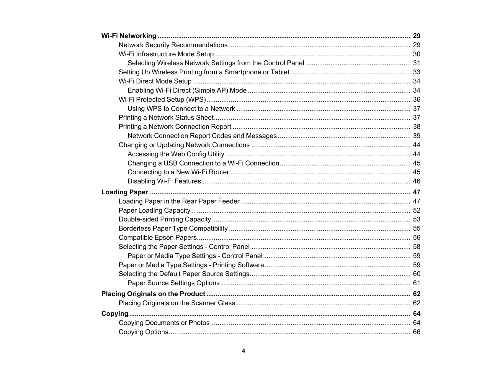 4 Wi-Fi Networking ....................................................................................................................................... 29 Network Security Recommendations ................................................................................................. 29 Wi-Fi Infrastructure Mode Setup......................................................................................................... 30 Selecting Wireless Network Settings from the Control Panel ........................................................ 31 Setting Up Wireless Printing from a Smartphone or Tablet ................................................................ 33 Wi-Fi Direct Mode Setup .................................................................................................................... 34 Enabling Wi-Fi Direct (Simple AP) Mode....................................................................................... 34 Wi-Fi Protected Setup (WPS)............................................................................................................. 36 Using WPS to Connect to a Network ............................................................................................. 37 Printing a Network Status Sheet......................................................................................................... 37 Printing a Network Connection Report ............................................................................................... 38 Network Connection Report Codes and Messages....................................................................... 39 Changing or Updating Network Connections ..................................................................................... 44 Accessing the Web Config Utility................................................................................................... 44 Changing a USB Connection to a Wi-Fi Connection...................................................................... 45 Connecting to a New Wi-Fi Router ................................................................................................ 45 Disabling Wi-Fi Features ............................................................................................................... 46 Loading Paper ........................................................................................................................................... 47 Loading Paper in the Rear Paper Feeder........................................................................................... 47 Paper Loading Capacity..................................................................................................................... 52 Double-sided Printing Capacity.......................................................................................................... 53 Borderless Paper Type Compatibility ................................................................................................. 55 Compatible Epson Papers.................................................................................................................. 56 Selecting the Paper Settings - Control Panel ..................................................................................... 58 Paper or Media Type Settings - Control Panel .............................................................................. 59 Paper or Media Type Settings - Printing Software.............................................................................. 59 Selecting the Default Paper Source Settings...................................................................................... 60 Paper Source Settings Options ..................................................................................................... 61 Placing Originals on the Product ............................................................................................................. 62 Placing Originals on the Scanner Glass ............................................................................................. 62 Copying...................................................................................................................................................... 64 Copying Documents or Photos........................................................................................................... 64 Copying Options................................................................................................................................. 66