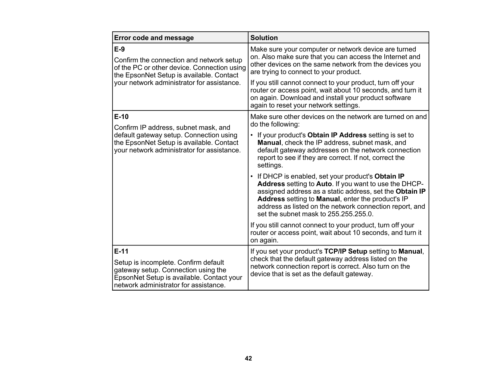 Confirm IP address, subnet mask, and default gateway setup. Connection using the EpsonNet Setup is available. Contact your network administrator for assistance. Make sure other devices on the network are turned on and do the following:E-11