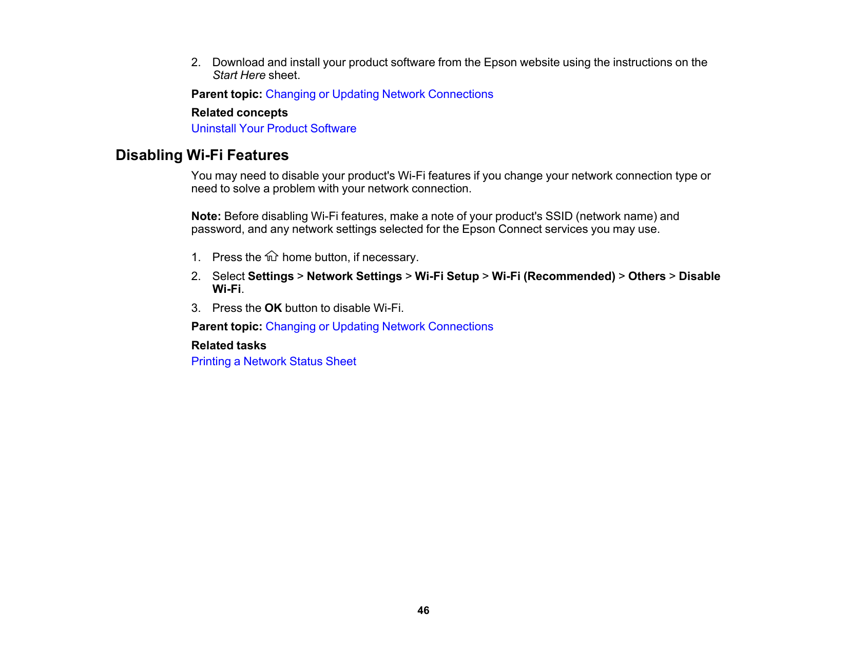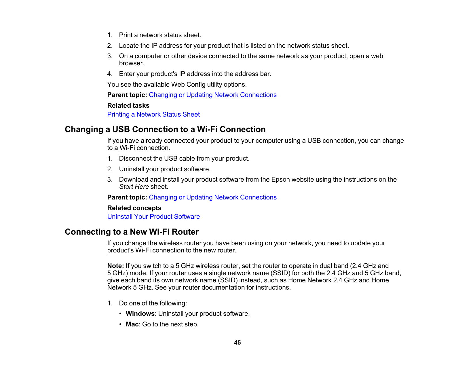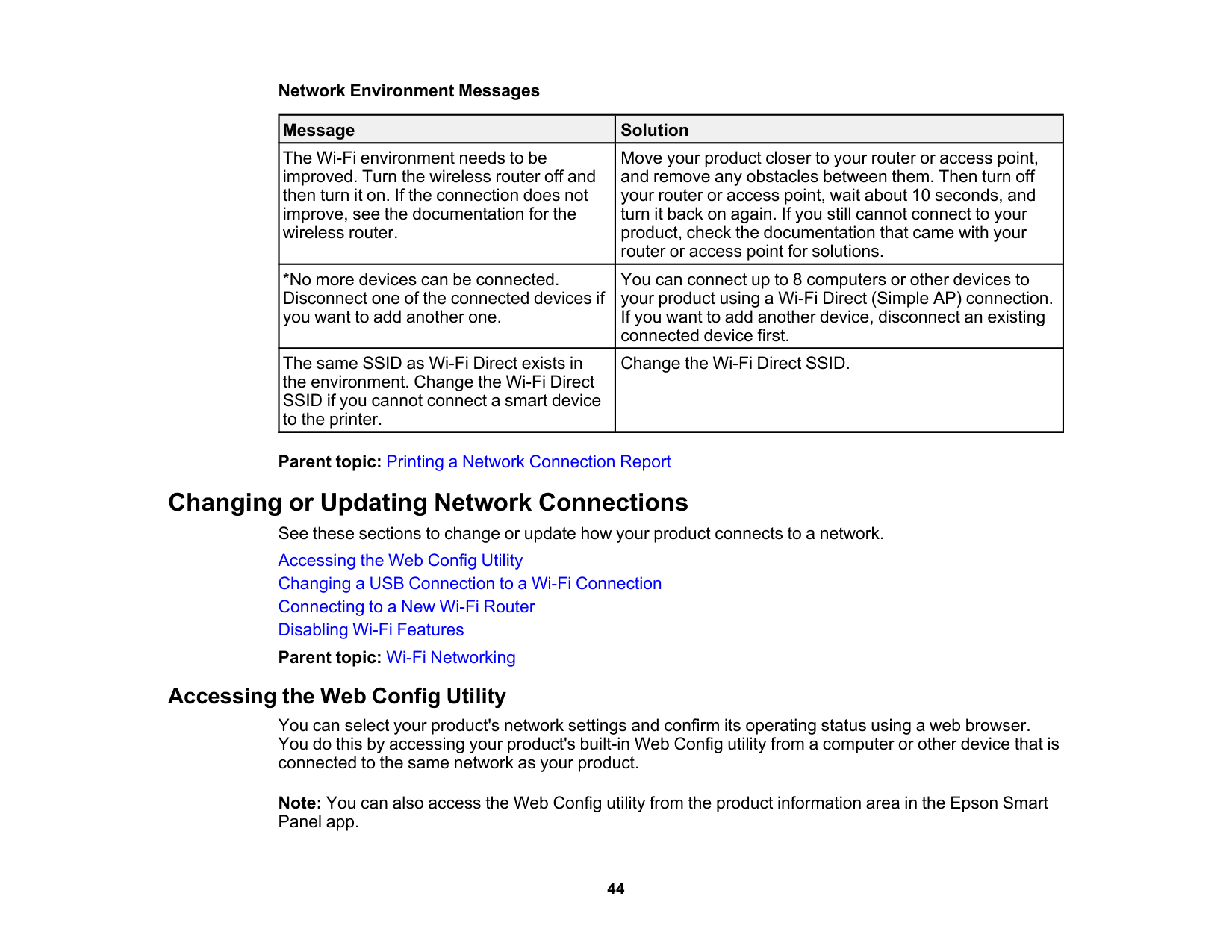 Confirm the following: -Entered security key/password is correct -Index of the security key/password is set to the first number -Connection and network setup of the PC or other device is correct Contact your network administrator for assistance. Make sure your router, access point, and/or hub are turned on. Also make sure the TCP/IP setup on your router, access point, and/or hub is not set manually; this may cause your product's network settings to differ from the manually set up devices. If you still cannot connect to your product, do the following:44 Network Environment Messages Message Solution The Wi-Fi environment needs to be improved. Turn the wireless router off and then turn it on. If the connection does not improve, see the documentation for the wireless router. Move your product closer to your router or access point, and remove any obstacles between them. Then turn off your router or access point, wait about 10 seconds, and turn it back on again. If you still cannot connect to your product, check the documentation that came with your router or access point for solutions. *No more devices can be connected. Disconnect one of the connected devices if you want to add another one. You can connect up to 8 computers or other devices to your product using a Wi-Fi Direct (Simple AP) connection. If you want to add another device, disconnect an existing connected device first. The same SSID as Wi-Fi Direct exists in the environment. Change the Wi-Fi Direct SSID if you cannot connect a smart device to the printer. Change the Wi-Fi Direct SSID. Parent topic: Printing a Network Connection Report Changing or Updating Network Connections See these sections to change or update how your product connects to a network. Accessing the Web Config Utility Changing a USB Connection to a Wi-Fi Connection Connecting to a New Wi-Fi Router Disabling Wi-Fi Features Parent topic: Wi-Fi Networking Accessing the Web Config Utility You can select your product's network settings and confirm its operating status using a web browser. You do this by accessing your product's built-in Web Config utility from a computer or other device that is connected to the same network as your product. Note: You can also access the Web Config utility from the product information area in the Epson Smart Panel app.