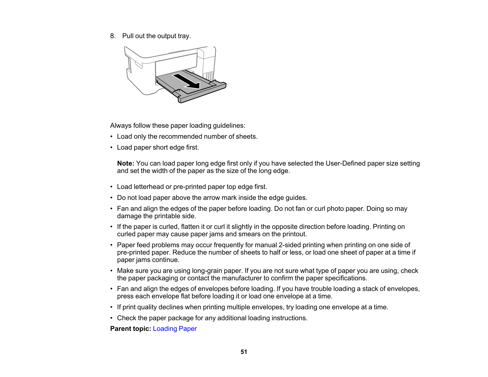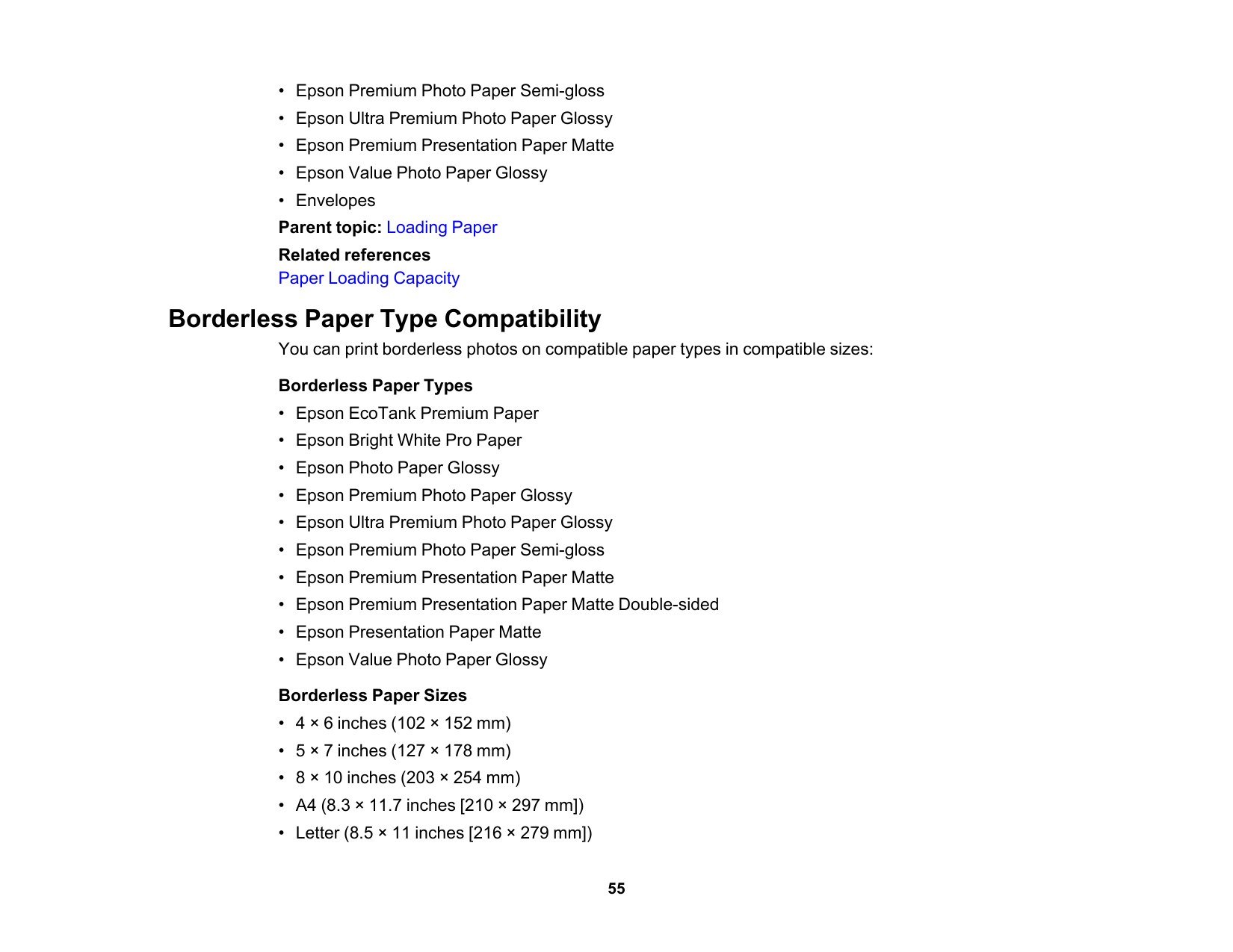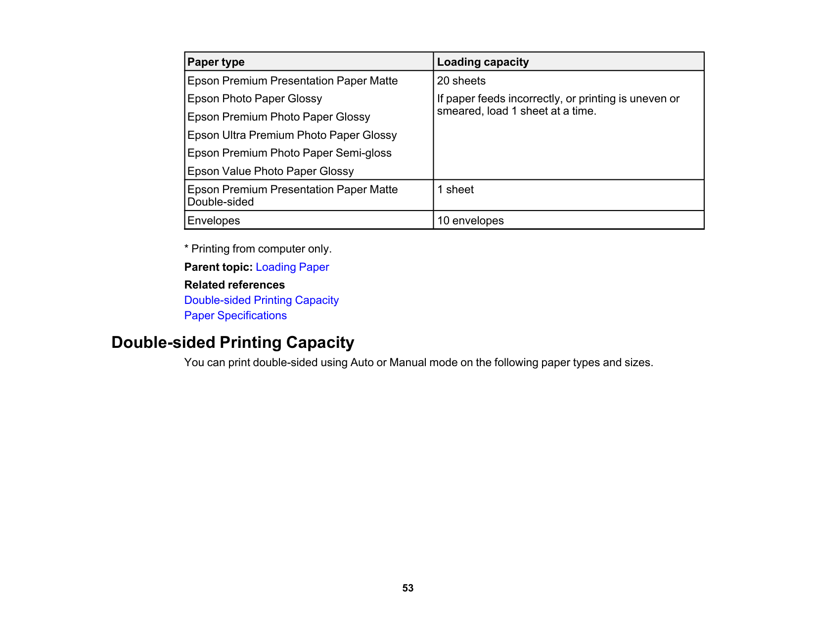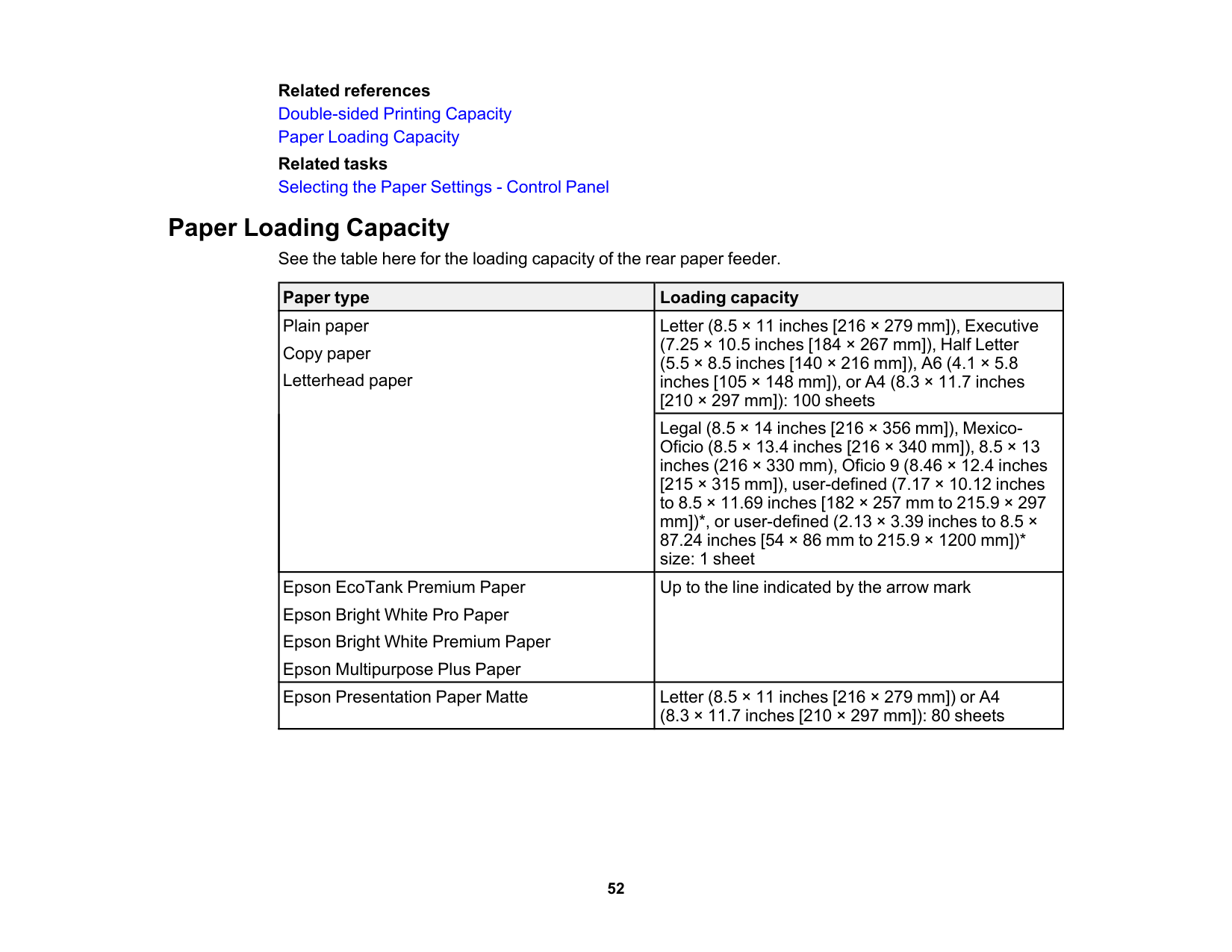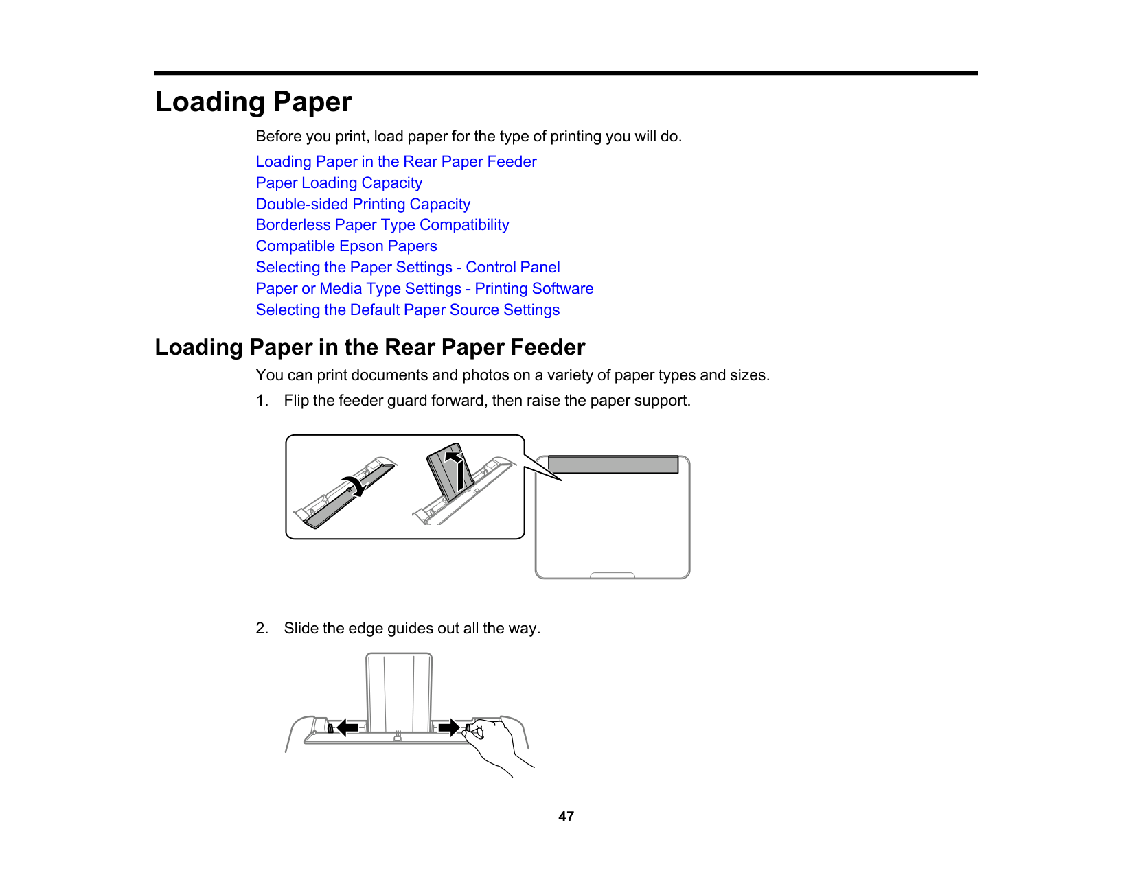 47 Loading Paper Before you print, load paper for the type of printing you will do. Loading Paper in the Rear Paper Feeder Paper Loading Capacity Double-sided Printing Capacity Borderless Paper Type Compatibility Compatible Epson Papers Selecting the Paper Settings - Control Panel Paper or Media Type Settings - Printing Software Selecting the Default Paper Source Settings Loading Paper in the Rear Paper Feeder You can print documents and photos on a variety of paper types and sizes.