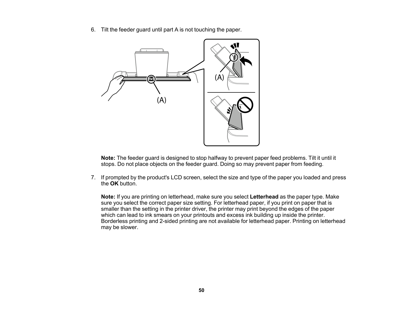 Flip the feeder guard forward and raise the paper support. Slide the edge guides out, then fan and align your paper sheets. Insert paper glossy or printable side up and short edge first at the center of the paper support. Slide the edge guides against the paper (not too tightly), tilt the feeder guard, and when prompted on the LCD screen, select the paper size and type and press OK.