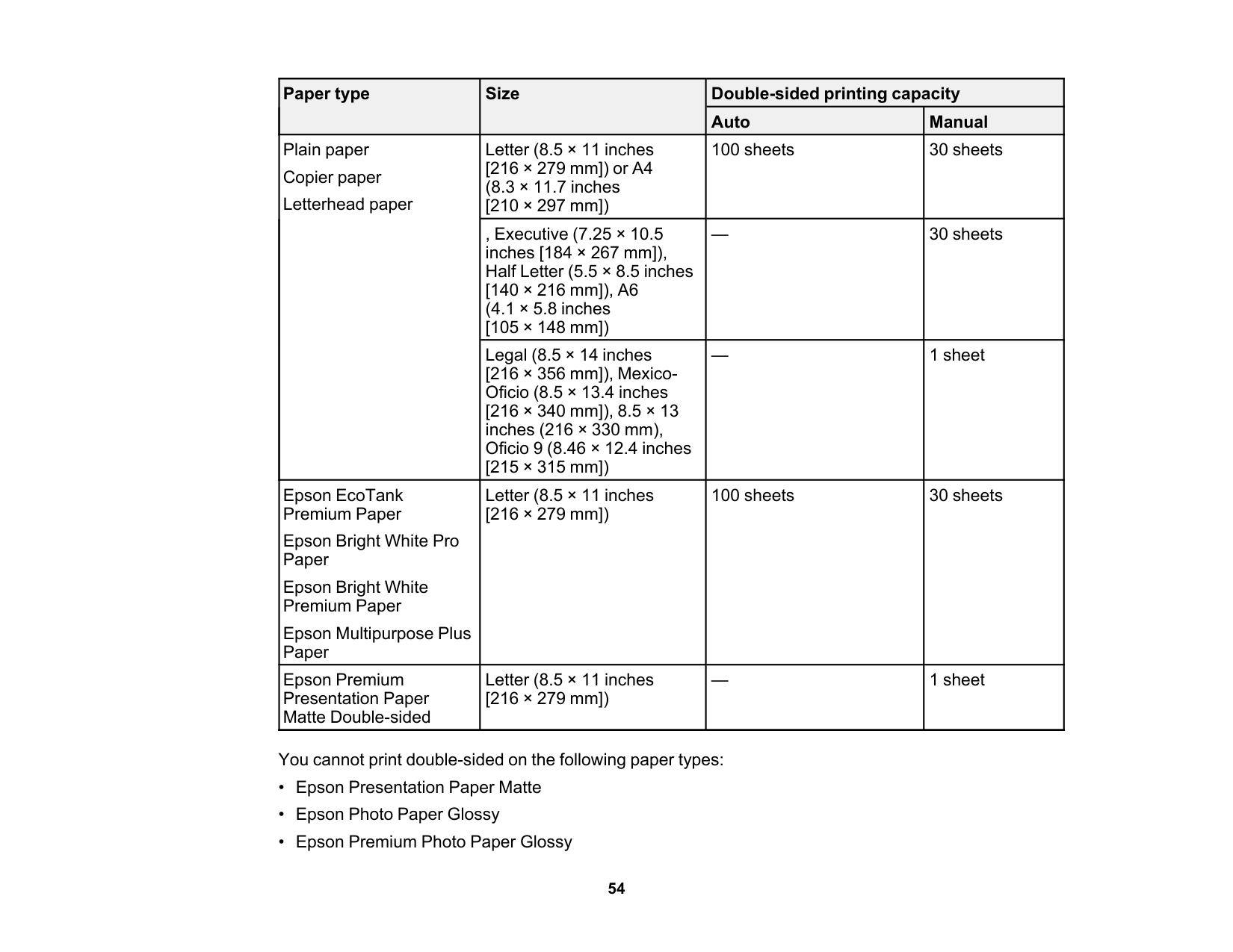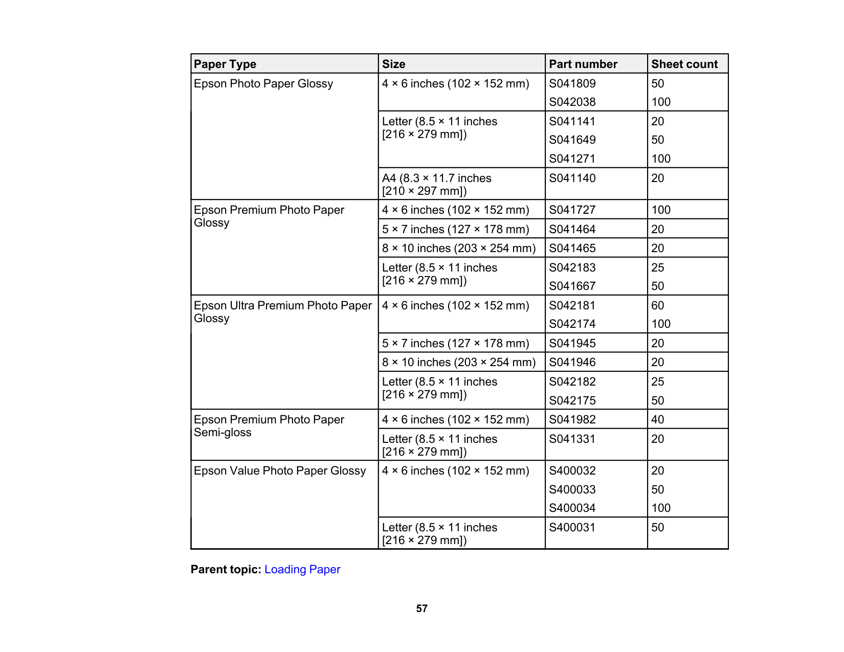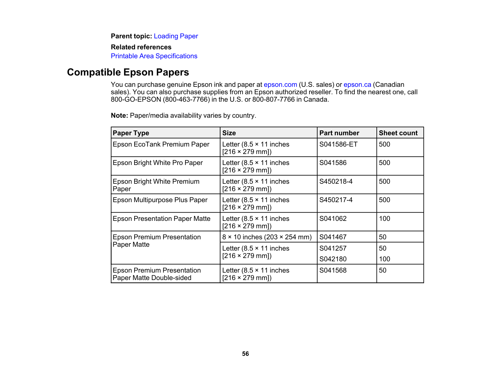 Note: For the latest product software available for your operating system, visit the Epson support site at epson.com/support (U.S.) or epson.ca/support (Canada), select your product, and select Downloads. Parent topic: Technical Specifications242 Paper Specifications Note: Since the quality of any particular brand or type of paper may be changed by the manufacturer at any time, Epson cannot guarantee the quality of any non-Epson brand or type of paper. Always test a sample of paper stock before purchasing large quantities or printing large jobs. Single-sheets Size A4 (8.3 × 11.7 inches [210 × 297 mm]) A6 (4.1 × 5.8 inches [105 × 148 mm]) Letter (8.5 × 11 inches [216 × 279 mm]) Legal (8.5 × 14 inches [216 × 356 mm]) 8.5 × 13 inches (216 × 330 mm) 4 × 6 inches (102 × 152 mm) 5 × 7 inches (127 × 178 mm) 8 × 10 inches (203 × 254 mm) Executive (7.25 × 10.5 inches [184 × 267 mm]) Half Letter (5.5 × 8.5 inches [140 × 216 mm]) Mexico-Oficio (8.5 × 13.4 inches [216 × 340 mm]) Oficio 9 (8.46 × 12.4 inches [215 × 315 mm]) Paper types Plain paper Note: Your product also supports compatible papers distributed by Epson. Select the link at the end of this topic to view a list of compatible Epson papers. Weight* Plain paper: 17 lb (64 g/m2) to 24 lb (90 g/m2) Envelopes Size No. 10 (4.1 × 9.5 inches [105 × 241 mm]) Paper types Plain bond paper Weight* 20 lb (75 g/m2) to 27 lb (100 g/m2)