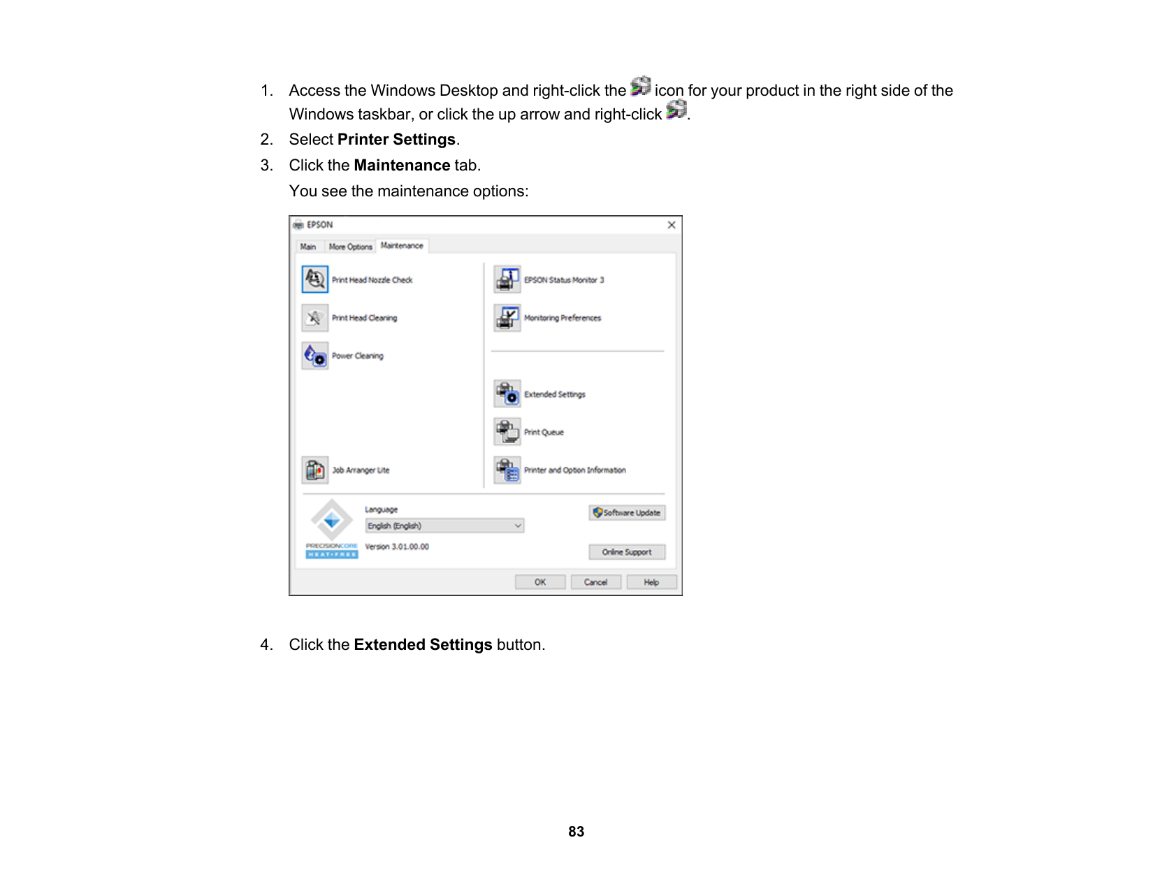 Your computer may not support WSD (Web Services for Devices). The Scan to PC (WSD) function is available only for computers running English versions of Windows 10, Windows 8.x, Windows 7, or Windows Vista. Recovery Mode Update Firmware A firmware update has failed. Connect your product using a USB cable and try updating the firmware again. If you still receive this error message, contact Epson for support. Note: The ink pads in the printer collect, distribute, and contain the ink that is not used on printed pages. During the life of your product it may reach a condition where either satisfactory print quality cannot be maintained or the ink pads have reached the end of their usable life. The Epson Status Monitor, your LCD screen, or lights on the control panel will advise you when these parts need replacing. If this happens during the standard warranty of the product, the exchange of the product or replacement of the pads is covered under the standard warranty. If the product is out of warranty, the pads can be replaced by any Epson authorized service provider. The waste ink pads are not a user-replaceable part. Parent topic: Solving Problems195 Related concepts Uninstall Your Product Software Related references Where to Get Help Related tasks Refilling the Ink Tanks Checking for Software Updates Using AirPrint Related topics Wi-Fi Networking Solving Paper Problems Solving Network Problems Solving Problems Printing from a Computer Message Appears Prompting You to Reset Ink Levels If you see a message on the LCD screen prompting you to reset the ink levels, do the following: