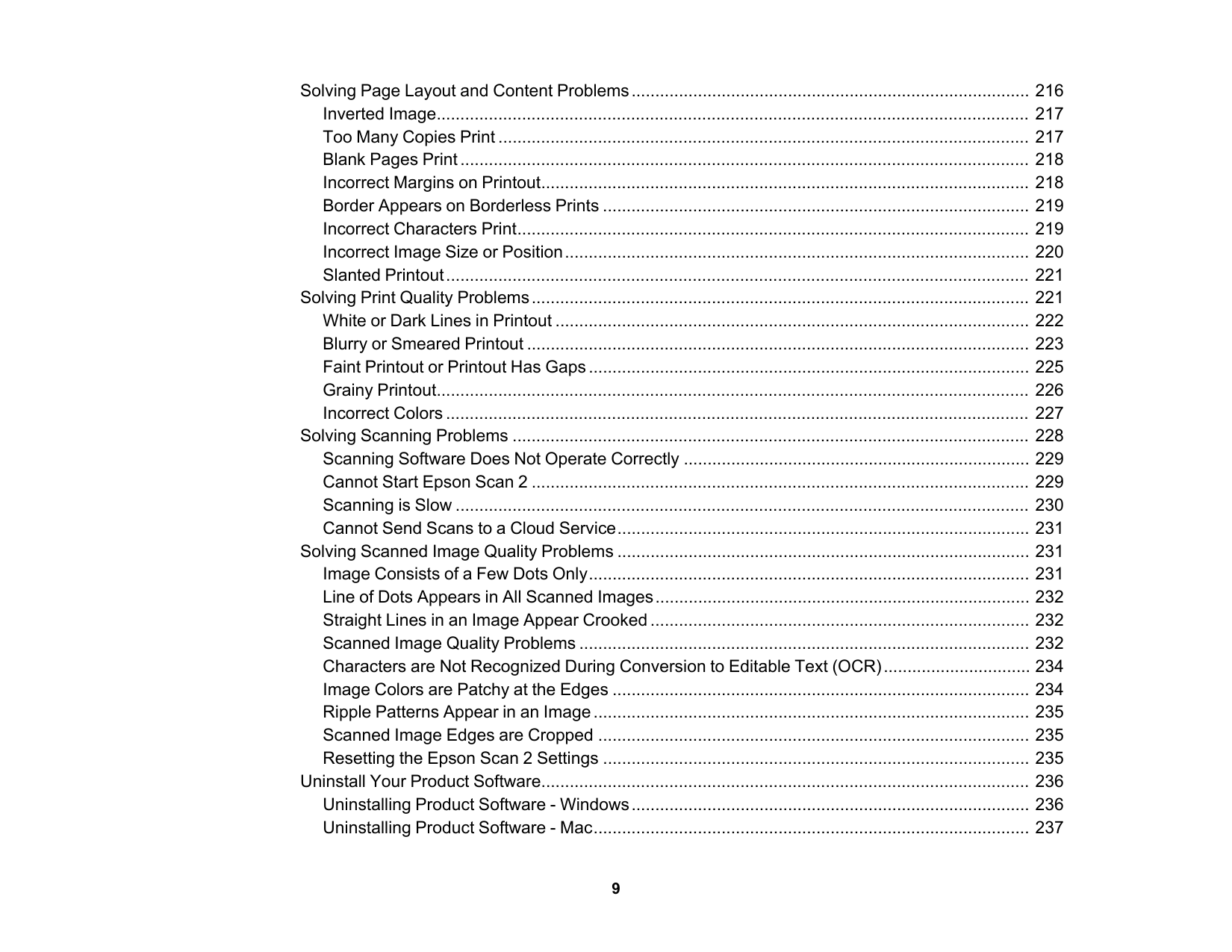9 Solving Page Layout and Content Problems.................................................................................... 216 Inverted Image............................................................................................................................. 217 Too Many Copies Print ................................................................................................................ 217 Blank Pages Print........................................................................................................................ 218 Incorrect Margins on Printout....................................................................................................... 218 Border Appears on Borderless Prints .......................................................................................... 219 Incorrect Characters Print............................................................................................................ 219 Incorrect Image Size or Position.................................................................................................. 220 Slanted Printout........................................................................................................................... 221 Solving Print Quality Problems......................................................................................................... 221 White or Dark Lines in Printout .................................................................................................... 222 Blurry or Smeared Printout .......................................................................................................... 223 Faint Printout or Printout Has Gaps............................................................................................. 225 Grainy Printout............................................................................................................................. 226 Incorrect Colors ........................................................................................................................... 227 Solving Scanning Problems ............................................................................................................. 228 Scanning Software Does Not Operate Correctly ......................................................................... 229 Cannot Start Epson Scan 2 ......................................................................................................... 229 Scanning is Slow ......................................................................................................................... 230 Cannot Send Scans to a Cloud Service....................................................................................... 231 Solving Scanned Image Quality Problems ....................................................................................... 231 Image Consists of a Few Dots Only............................................................................................. 231 Line of Dots Appears in All Scanned Images............................................................................... 232 Straight Lines in an Image Appear Crooked ................................................................................ 232 Scanned Image Quality Problems ............................................................................................... 232 Characters are Not Recognized During Conversion to Editable Text (OCR)............................... 234 Image Colors are Patchy at the Edges ........................................................................................ 234 Ripple Patterns Appear in an Image............................................................................................ 235 Scanned Image Edges are Cropped ........................................................................................... 235 Resetting the Epson Scan 2 Settings .......................................................................................... 235 Uninstall Your Product Software....................................................................................................... 236 Uninstalling Product Software - Windows.................................................................................... 236 Uninstalling Product Software - Mac............................................................................................ 237