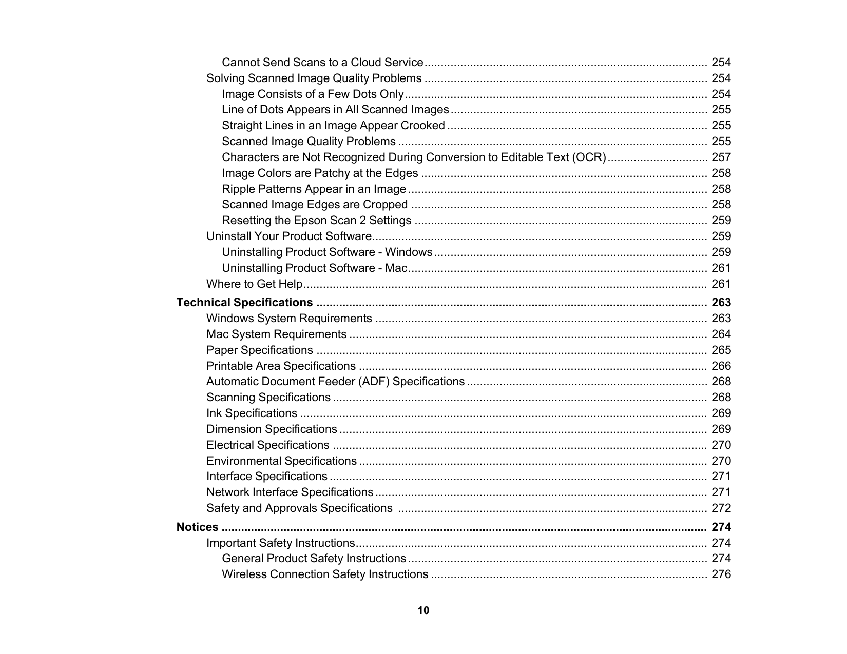 10 Cannot Send Scans to a Cloud Service....................................................................................... 254 Solving Scanned Image Quality Problems ....................................................................................... 254 Image Consists of a Few Dots Only............................................................................................. 254 Line of Dots Appears in All Scanned Images............................................................................... 255 Straight Lines in an Image Appear Crooked ................................................................................ 255 Scanned Image Quality Problems ............................................................................................... 255 Characters are Not Recognized During Conversion to Editable Text (OCR)............................... 257 Image Colors are Patchy at the Edges ........................................................................................ 258 Ripple Patterns Appear in an Image............................................................................................ 258 Scanned Image Edges are Cropped ........................................................................................... 258 Resetting the Epson Scan 2 Settings .......................................................................................... 259 Uninstall Your Product Software....................................................................................................... 259 Uninstalling Product Software - Windows.................................................................................... 259 Uninstalling Product Software - Mac............................................................................................ 261 Where to Get Help............................................................................................................................ 261 Technical Specifications ........................................................................................................................ 263 Windows System Requirements ...................................................................................................... 263 Mac System Requirements .............................................................................................................. 264 Paper Specifications ........................................................................................................................ 265 Printable Area Specifications ........................................................................................................... 266 Automatic Document Feeder (ADF) Specifications.......................................................................... 268 Scanning Specifications ................................................................................................................... 268 Ink Specifications ............................................................................................................................. 269 Dimension Specifications ................................................................................................................. 269 Electrical Specifications ................................................................................................................... 270 Environmental Specifications ........................................................................................................... 270 Interface Specifications .................................................................................................................... 271 Network Interface Specifications...................................................................................................... 271 Safety and Approvals Specifications ............................................................................................... 272 Notices ..................................................................................................................................................... 274 Important Safety Instructions............................................................................................................ 274 General Product Safety Instructions............................................................................................ 274 Wireless Connection Safety Instructions ..................................................................................... 276