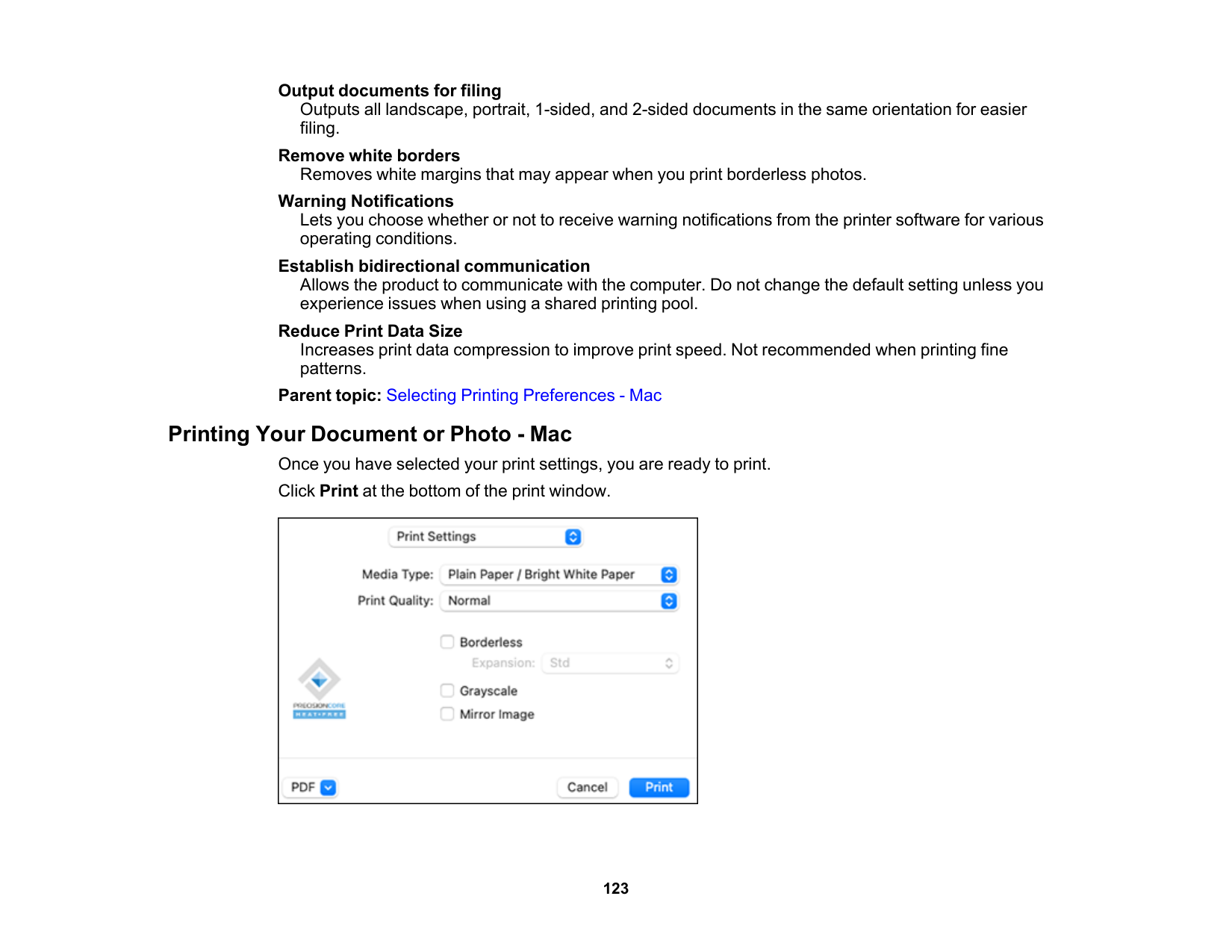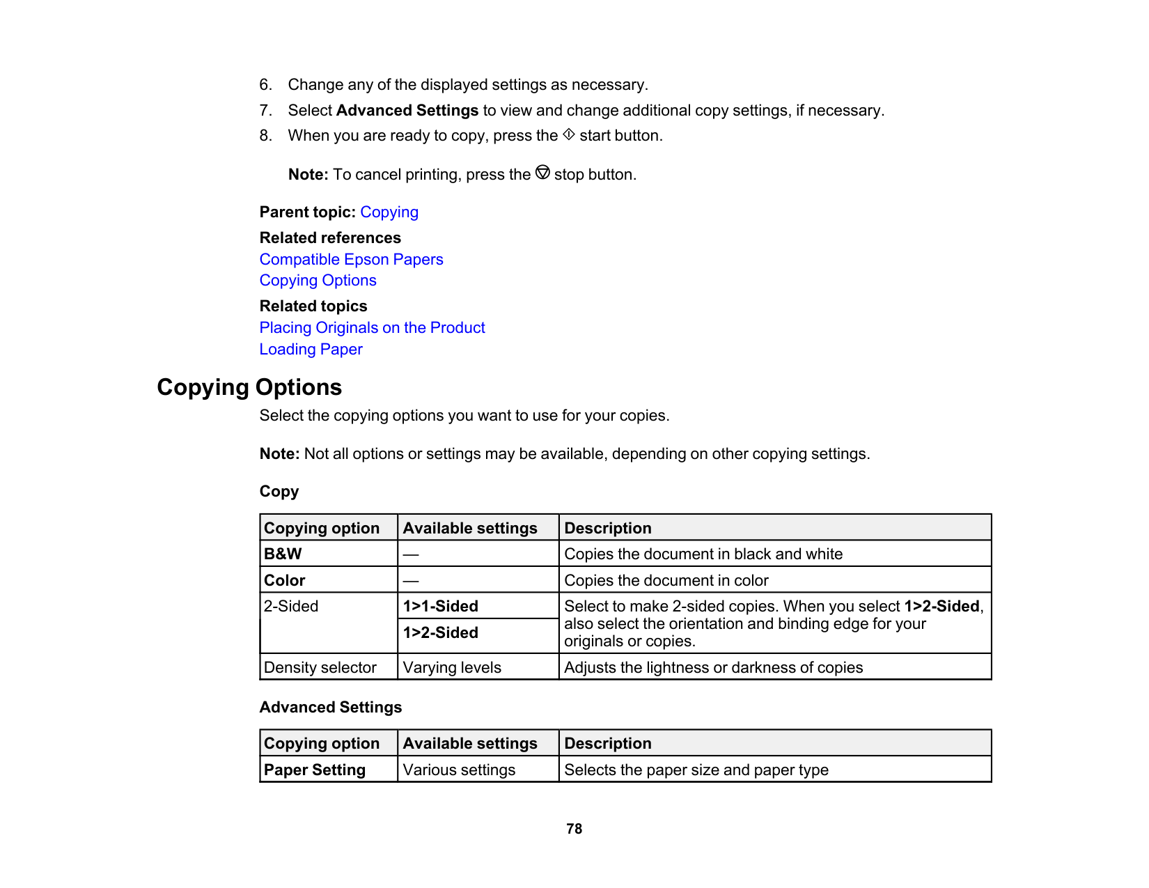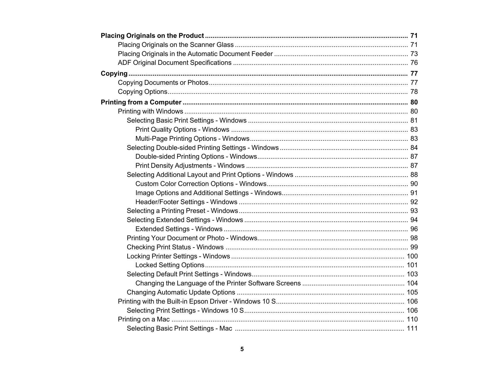 5 Placing Originals on the Product ............................................................................................................. 71 Placing Originals on the Scanner Glass ............................................................................................. 71 Placing Originals in the Automatic Document Feeder ........................................................................ 73 ADF Original Document Specifications .............................................................................................. 76 Copying...................................................................................................................................................... 77 Copying Documents or Photos........................................................................................................... 77 Copying Options................................................................................................................................. 78 Printing from a Computer ......................................................................................................................... 80 Printing with Windows ........................................................................................................................ 80 Selecting Basic Print Settings - Windows ...................................................................................... 81 Print Quality Options - Windows ............................................................................................... 83 Multi-Page Printing Options - Windows..................................................................................... 83 Selecting Double-sided Printing Settings - Windows..................................................................... 84 Double-sided Printing Options - Windows................................................................................. 87 Print Density Adjustments - Windows ....................................................................................... 87 Selecting Additional Layout and Print Options - Windows ............................................................. 88 Custom Color Correction Options - Windows............................................................................ 90 Image Options and Additional Settings - Windows.................................................................... 91 Header/Footer Settings - Windows ........................................................................................... 92 Selecting a Printing Preset - Windows........................................................................................... 93 Selecting Extended Settings - Windows ........................................................................................ 94 Extended Settings - Windows ................................................................................................... 96 Printing Your Document or Photo - Windows................................................................................. 98 Checking Print Status - Windows .................................................................................................. 99 Locking Printer Settings - Windows ............................................................................................. 100 Locked Setting Options........................................................................................................... 101 Selecting Default Print Settings - Windows.................................................................................. 103 Changing the Language of the Printer Software Screens ....................................................... 104 Changing Automatic Update Options .......................................................................................... 105 Printing with the Built-in Epson Driver - Windows 10 S..................................................................... 106 Selecting Print Settings - Windows 10 S...................................................................................... 106 Printing on a Mac ............................................................................................................................. 110 Selecting Basic Print Settings - Mac ........................................................................................... 111